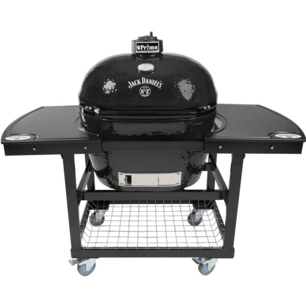 Primo Jack Daniels Edition Oval XL 400 Ceramic Kamado Grill On Steel Cart With 1-Piece Island Side Shelves, Cup Holders, and Stainless Steel Grates – 900