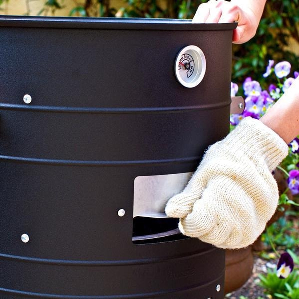 Chimney-like design with a loose-fitting, vented lid and tight-fitting doors creates a constant flow of new smoke for maximum flavor. Smoke flow may be minimized, without extinguishing the smoking source, by shutting all vents and only allowing smoke to vent around hood perimeter. Slow cooking feature allows for maximum flavor and moisture, perfecting a juicy and tender product with less effort.