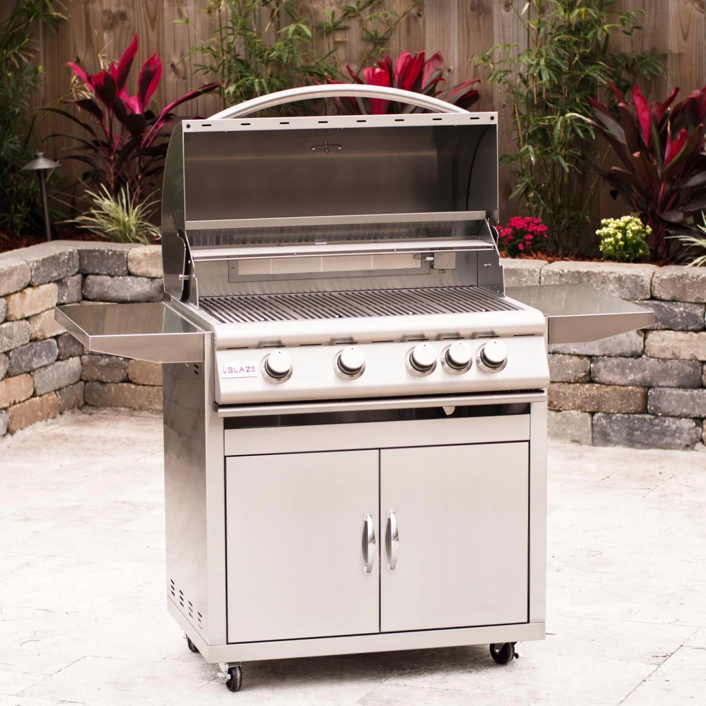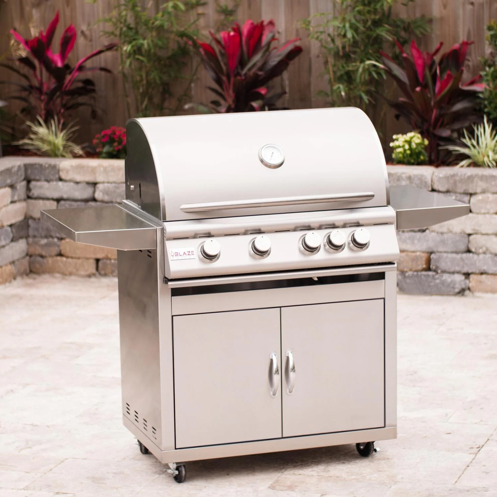 Blaze introduces an affordable commercial style grill that was designed with your outdoor BBQ challenges in mind. This Blaze 32-inch freestanding gas grill comes with four (4) commercial quality 304 cast stainless steel burners that each deliver an impressive 14,000 BTUs of cooking power, for a total of 56,000 BTUs on the cooking surface. The 10,000 BTU infrared rear burner works great with the optional rotisserie kit for grilling versatility. Durable 8mm stainless steel cooking rods maximize your searing capability on the spacious 748 square inches of cooking space. Push and turn flame-thrower primary ignition, backup flash tube secondary ignition and cross-tubes ensure a steady, reliable flame with every start. The removable warming rack is an ideal place to keep bread and other food heated while you grill. The stainless steel heat zone separators allow for different cooking zones across the grilling surface. This adds to your grilling experience, creating separate zones that can be used for different styles of cooking. The flame stabilizing grid minimizes flare-ups while you enjoy your Blaze grill and the full-width drip tray makes clean up a breeze. The stainless steel grill cart features two front doors for storing your tank, grill cover and BBQ accessories. The cart also includes four heavy duty caster wheels, allowing you to relocate the grill easily whenever necessary, and two side shelves for a convenient work area. The 304 stainless steel grill hood is double-lined to protect the outer layer from heat discoloration, keeping your Blaze grill looking shiny and new! This product is ETL certified with an ANSI Z21.58-2018/CSA 1.6 rating.
