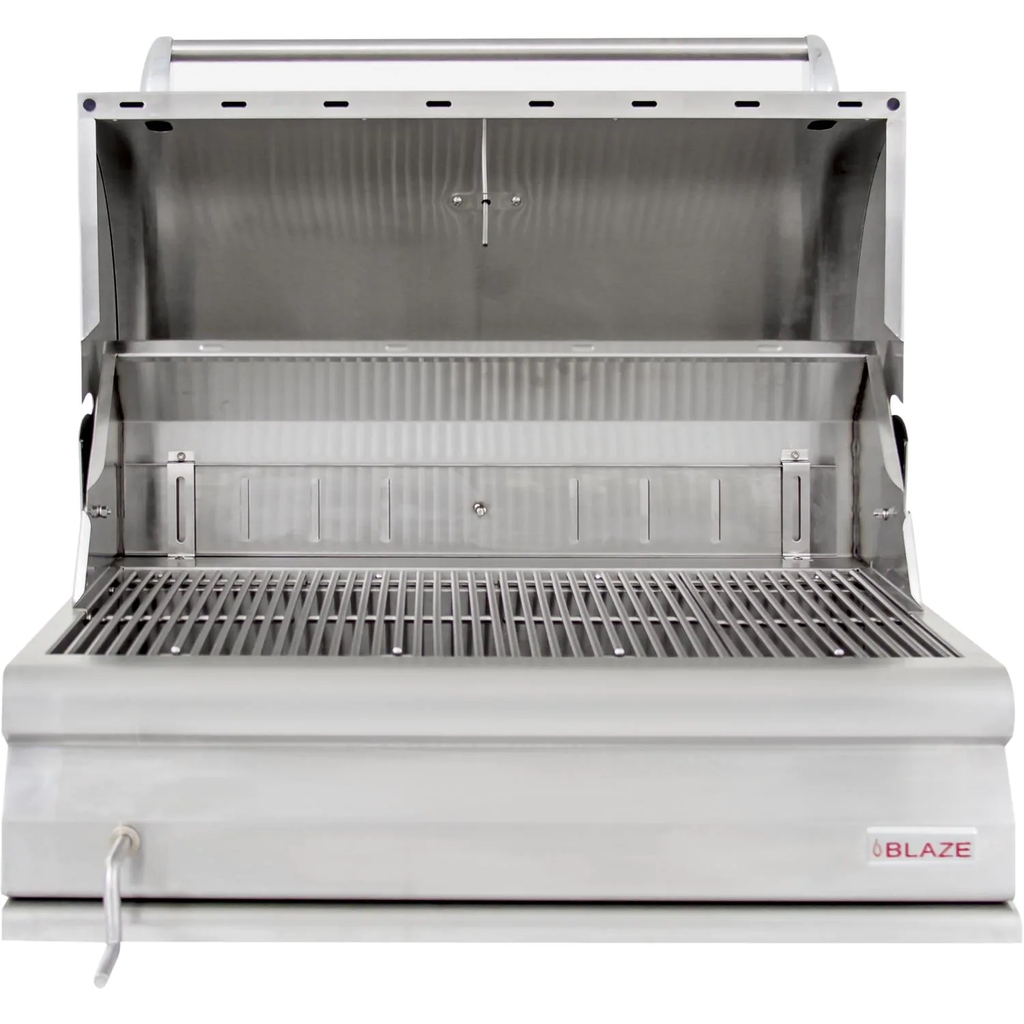 Blaze offers an affordable, commercial style charcoal grill designed with your outdoor BBQ desires in mind. This American-made charcoal grill features precision cut, 304 stainless steel components which bring the promise of lasting durability to your outdoor BBQ! The stainless steel rod cooking grates maximize searing capability on the generous 550 square inches of cooking space. The cooking grates feature an easy hook and hang system for adding more charcoal or wood while cooking. Use one of the included two grill hooks to simply lift the grate and hook it to the top of the grill when adding more charcoal. Beneath the cooking grates, the adjustable charcoal tray offers powerful grilling versatility, allowing you to easily raise the tray when searing at high temperatures or move it down for low temperature cooking. The rear vents are adjustable for more control over the airflow. The charcoal tray is also removable and the full-width pull out ash pan makes cleaning a breeze. The 304 stainless steel grill hood is double-lined to protect the outer layer from heat discoloration, keeping your Blaze charcoal grill looking shiny and new!