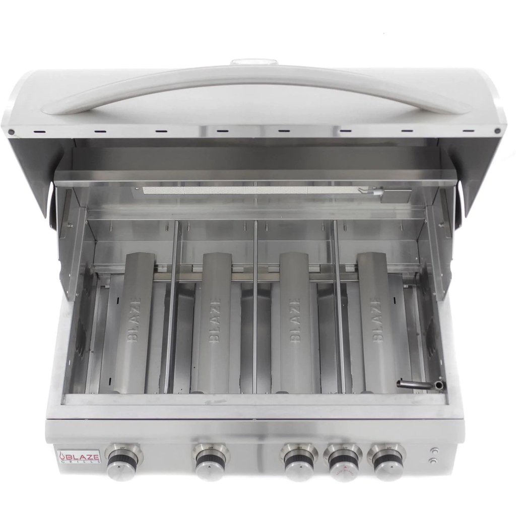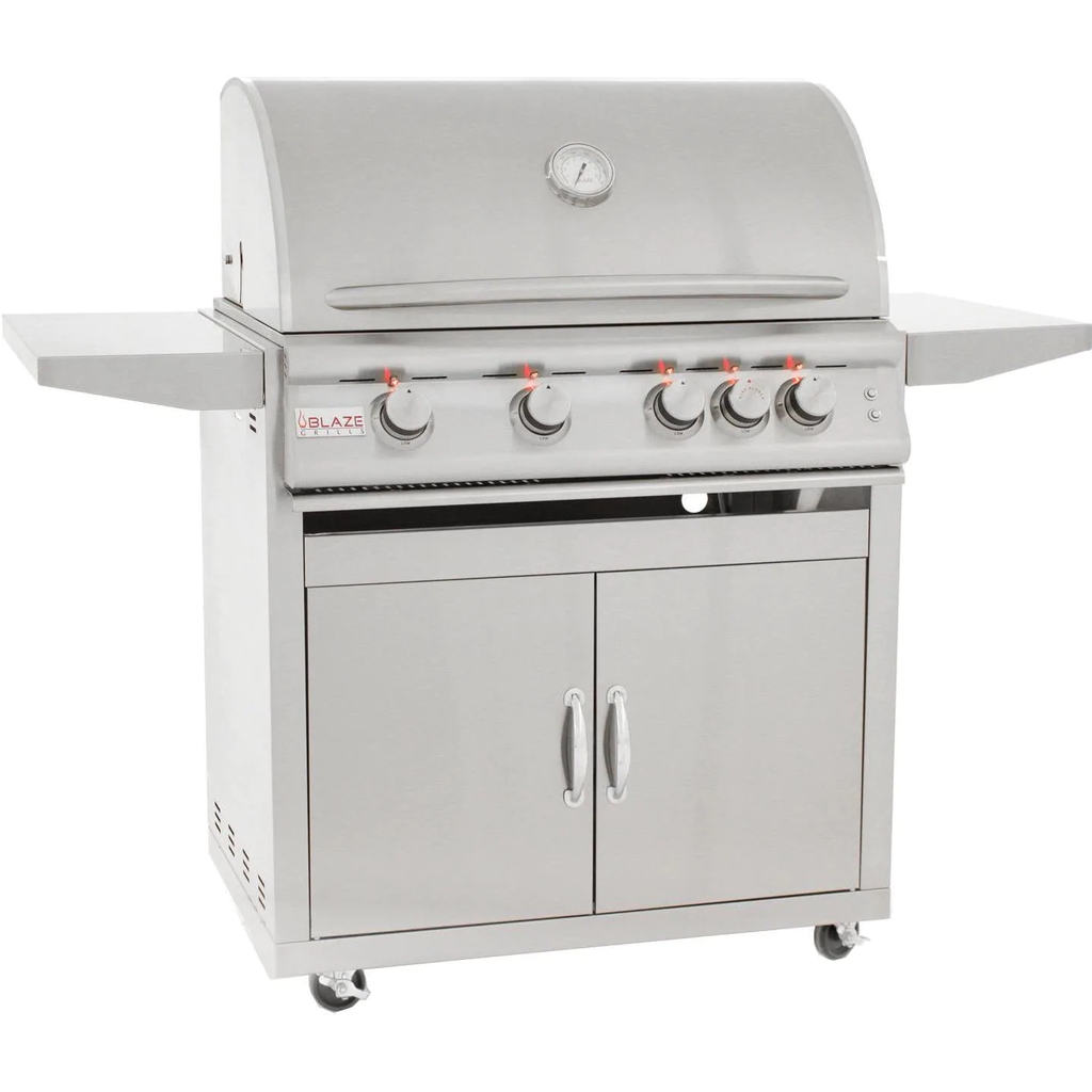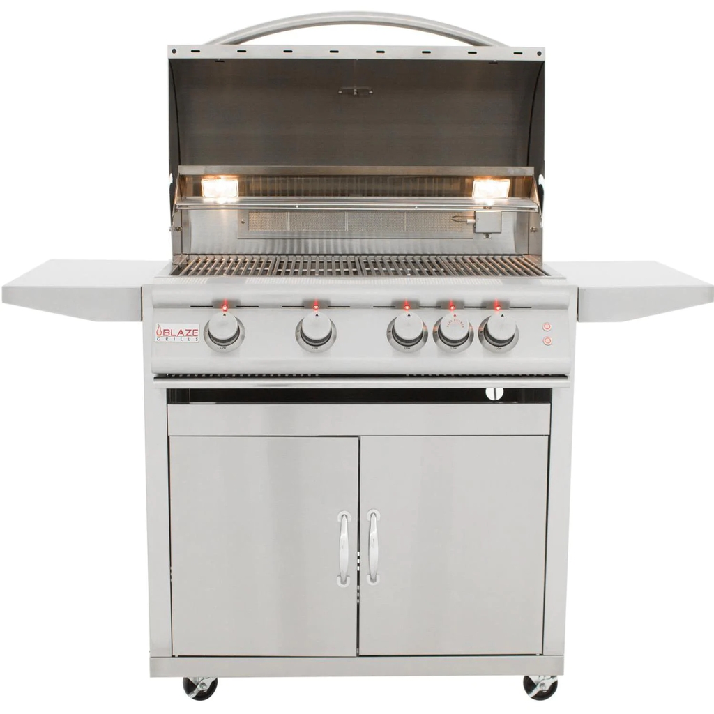 Blaze introduces an affordable commercial style grill that was designed with your outdoor BBQ challenges in mind. The LTE series takes things to the next level with a signature SRL LED accent lights and integrated halogen hood lighting. The Blaze 32-inch freestanding gas grill comes with four (4) commercial quality 304 cast stainless steel burners that each deliver an impressive 14,000 BTUs of cooking power, for a total of 56,000 BTUs on the cooking surface. The 10,000 BTU infrared rear burner works great with the optional rotisserie kit for grilling versatility. Durable patent-pending triangle-shaped stainless steel cooking rods maximize your searing capability on the spacious 748 square inches of cooking space. Push and turn flame-thrower primary ignition, backup flash tube secondary ignition and cross-tubes ensure a steady, reliable flame with every start. The removable warming rack is an ideal place to keep bread and other food heated while you grill. The stainless steel heat zone separators allow for different cooking zones across the grilling surface. This adds to your grilling experience, creating separate zones that can be used for different styles of cooking. The flame stabilizing grid minimizes flare-ups while you enjoy your Blaze grill and the full-width drip tray makes clean up a breeze. Interior grill lights along with the signature red LED knob illumination system help you grill and entertain at night. Interior grill lights along with the signature red LED knob illumination system help you grill and entertain at night. The stainless steel grill cart features two front doors for storing your tank, grill cover and BBQ accessories. The cart also includes four heavy duty caster wheels, allowing you to relocate the grill easily whenever necessary, and two side shelves for a convenient work area. The 304 stainless steel grill hood is double-lined to protect the outer layer from heat discoloration, keeping your Blaze grill looking shiny and new! Please note that a 110V power source is required. This product is ETL certified with an ANSI Z21.58-2018/CSA 1.6 rating.