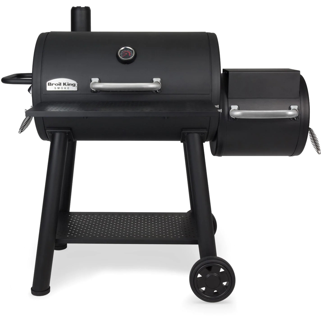 The Broil King Smoke Offset Smoker features 955 square inches total cooking space, heavy-duty cast iron cooking grids, two-dual purpose charcoal trays, removable ash trays and fully adjustable dampers.