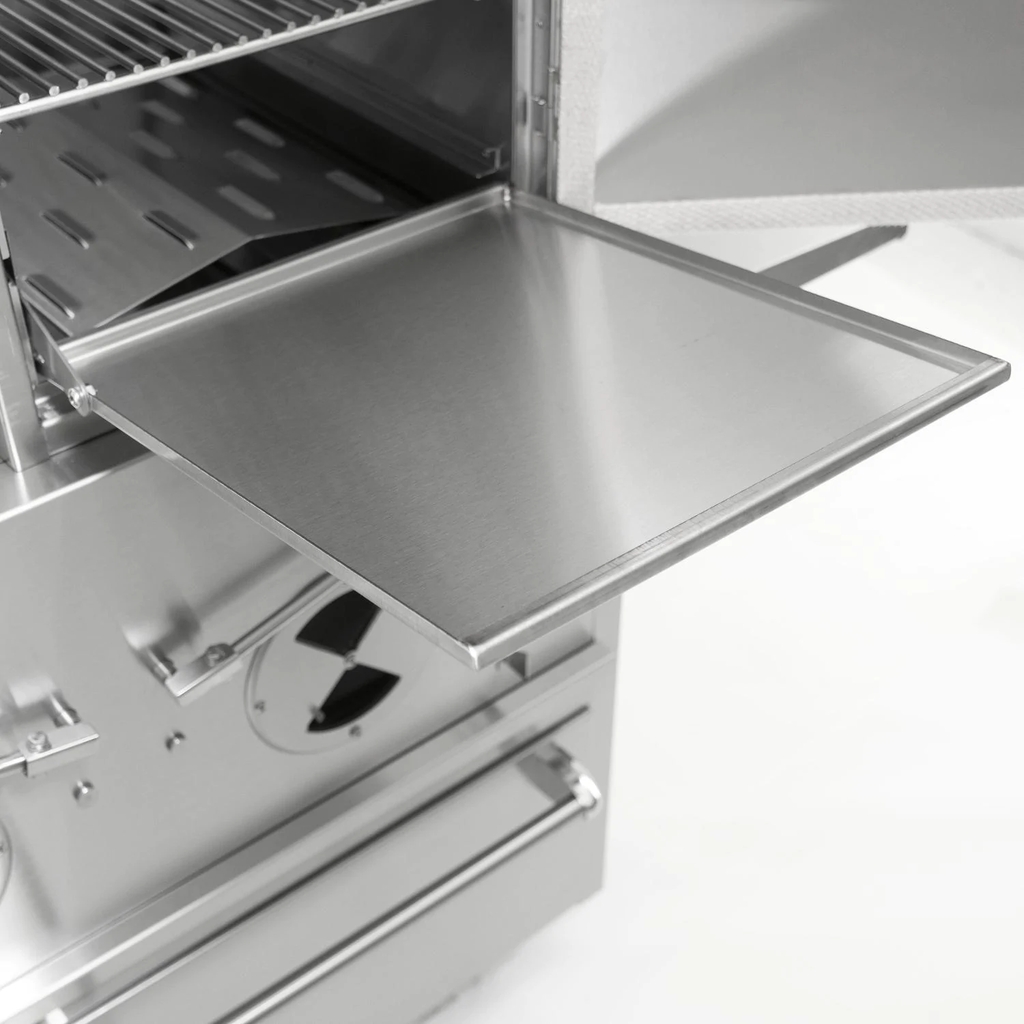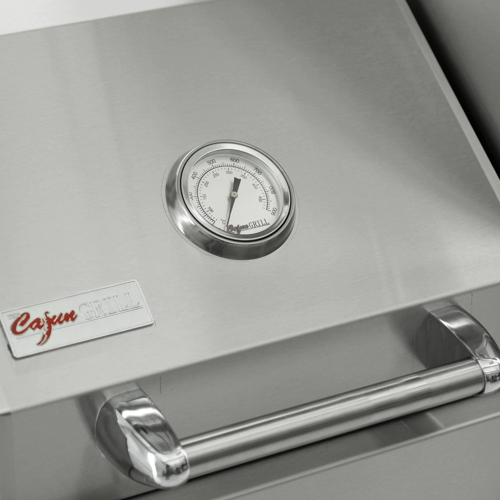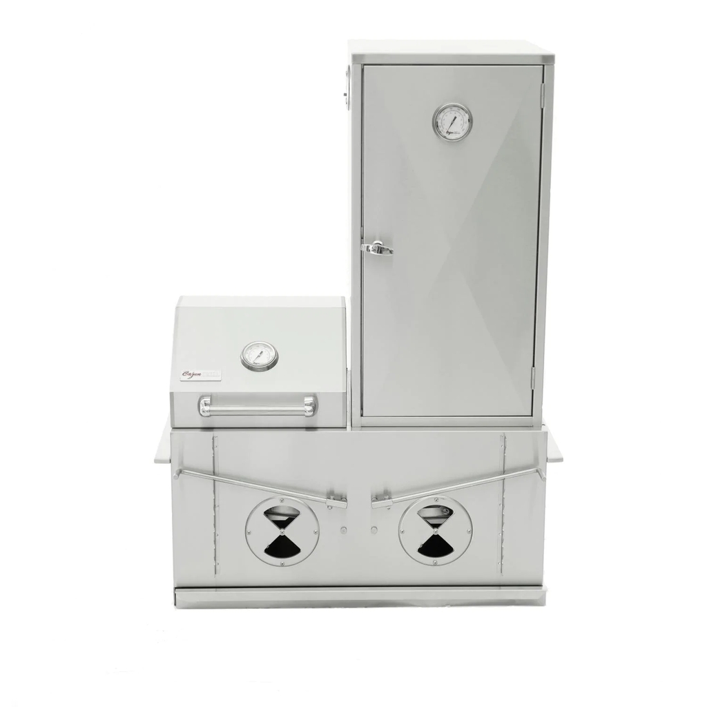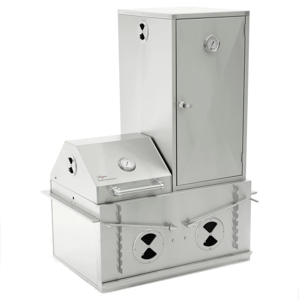 Cajun Grill exceeds strength and quality standards with their new vertical offset BBQ smoker. Featuring 16 gauge fully welded 304 stainless steel construction and double side walls, this smoker offers impressive heat retention, durability, and corrosion resistance in a shiny, modern package. The unique design of the smoker allows you to smoke or grill in either of its dual chambers. Two 12 gauge 304 stainless steel charcoal baskets can be adjusted by levers on the front of the smoker to choose independent cooking zones in each chamber. Additionally, the removable charcoal hopper can be used in either side to extend your cook and give you up to 16 hours of smoking time. The Combeaux Smoker comes with three 20 x 15-inch cooking grids and one 21 x 15-inch cooking grid that provide 1215 sq. inches of cooking surface, all electropolished steel for supreme corrosion resistance and longevity. Any of these grids can be placed into the smaller chamber or the large smoker cabinet. A fold away grease pan makes cleanup in the smoker tower convenient, as does a front access full-sized dustpan for collecting ash from the coal trays. Two front combustion dampers let you control airflow into each chamber, and one exhaust damper each on the hopper lid and smoker tower let you control airflow out. These combine with the two 3-inch dial thermometers, one on the hopper and one on the smoker tower, to make temperature control simple. Cajun Grill smokers and grills are made in the USA.