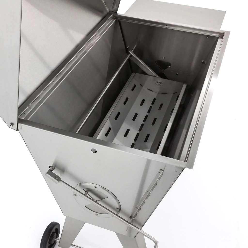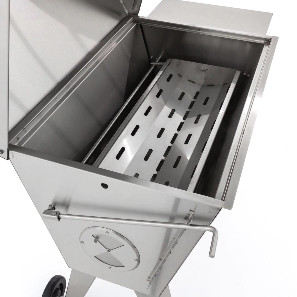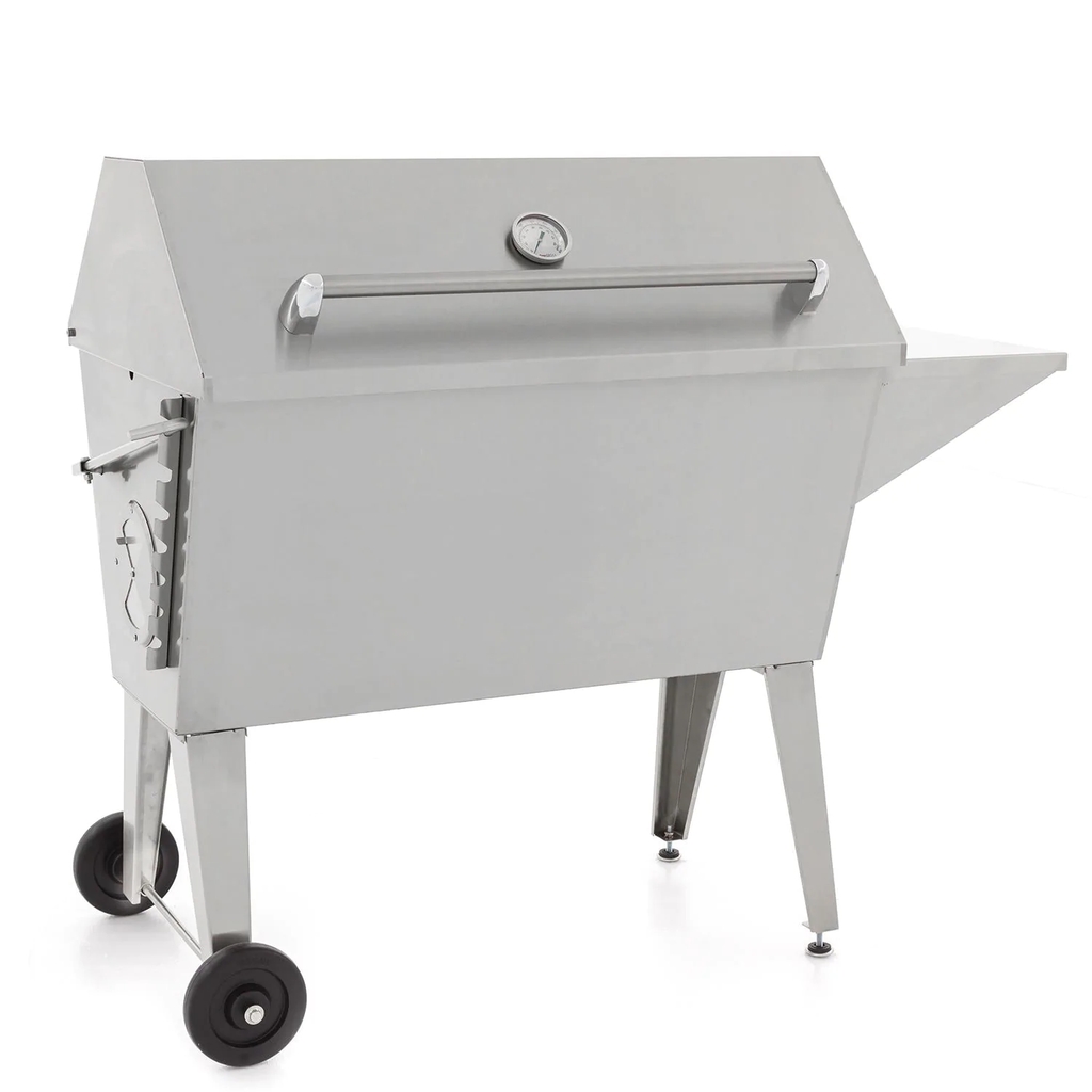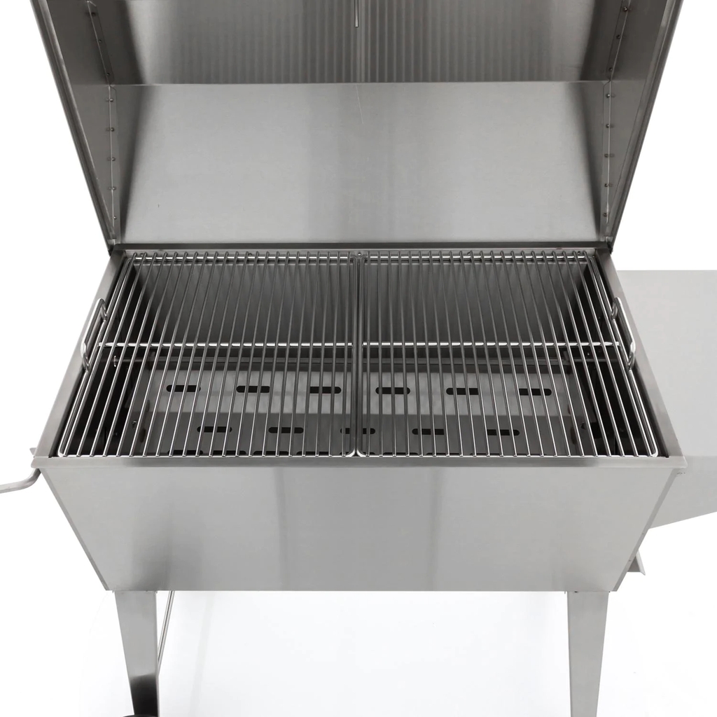 This charcoal grill features heavy-duty 16 gauge 304 stainless steel construction that is built to last for years to come. The cooking area measures 34 X 21 inches, allowing you to grill for the whole family or neighborhood. The cooking grates are constructed from 304 stainless steel and features easy lift handles on both sides for convenient adding of charcoal or wood while cooking. The adjustable 304 stainless steel charcoal basket gives you the ability to raise or lower the charcoal bed to suit your style of cooking. The front of the grill features a seven position control arm for easy raising or lowering of the charcoal basket. The v-shaped grill body directs heat evenly as it rises across the grilling surface. The adjustable air vents allow you to precisely manage cooking temperatures, whether you are smoking low and slow or grilling at higher temperatures. The removable stainless steel ash pan makes clean up an easy task. The stainless steel grill cart is equipped with solid polypropylene wheels for easy mobility and the built-in side shelf adds an additional working area for BBQ tools and grilling accessories. This charcoal grill is Proudly Made in the USA.