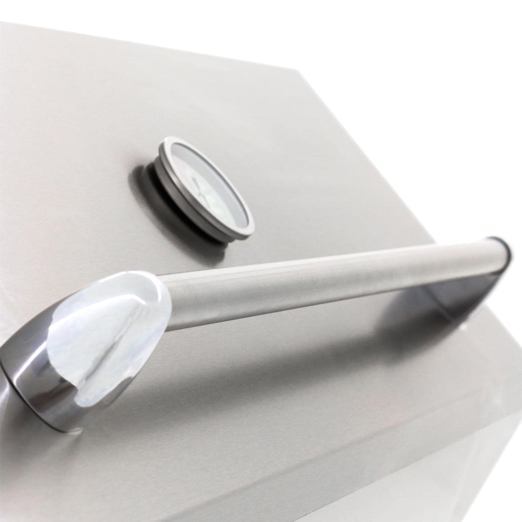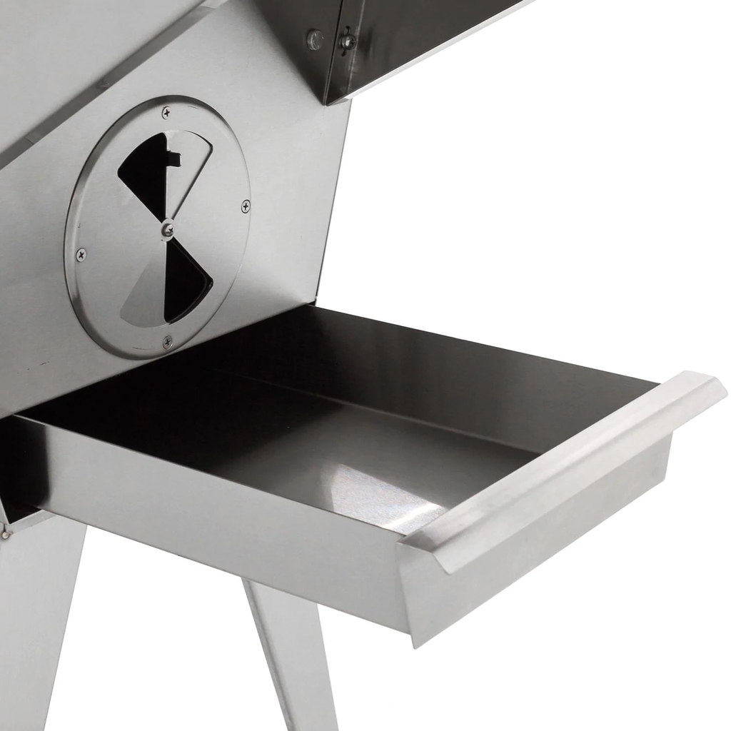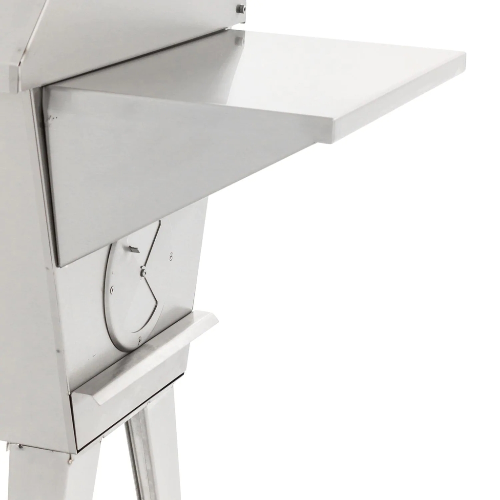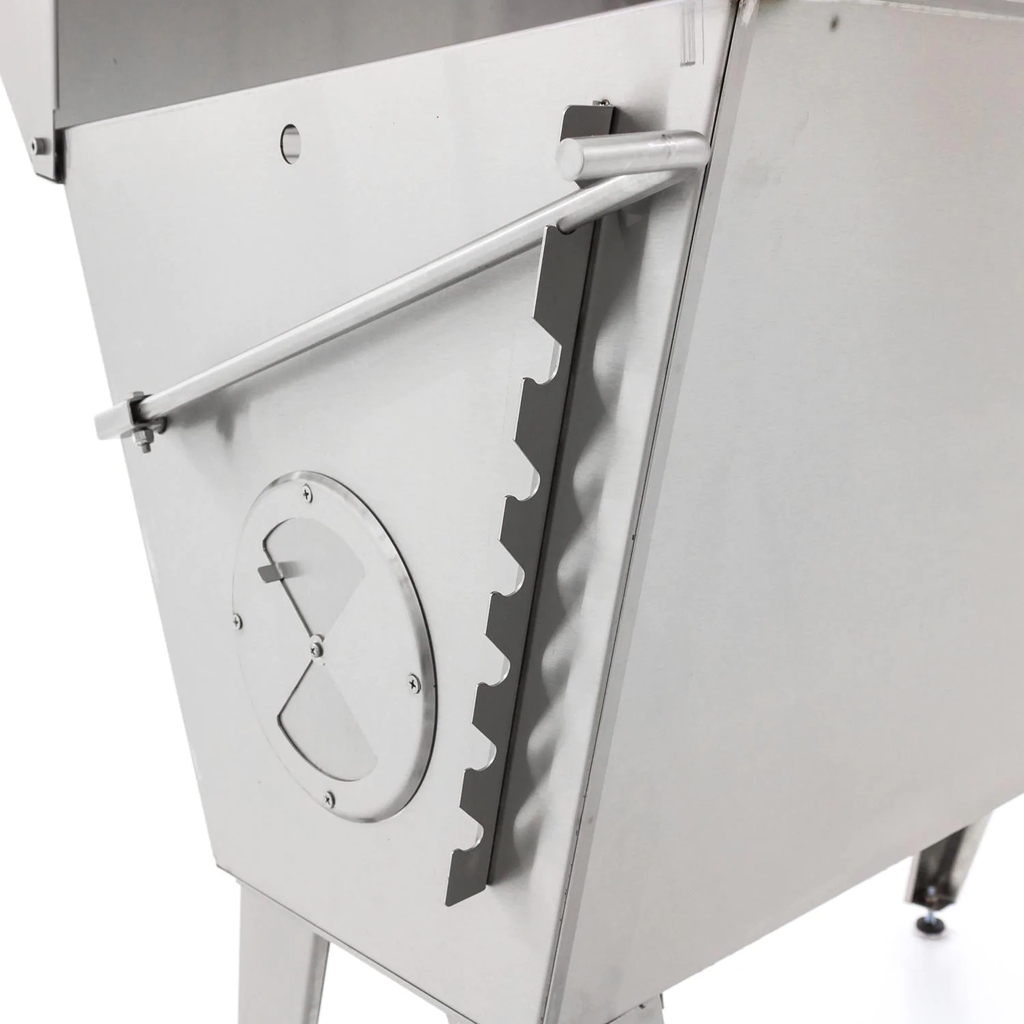This charcoal grill features heavy-duty 16 gauge 304 stainless steel construction that is built to last for years to come. The cooking area measures 34 X 21 inches, allowing you to grill for the whole family or neighborhood. The cooking grates are constructed from 304 stainless steel and features easy lift handles on both sides for convenient adding of charcoal or wood while cooking. The adjustable 304 stainless steel charcoal basket gives you the ability to raise or lower the charcoal bed to suit your style of cooking. The front of the grill features a seven position control arm for easy raising or lowering of the charcoal basket. The v-shaped grill body directs heat evenly as it rises across the grilling surface. The adjustable air vents allow you to precisely manage cooking temperatures, whether you are smoking low and slow or grilling at higher temperatures. The removable stainless steel ash pan makes clean up an easy task. The stainless steel grill cart is equipped with solid polypropylene wheels for easy mobility and the built-in side shelf adds an additional working area for BBQ tools and grilling accessories. This charcoal grill is Proudly Made in the USA.