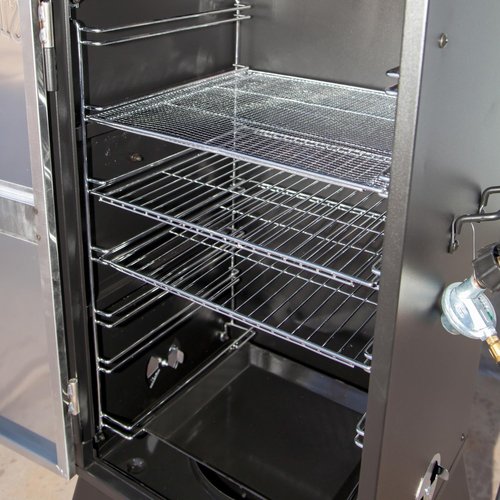 - Two adjustable smoking racks and one jerky rack accommodate a variety of food