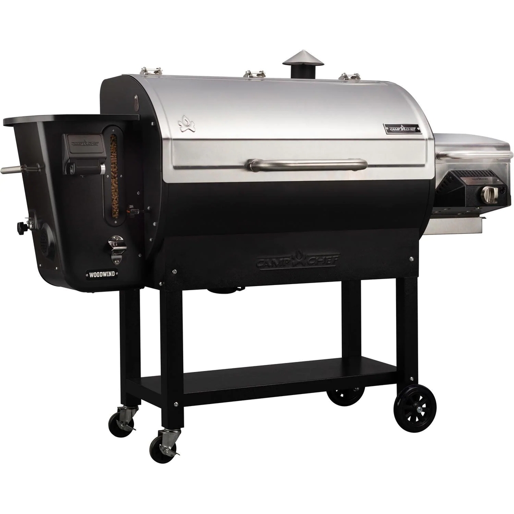 Take your grilling game to the next level with the Camp Chef Woodwind WiFi, featuring all of your favorite Woodwind series features, plus a full-color display, WiFi and Bluetooth-enabled PID controller that lets you control your cooks from the palm of your hand. Set temperatures, adjust smoke levels, set timers and even receive notifications when your meat reaches desired temperature using the Camp Chef Connect app on your mobile device. With the turn of a knob or tap of a finger you can set temperatures as low as 160 degrees for smoking and up to 500 degrees for the perfect sear. Smart Smoke technology keeps your Camp Chef pellet grill within 15 degrees of your selected temperature. Adjust smoke intensity just as easily with 10 levels to choose from. The PID controller also allows you to connect and monitor up to 4 meat probes and grill temperatures simultaneously, it even has a built-in cover to protect the display when not in use. The Woodwind WiFi is constructed of durable powder coated steel with a stainless steel lid and fire box. It features a 19 1/2 by 34 inch enameled-steel primary cooking area and a 2-piece nickel plated upper rack for 1236 square inches of total cooking space, all heated by up to 25,000 BTUs of cooking power. The 2-piece upper rack is also height adjustable, giving you more room for taller food without having to completely remove the upper rack. The automatic auger dispenses pellets as needed from the high capacity hopper, which holds up to 22 pounds of pellets at once and has a viewing window and pellet purge feature for emptying or changing out pellets. The hopper even has a built-in bottle opener and a chord wrap for extra convenience. Slide and Grill technology allows you to switch between direct and indirect flame cooking with just the pull of a knob. A continuous fan insures that your grill stays evenly heated and smoky, so every bit of food is perfectly cooked. When you are done cooking, clean up is easy, thanks to the exclusive Camp Chef ash cleanout system. Simply pull open the trap door with the side knob and empty the ash cup underneath the grill. This grill also features a pair of large, heavy-duty wheels and a pair of swivel casters for easy rolling and maneuverability, and a powder coated steel bottom shelf. Includes 4 stainless steel meat probes. This Woodwind WiFi also includes a Sear Box, which is a stainless steel, 16,000 BTU propane side grill that can reach up to 900 degrees. The Sear Box features a 184 square inch enamel coated cast iron grate for the perfect sear and heat diffuser plates to turn the flame into infrared heat. A hose, regulator, and holding bracket are included for a 20-pound propane tank (tank not included).