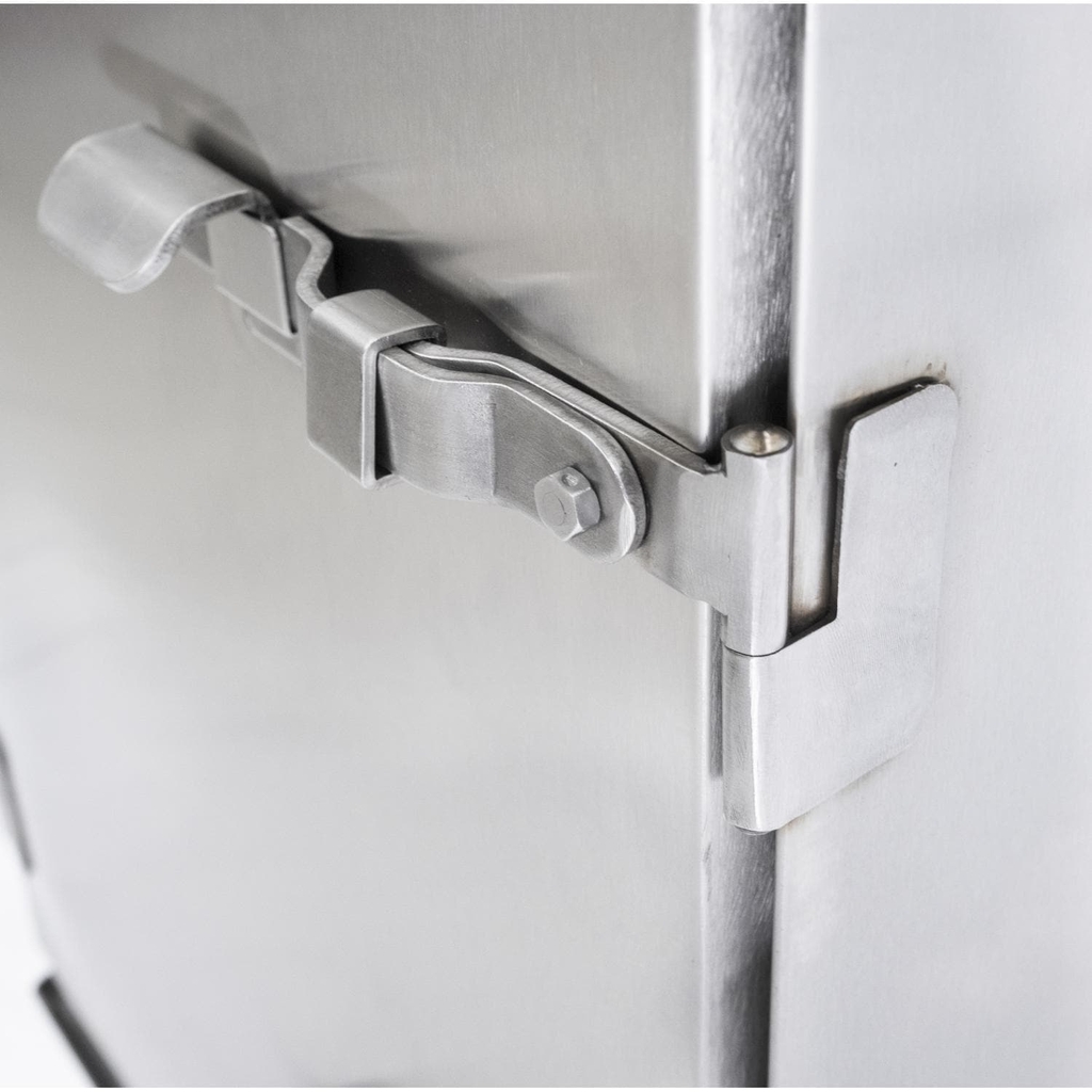 The Cookshack Super Smoker Elite Series Electric Smoker features stainless steel construction and 850 degree Spin-Glass insulation, keeping the internal temperatures consistent and the outside cool to the touch. Digital technology allows you to cook your meat at a temperature and time that you set. The Super Smoker Elite electronic controller allows smoke cooking by setting the desired cooking temperature and monitoring the internal meat temperature with its commercial quality meat temperature probe. The LED panel displays the cooking temperature and the internal meat temperature. Your electric smoker will arrive with everything you need to start smoking immediately including a meat probe for accurate internal temperature, three 18 x 14 inch nickel-plated shelves big enough to hold full slabs of ribs or whole briskets, five pounds of hickory wood, stainless steel fire box, four 3 inch locking casters, Smoking At Home cookbook with tried-and-true recipes, and an operators manual to get you up to speed fast. This Super Smoker Elite electric smoker has a 35 lb capacity and maximum smoking temperature range of 140 – 300 degrees. The smoker uses about 1 to 2 ounces of wood for every 60 pounds of food smoked. Each cooking grate has a vertical space of 5 1/2 inches. Smoker requires 7 amps/120V/750W. All Cookshack smokers are proudly made in the USA.