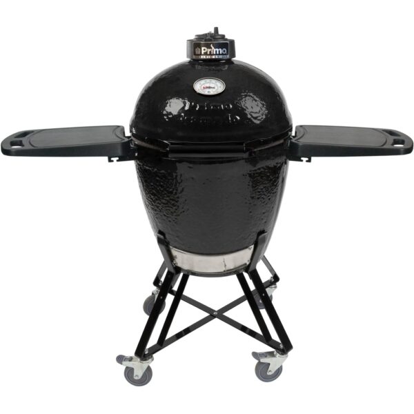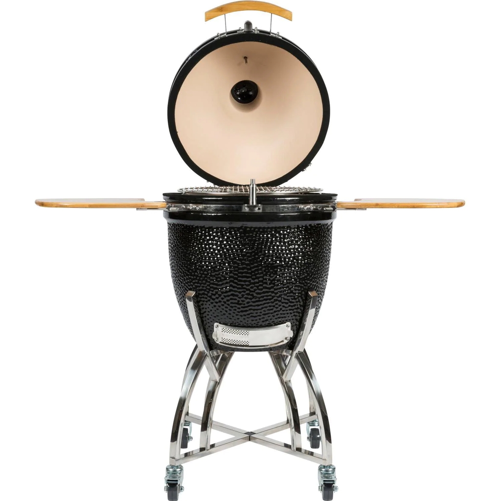 Designed for outdoor cooking enthusiasts who appreciate the flavor of charcoal grilling, the Asado grill from Coyote is a kamado-style grill that can grill, smoke or sear with ease. This grill is constructed from high grade ceramics which offer excellent heat retention, allowing you to cook at consistent temperatures for hours on end. The Asado grill offers 254 square inches of cooking area on a stainless steel grate. A dual-vent airflow system allows for precise control of cooking temperatures that can range from a smoking low, to a steak-searing high, maintaining temperatures for hours and requiring less fire tending than traditional smokers. Easily keep track of cooking temperatures with the integrated thermometer. This kamado grill includes a stainless steel cart with heavy-duty casters for easy mobility. Built-in folding wood side shelves allow you to keep serveware or grilling tools nearby while cooking. The Asado grill also includes an ash tool, ceramic feet for built-in installations, and touch-up paint.