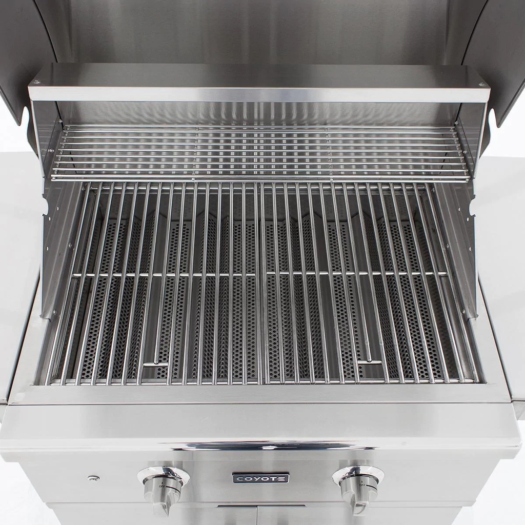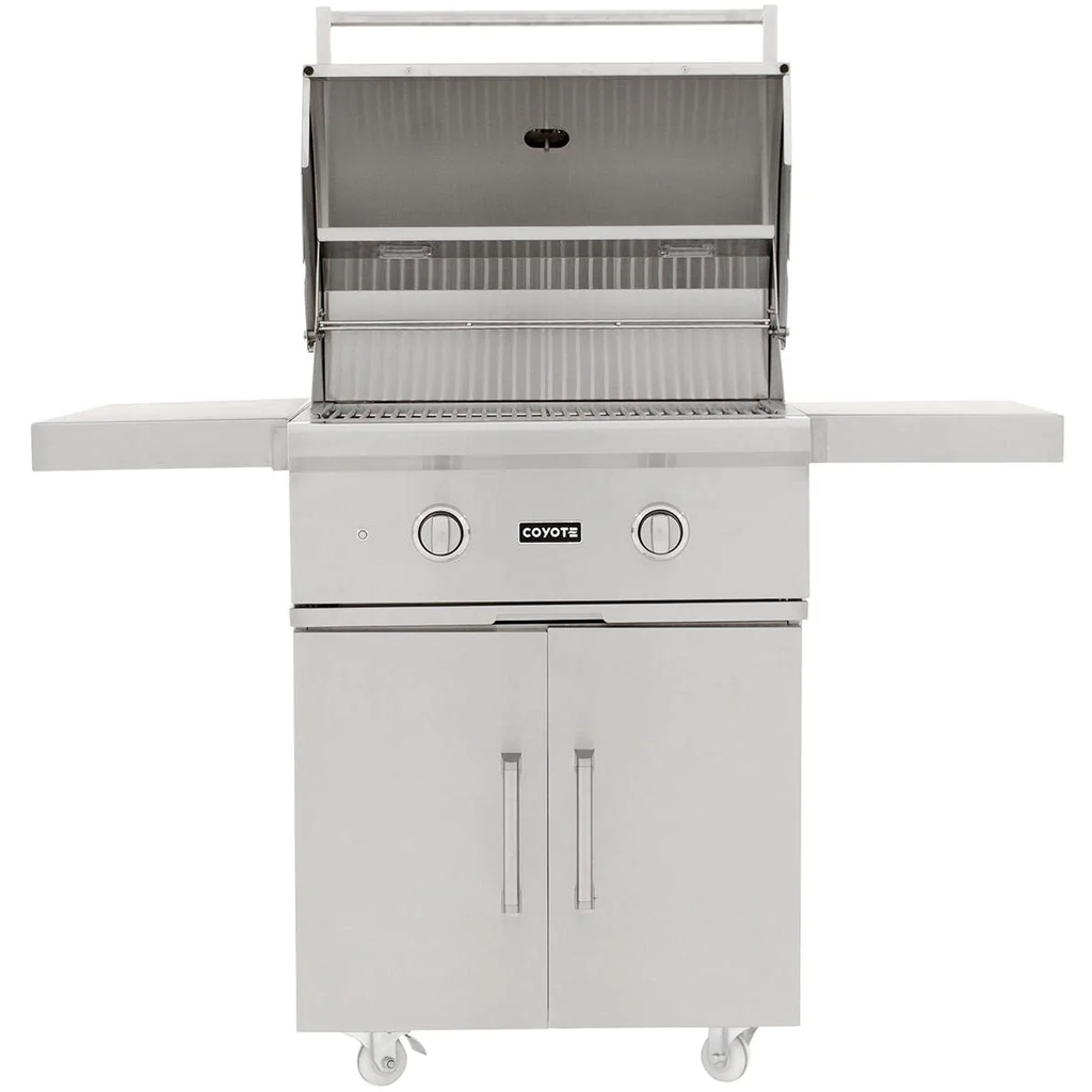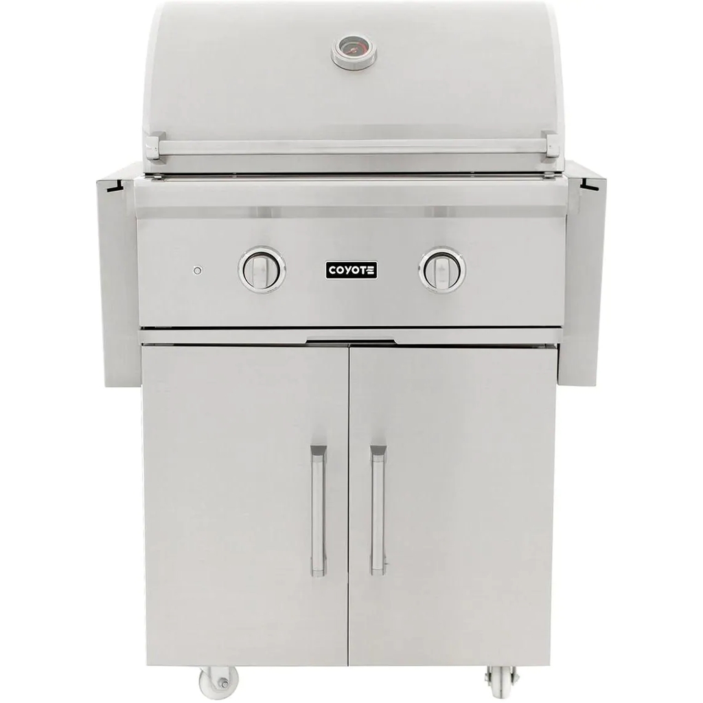 Merging durable design with professional-style grilling features, the Coyote C-Series gas grill will be the center point of your outdoor kitchen. This 28-inch freestanding gas grill is pre-assembled, so you can start grilling as soon as you get it out of the box. This grill also features 18 gauge 304 grade stainless steel construction with a double-walled canopy and continuously hand-welded grill box with seamless edges. The C1C28LP-FS gas grill offers stainless steel, performance enhancing heat control grids that minimize flare-ups and distribute heat evenly across the 497 square inch cooking area. This propane gas grill is powered by two, durable cast stainless steel Infinity burners which deliver up to 40,000 BTUs of cooking power. The burners are lit by an easy to use, push and turn ignition system while the internal halogen grill lights will keep you grilling into the night. Use the removable warming rack to keep food heated until serving time and easily monitor the temperature inside your grill using the integrated thermometer. The grill cart includes two, self closing doors for easy closures and fold down shelving which adds workspace to your grilling area. The double doors provide ample storage space for BBQ tools and grilling accessories. The cart also features industrial-style, locking wheel casters for portability and comes fully assembled so you can start cooking right away. Choose Coyote and create the outdoor kitchen of your dreams with a grill made to last and give remarkable performance.