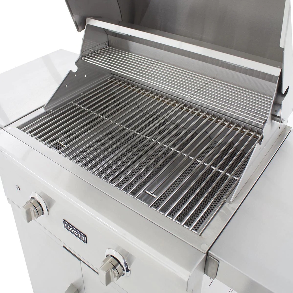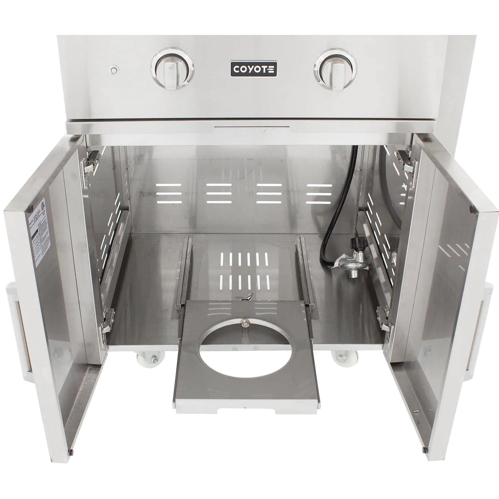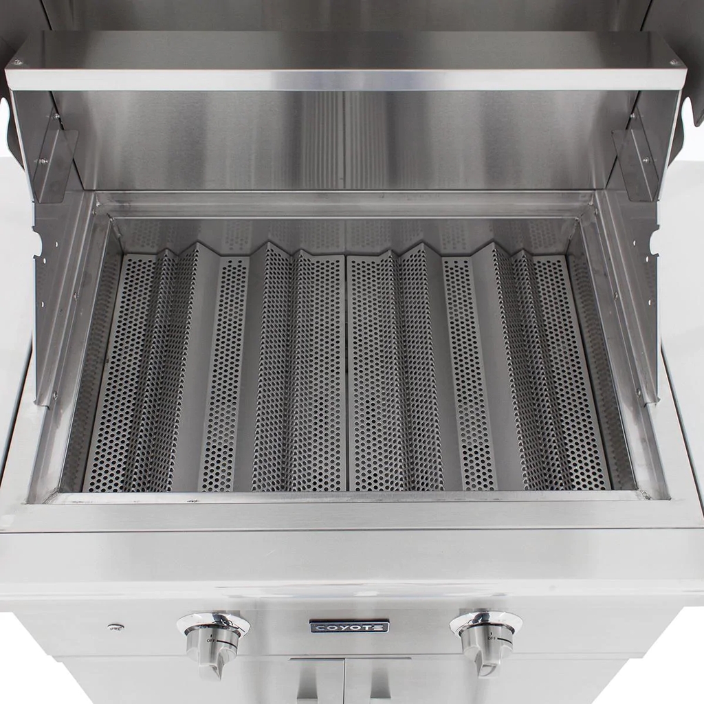 Merging durable design with professional-style grilling features, the Coyote C-Series gas grill will be the center point of your outdoor kitchen. This 28-inch freestanding gas grill is pre-assembled, so you can start grilling as soon as you get it out of the box. This grill also features 18 gauge 304 grade stainless steel construction with a double-walled canopy and continuously hand-welded grill box with seamless edges. The C1C28LP-FS gas grill offers stainless steel, performance enhancing heat control grids that minimize flare-ups and distribute heat evenly across the 497 square inch cooking area. This propane gas grill is powered by two, durable cast stainless steel Infinity burners which deliver up to 40,000 BTUs of cooking power. The burners are lit by an easy to use, push and turn ignition system while the internal halogen grill lights will keep you grilling into the night. Use the removable warming rack to keep food heated until serving time and easily monitor the temperature inside your grill using the integrated thermometer. The grill cart includes two, self closing doors for easy closures and fold down shelving which adds workspace to your grilling area. The double doors provide ample storage space for BBQ tools and grilling accessories. The cart also features industrial-style, locking wheel casters for portability and comes fully assembled so you can start cooking right away. Choose Coyote and create the outdoor kitchen of your dreams with a grill made to last and give remarkable performance.