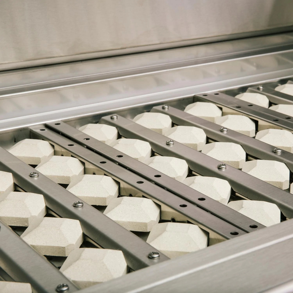 - Ceramic briquette trays distribute heat evenly across grilling surface