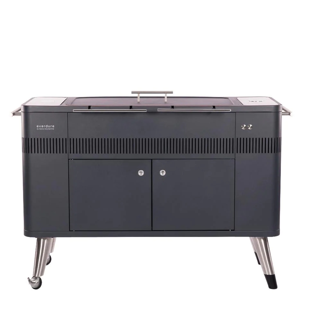 The Everdure HUB charcoal grill by Heston Blumenthal is great for outdoor grilling anywhere you want to be. The HUB series grills are made of powder-coated steel and have a Fast Flame Ignition System that, at the touch of a button, uses a heating element to ignite your charcoal and has you ready to start grilling in roughly 10 minutes. With the patent pending Rotiscope Technology rotisserie system, you get a built-in rotisserie that can be accessed by pressing and popping out the rotisserie support poles on the top of the grill and inserting the stowed rotisserie rod into them. The rotisserie includes ClipLock Forks that have a jaw-like design for keeping your food securely in place no matter if you are roasting a small chicken or a suckling pig. The rotisserie is capable of supporting up to 85 lbs and has 3 height settings. The built-in heat protection shield provides enhanced protection on any surface when grilling in almost any environments. Chrome hinged grill grates allow you to easily access the porcelain enamel firebox for adding or redistributing the charcoal and the porcelain enamel charcoal tray allows for easy charcoal removal. A 59-inch retractable power cord for long reach powering options and no clutter storing. Locking caster wheels allow you to keep your grill stable and secure. There is additional storage potential with a large area under the grill accessed with two double-lined doors. The modern and pleasing appearance of the Everdure Grills is inspired by minimalist Danish designs. HUB series grills stand on four legs, two with rolling casters, for enhanced mobility when pursuing your ideal grilling experience.