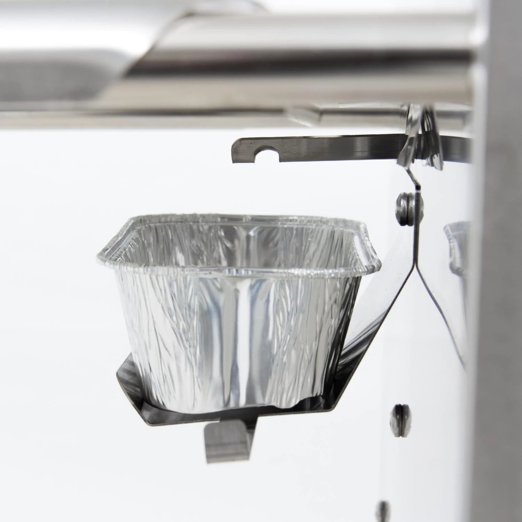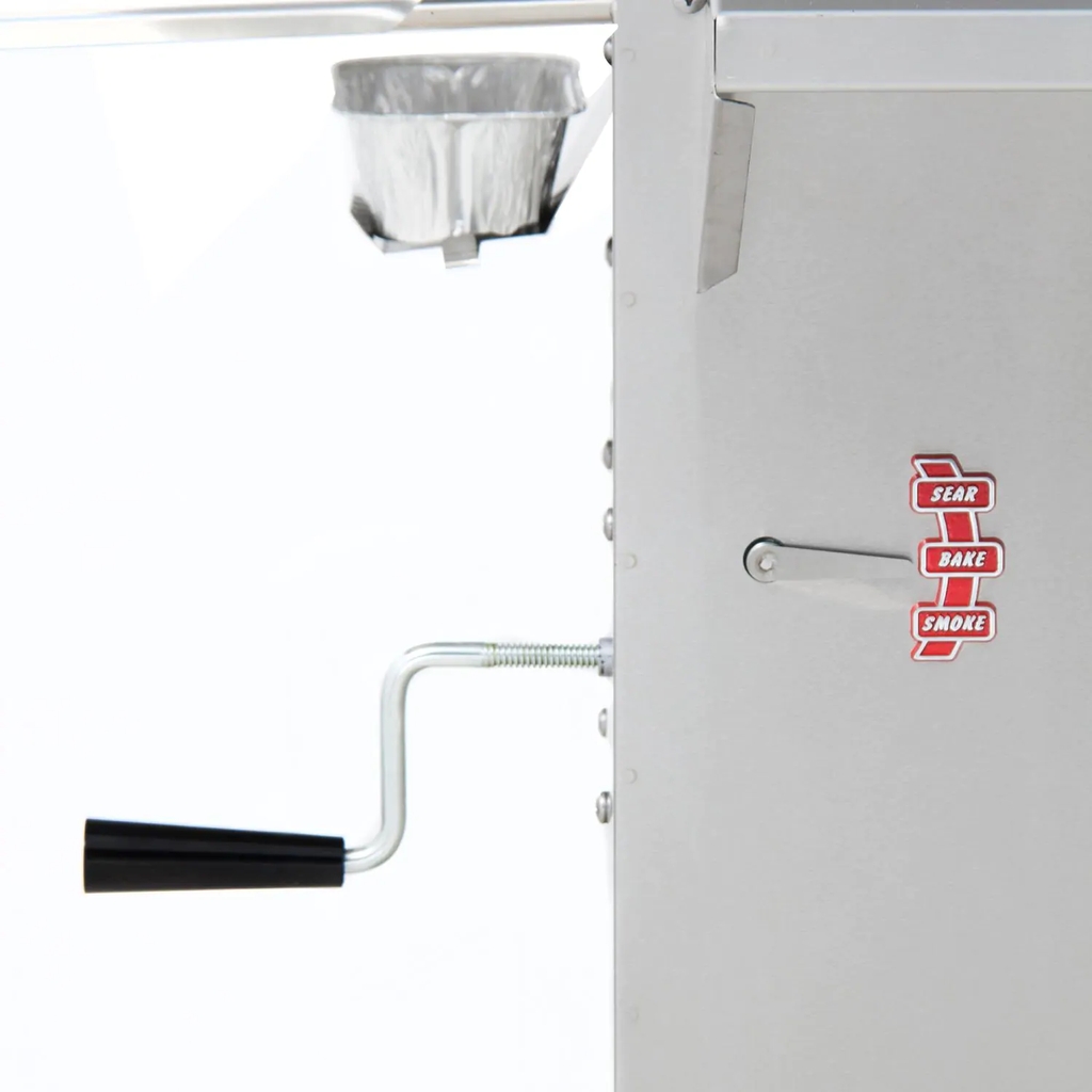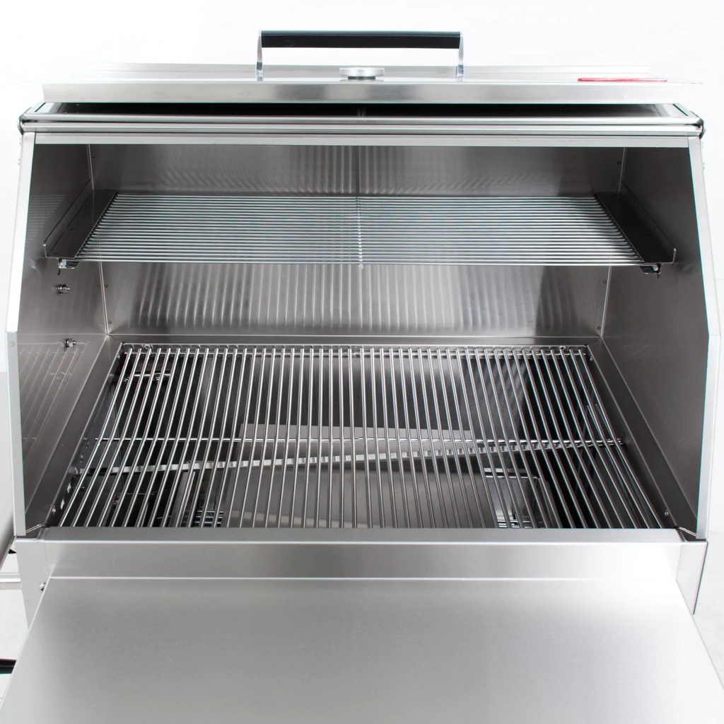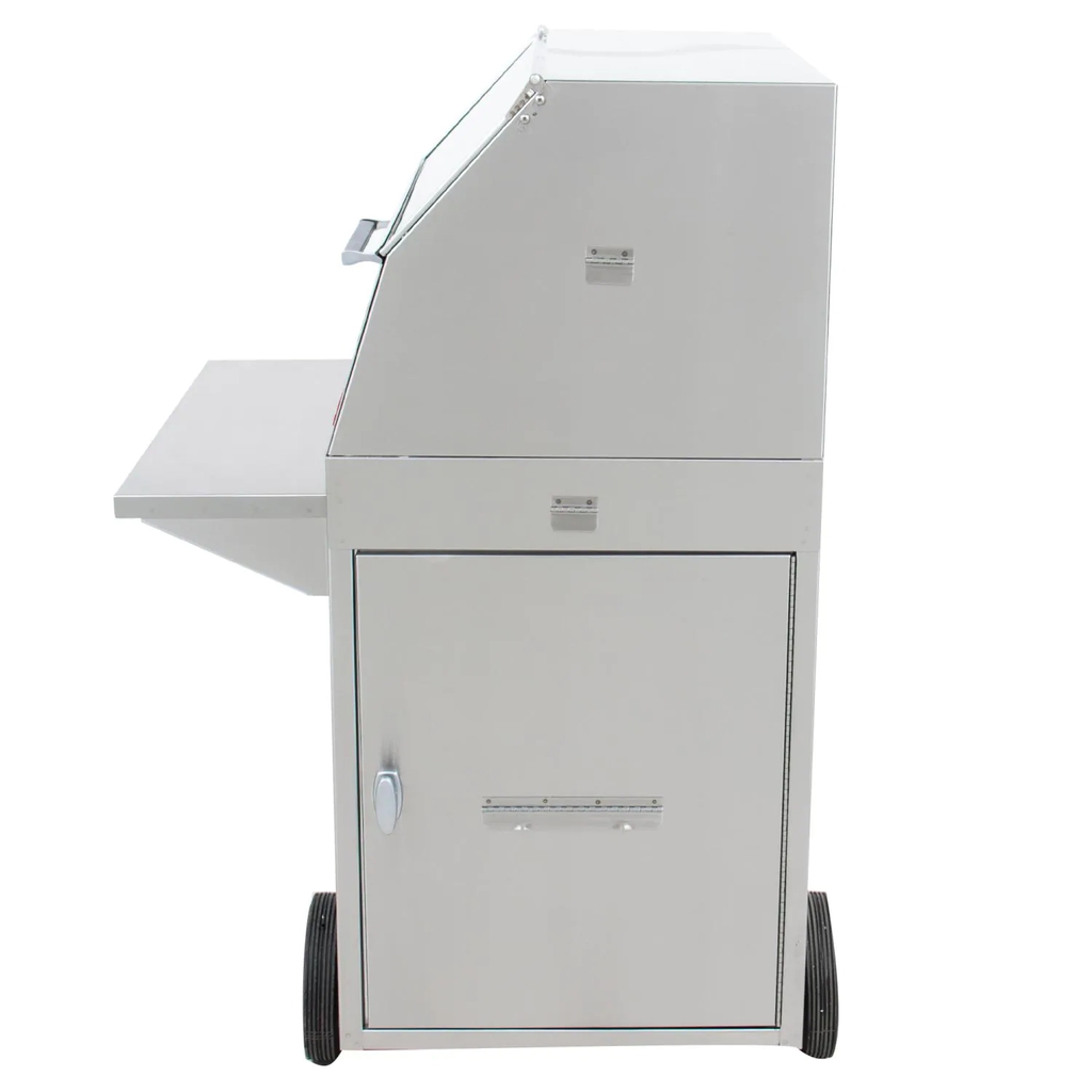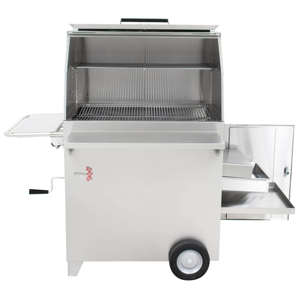 This Hasty-Bake Gourmet Stainless Steel Charcoal Grill is Hasty-Bakes ultimate charcoal oven. The Stainless Steel Gourmet features an 18 gauge polished stainless base with a 20 gauge stainless steel hood and 3/16 inch thick tempered glass window; 834 sq inches of total cooking surface (523 primary); an adjustable charcoal tray; stainless steel front and side tables; 28. 5 x 10. 75 inch removable warming rack; and a door on side for easy charcoal access and cleaning. Hood is designed with a bifold door and rotisserie cooking in mind. The hood will even allow the serious backyard chef the opportunity to run two rotisseries at one time. 10 year warranty.