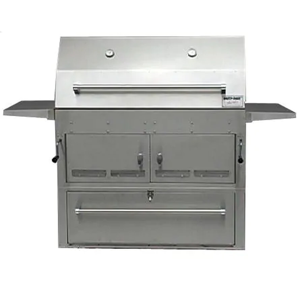 This Hasty-Bake Hastings Charcoal Grill On Cart is perfect for slow, indirect cooking as well as conventional grilling. The Hastings features all 304 grade stainless construction, 1194 sq inches of total cooking surface; stainless steel cooking grids; two individually controlled fire boxes which allow for simultaneous direct and indirect cooking; 40. 75 x 9. 75 inch removable warming rack; rollback hood design to allow for unobstructed access to the entire grilling area; double doors on front to allow for easy access to charcoal and cleaning; and dual thermometers guaranteed to be 99 percent accurate. 10 year warranty. Grill Dimensions (in inches): 44 W x 21 1/4 D x 52 1/4 H.