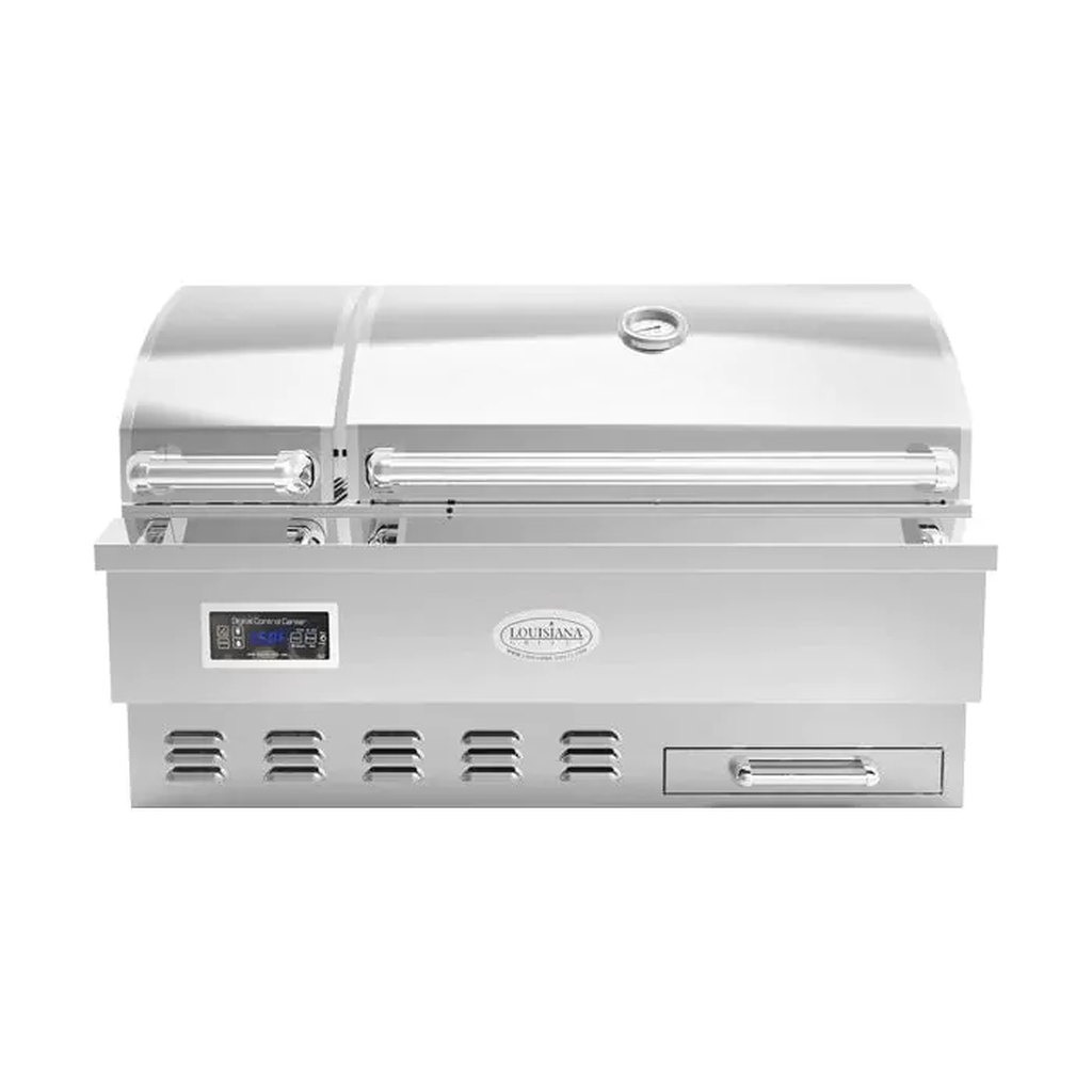 Designed with entertainment in mind, the Louisiana Grills LG860BI Estate Series pellet grill delivers world class BBQ in your backyard. This versatile wood pellet grill offers the capability to bake, roast, braise, smoke, grill, sear, char-grill and BBQ with ease on your backyard patio. The grill is constructed from heavy-duty, 304 stainless steel for enduring durability. The LG860BI main level cooking grate features 579 square inches of space while the upper rack offers 281 square inches for a comprehensive total of 860 square inches. With the large stainless steel burn grate installed in the burn pot and the flame broiler in the open position, you can reach temperatures up to 600 degrees for fast and fiery grilling. Fan-forced convection cooking ensures even temperatures throughout the grilling area and a proprietary exhaust system allows for even smoking. The auto-start electric igniter and feed system lets you set your temperature, push start, sit back and relax. The natural wood pellets feed into the burn pot where they are automatically ignited and the fan-cooled hopper and feed system keeps your grill at the temperature of your choosing. The hopper features a capacity of 28 pounds. The Digital Control Center lets you set your desired temperature and automatically maintains it during the grilling process. With the included meat probe, you can set your desired food temperature and the grill will automatically go into smoke mode when that temperature is reached, preventing over cooking. The lid thermometer enables you to monitor the temperature inside the grill and the removable grease tray catches run off grease from the flavor guard.