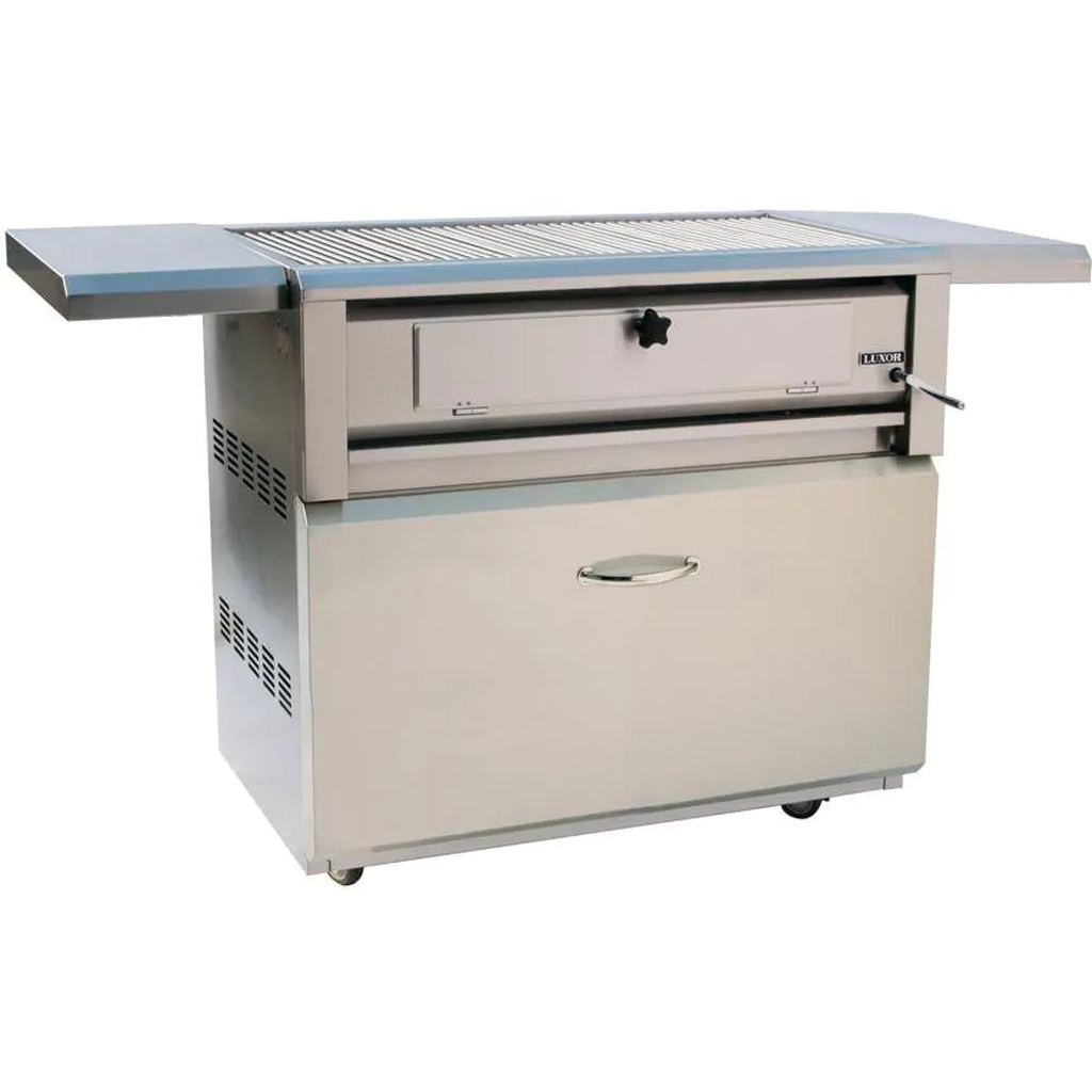 This Luxor 42-inch charcoal grill on cart features 701 square-inches of total cooking area, seamless 304 grade stainless steel construction with polished edges, crank lift to adjust charcoal pan, charcoal access door, removable ash pan, and solid 3/8-inch diameter stainless steel rod cooking grid. Luxor gas grill carts feature cabinet doors and double drawers for easy storage.