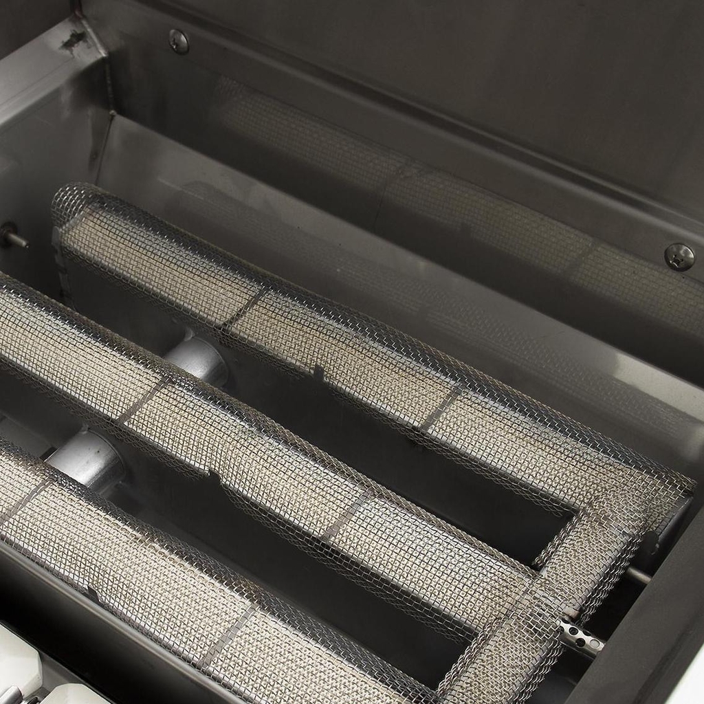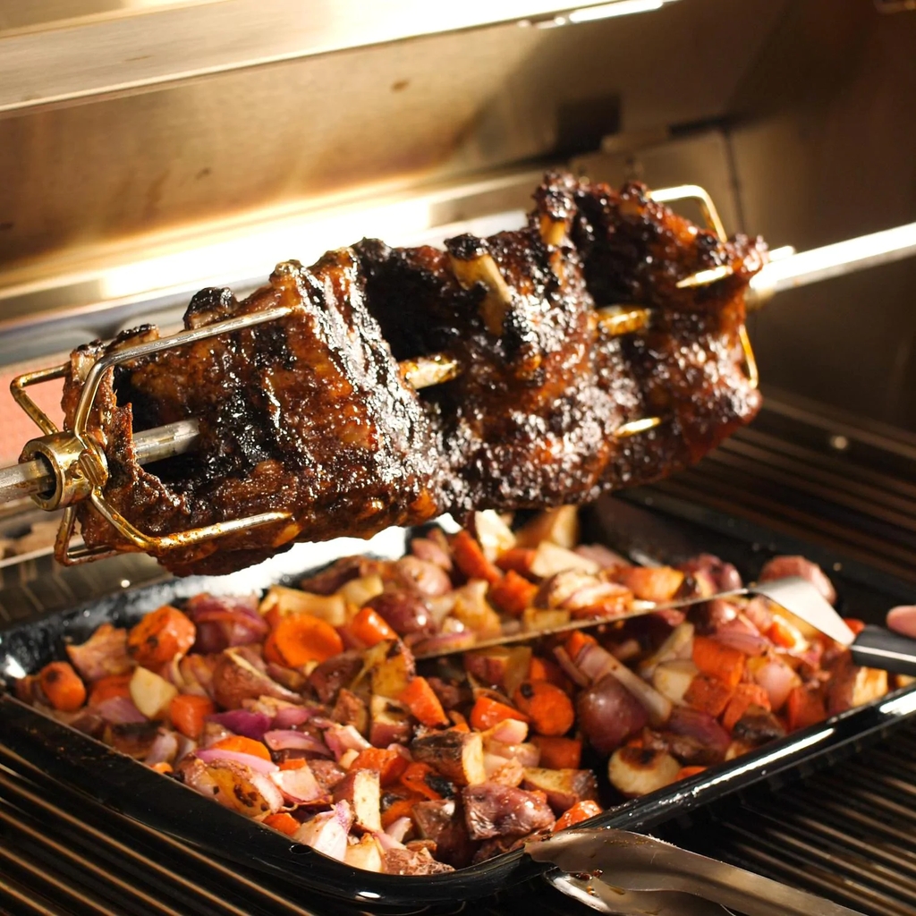 - Three-speed rotisserie with infrared burner produces slow roasted perfection