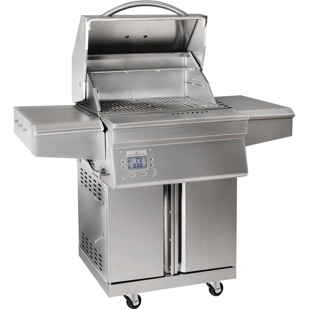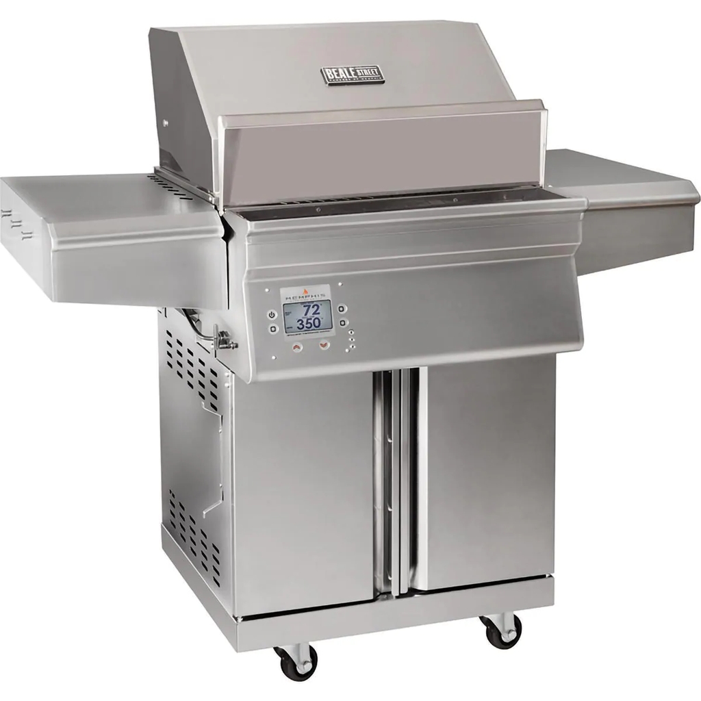 Beale Street pellet grills by Memphis Grills offer cooking versatility and convenience at a budget-friendly price. The Beale Street 26-inch freestanding pellet grill features durable 430 stainless steel construction and a combination of dual wall and sealed construction for essential grill longevity, heat retention, and performance in all weather conditions. With an integrated Wi-Fi controller and free Memphis Mobile App (iOS and Android), you have the freedom to control your grill from anywhere you desire. This technology can also be set up to send you email or text alerts when your food is cooked to perfection. The grill can also be controlled using the Intelligent Temperature Control mounted on the grill. The food probe comes standard and integrates with the Intelligence Temperature Control on the grill. When the grill reaches the desired temperature, the ITC automatically reduces the grill temperature to warm. It can also read temperatures from up to two more food probes, allowing you to monitor multiple dishes at once. The natural wood pellets feed into the burn pot where they are automatically ignited. The single-fan convection system fuels the fire with oxygen for true convection heating, evenly distributing the air over the 429 square inch main cooking area and 129 square inch upper grate. This air circulation allows the grill to cook food faster and eliminates hot spots in the grill. The cooking area can be expanded by an additional 259 square inches with the optional grill grate kit (sold separately). This grill comes with an automatic auger that self-feeds the pellets into the firebox. A 12 pound pellet hopper allows for up to 18 hours of uninterrupted cooking time at 350 degrees Fahrenheit. Four (4) heavy-duty locking casters make this grill easy to relocate and the cart side shelves open for more storage room for BBQ tools.