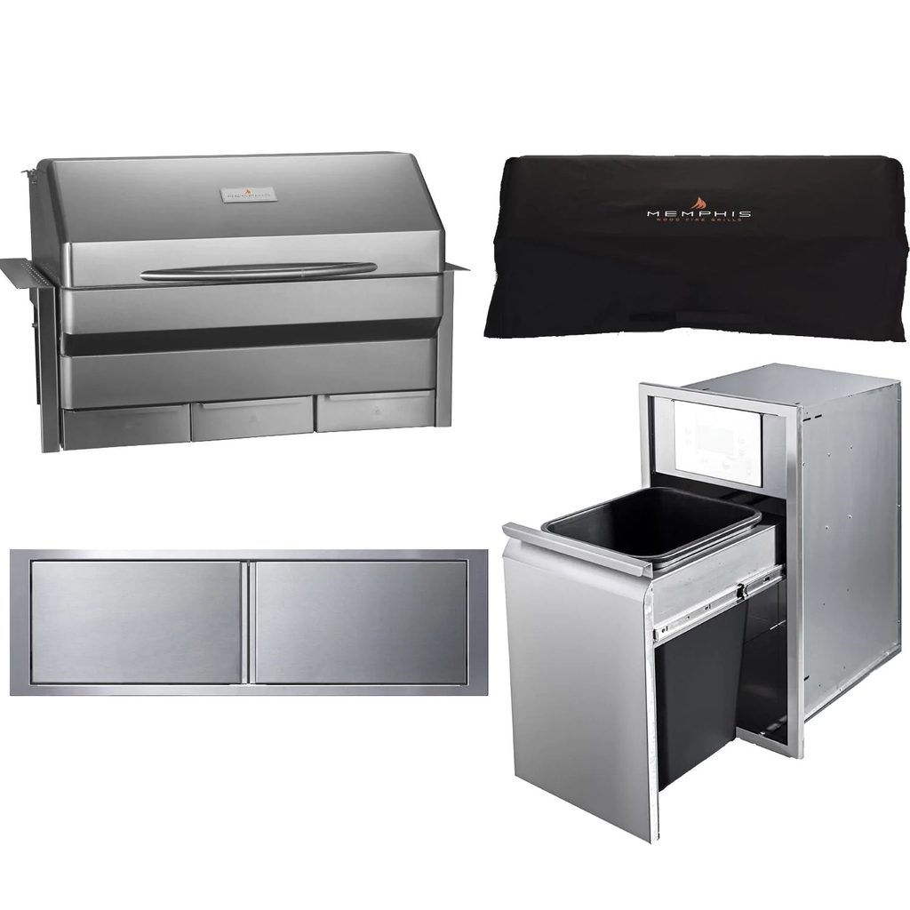 This Memphis Grills Elite Pellet Grill outdoor kitchen package has almost everything you need to get started on a durable, quality outdoor kitchen at an affordable price. Memphis Grills has your groundbreaking solution for hassle-free outdoor barbecues! The Elite Series 39 inch built-in pellet grill features heavy-duty 304 stainless steel construction, 6mm nickel-plated steel cooking rods, and a combination of dual wall and sealed construction for essential grill longevity, heat retention and performance in all weather conditions. With an integrated Wi-Fi controller and free Memphis Mobile App (iOS and Android), you have the freedom to control your grill from anywhere you desire. This technology can also be setup to send you email or text alerts when your food is cooked to perfection. The grill can also be controlled using the Intelligent Temperature Control which can be mounted near the grill in your outdoor kitchen. A 10 foot wire is included to connect between the grill and Intelligent Temperature Control. The food probe comes standard and integrates with the Intelligence Temperature Control on the grill. When the grill reaches the desired temperature, the ITC automatically reduces the grill temperature to warm. It can also read temperatures from up to two more food probes, allowing you to monitor multiple dishes at once. The natural wood pellets feed into the burn pot where they are automatically ignited. The dual fan convection system fuels the fire with oxygen to create a convection oven by evenly distributing the air over the 844 square inches of main cooking area. This air circulation allows the grill to cook food faster and eliminates hot spots in the grill. With a temperature range of 180 to 700 degrees Fahrenheit, you can sear steaks using the included Direct Flame Insert, or remove it when cooking at lower temperatures. A convenient Genie Multi-Tool is also included so you can remove the direct flame insert easily, or use it to clean the grill. This Memphis grill comes with dual automatic augers that self-feed the pellets into the firebox and an EZ Access Hatch for maintaining your grill. A dual-bin 24 pound capacity wood pellet hopper (12 pounds each) allows up to 36 hours of uninterrupted cooking time and allows you mix in different pellet flavors, enhancing your grilling options. A water-resistant vinyl cover is included to protect your grill from outdoor wear and tear. The Memphis Grills Elite 42-inch double access door was designed to be paired with built-in Memphis Elite pellet grills and features a sleek, handle-less design with hidden hinges. The Memphis Grills 15-inch roll-out trash bin gives you a convenient place to mount the built-in Memphis Grills controller for a truly professional look. The easy touch, self-closing bin glides smoothly on heavy-duty, stainless steel slides rated to hold up to 100 pounds and includes a 10 gallon trash can. Please note that a 110V power source is required. Do not forget to ask your contractor how many vent panels you need!