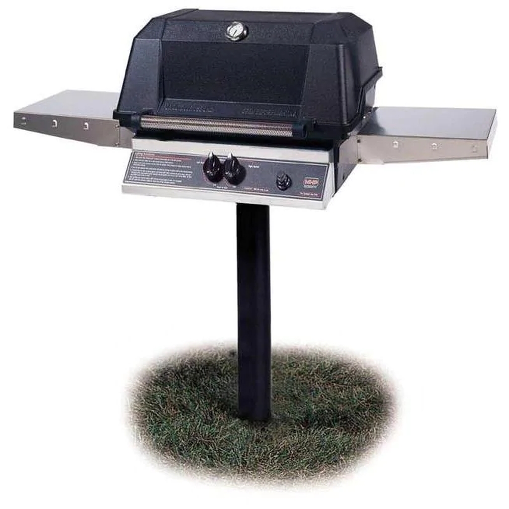 This MHP gas grill features a high profile, thick, cast aluminum no rust exterior housing that accommodates large cuts of meat and features a Sta-Kool handle which rolls to make opening the hood easy. The two (2) SearMagic cooking grids offer 433 1/2 square inches of cooking area. The anodized aluminum SearMagic cooking rack is reversible with one side wide-ribbed for grilling steaks, chops, burgers or ribs and giving them sear lines. Flip it over and its smooth surface is perfect for fish, vegetables or even breakfast foods such as French toast. The 40,000 BTU stainless H-type dual burner has burner ports that are uniform in size and shape with even flames on each port providing superior cooking performance. Includes 48 inch black, anodized aluminum in-ground post with stainless steel tubing, two (2) stainless steel side shelves and stainless grease cup for easy clean-up. Some assembly required for this MHP BBQ Grill.