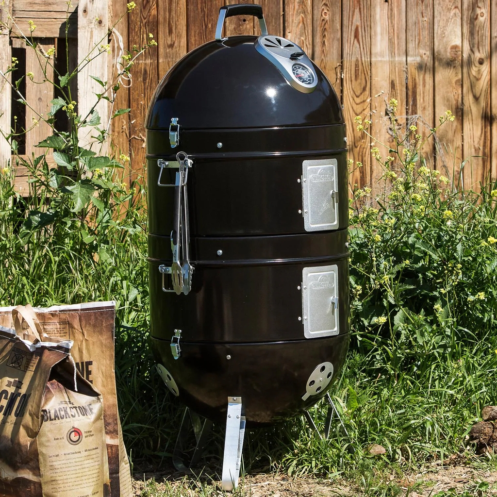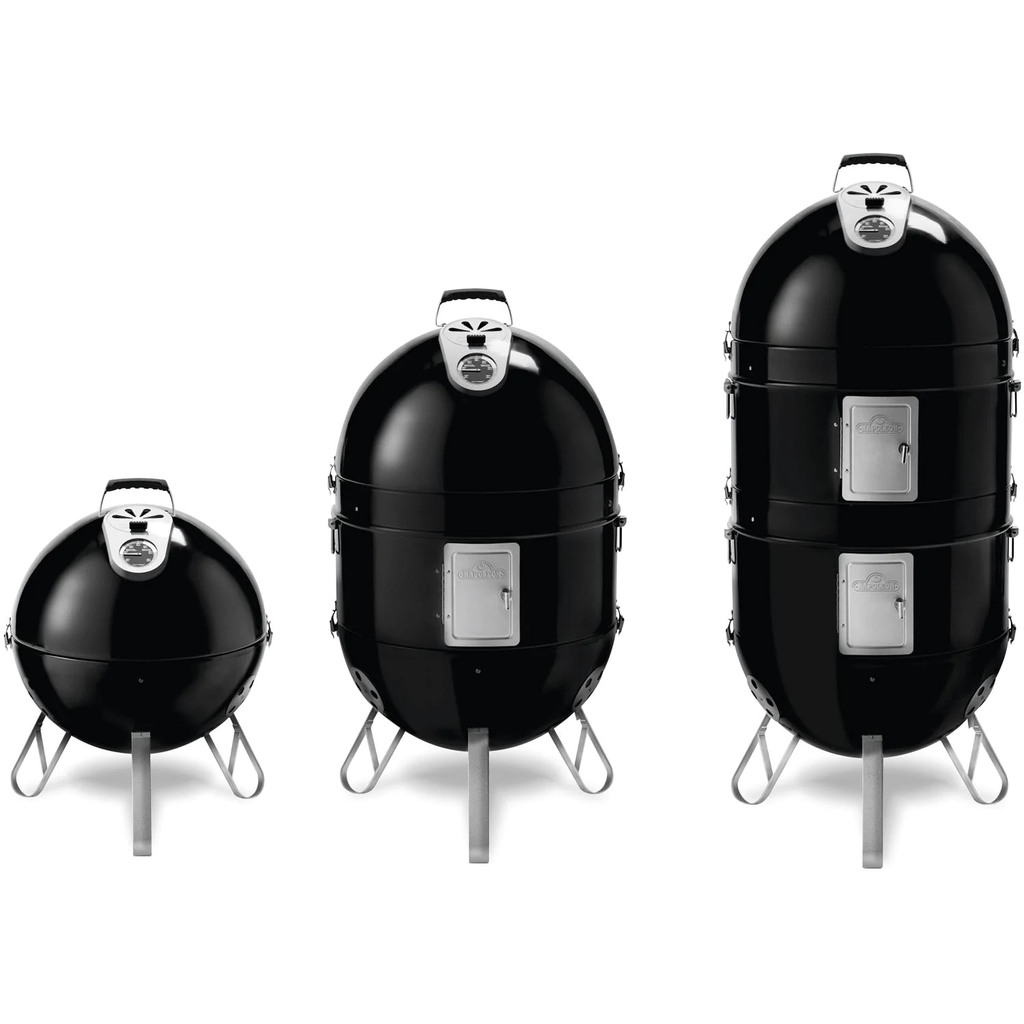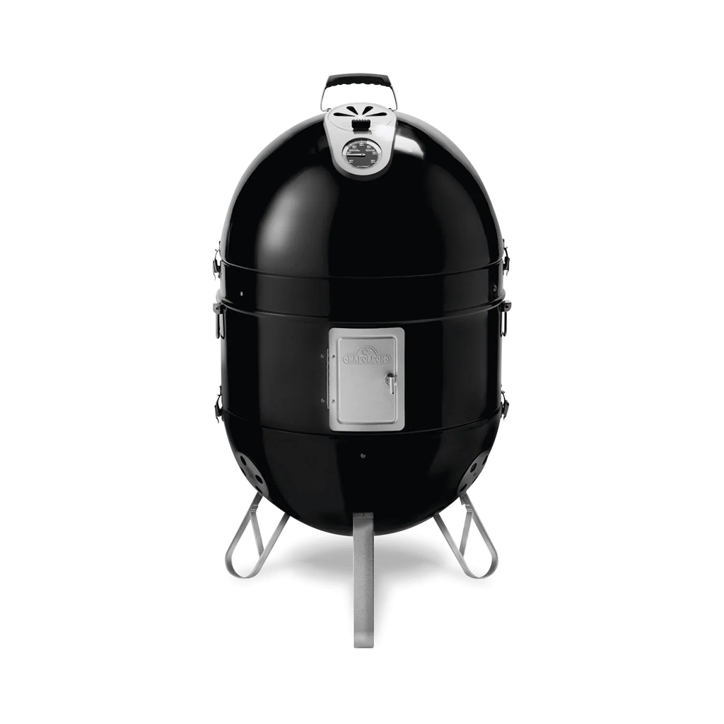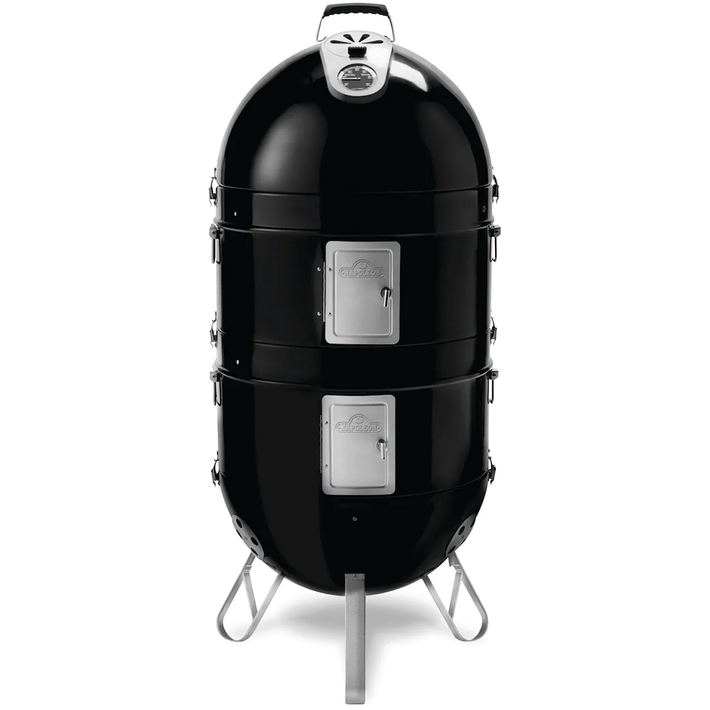 The Napoleon Apollo 3-in-1 gives you the option of using the grill as as a dry smoker, wet smoker, or as a stand-alone charcoal grill. Made from heavy-gauge porcelain enameled steel, this grill can transform from a smoker to a portable charcoal grill with the quick flip of the toggle latches. The lid and base have vents for precision air flow and temperature control, while each chamber has vent doors for accessing the large capacity water pan and charcoal basket, as well as eyelets for inserting a thermometer probe. The two 19-inch cooking grids can hold enough food to feed a crowd with ease. The upper lid has an Accu-Probe temperature gauge and contains a horizontal bar with five hooks for hanging meat and sausage up to 3 feet in length. Each section latches together and has folding handles for easy transporting.