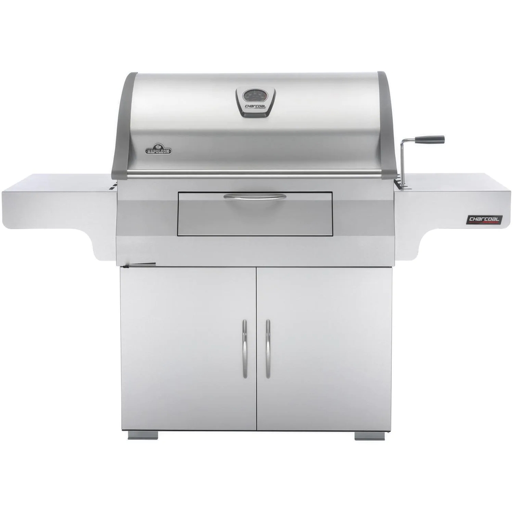 Combining traditional charcoal grilling with modern styling and performance, the Napoleon Professional Charcoal Grill does it all. Solidly constructed from durable 304 stainless steel, this Napoleon grill has 605 square inches of main cooking area and 240 square inches of warming area for a total of 845 square inches of cooking area. This grill has an amazing, exclusive rotisserie burner powered by charcoal for roasting meat like a professional chef (rotisserie kit not included). The porcelainized cast iron wave cooking grates efficiently retain heat and create unique, perfect sear lines on your food. This grill features an adjustable, full width charcoal bed with an easy to use handle and convenient front loading charcoal door for easy filling. It also has adjustable air vents for increased heat control. Discover the versatility of this unique grill with the included charcoal dividers, which allow you to cook low and slow over indirect heat, or sear with direct heat. The tightly sealed, double-walled hood features an Accu-Probe temperature gauge and retains heat for oven-like performance. The ash and drip pan slide out when you are done cooking for quick and easy cleaning. The stainless steel grill cart features wrap around shelves, condiment trays, tool hooks, double doors for storage and easy roll locking casters for moving the grill around.