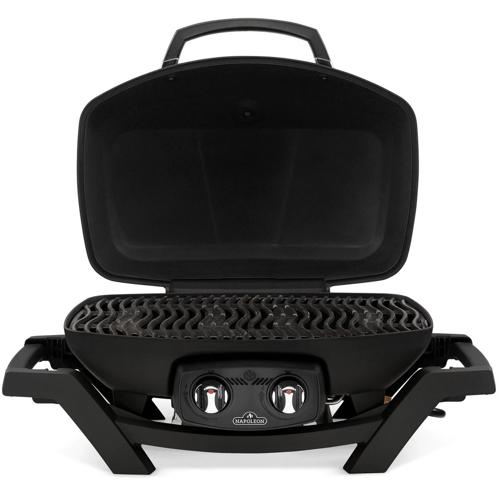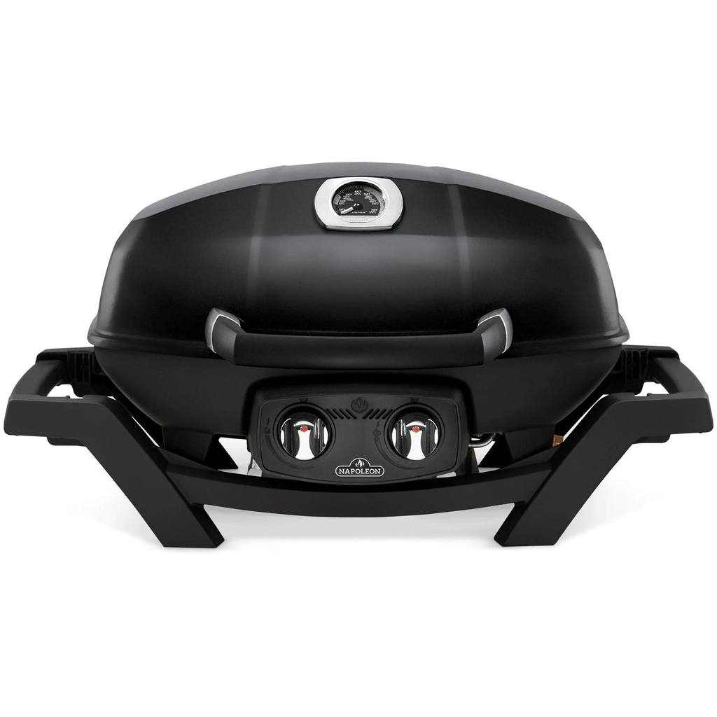 Grilling on the go made easy with portable grills from Napoleon. The Napoleon TravelQ portable natural gas grill provides up to 12,000 BTUs and 285 square inches of cooking area. The removable, porcelainized cast iron wave cooking grids create the trademark Napoleon sear lines. The TravelQ has dual stainless steel burners, allowing you to cook directly over the heat or indirectly for low and slow style cooking. The Napoleon electronic Jetfire ignition with crossover lighting starts both burners individually for a reliable start up every time and allows you to light each burner at the same time. The wind proof design holds in heat and features a high-top lid for cooking large cuts of meat or poultry. An Accu-Probe temperature gauge is built into the lid for easy temperature monitoring.