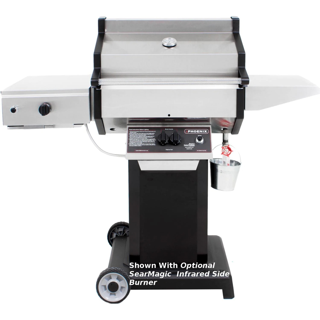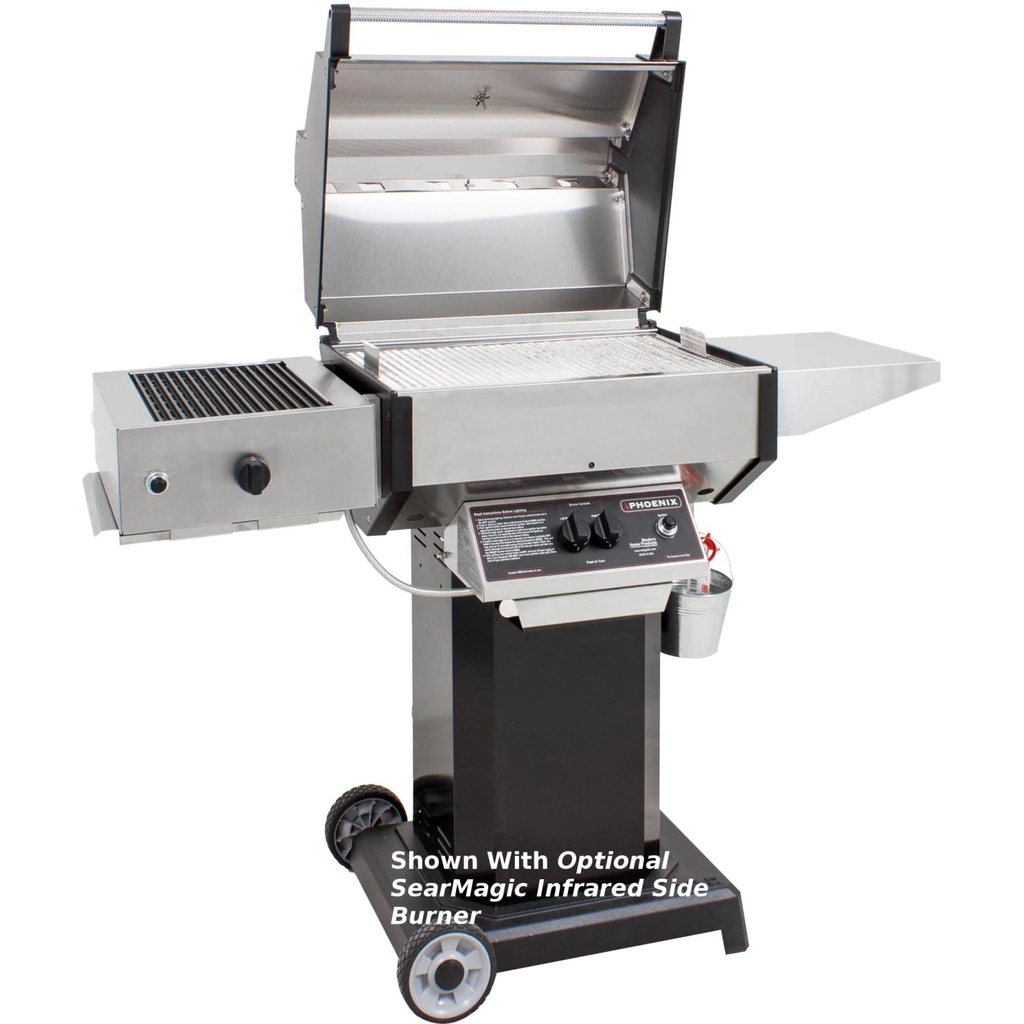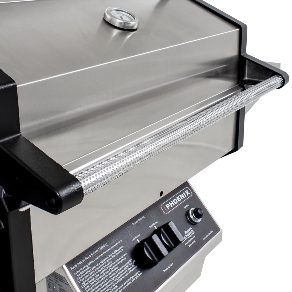 Built with quality in mind, the American made Phoenix SD complete outdoor cooking system is easy enough for a beginner to use and has enough features for the serious griller. Built like the renowned Holland Grill, this grill is designed to let you do it all: grill, roast, steam and smoke. Each side of the stainless steel, oval-shaped dual burner is controlled individually and together provides up to 25,000 BTUs of precise heat. The solid brass dual valve allows you to adjust your grill as low as 250 degrees for slow cooking, or turn it up to 500 degrees for high heat grilling. The adjustable vents on the top of the grill allow you to maintain and control the air flow while cooking. For steaming, close the drain valve, fill the cast aluminum drip pan that sits above the burner with liquid of your choice and set the burner to high to steam vegetables or seafood. The heat rises around the drip pan, making it virtually free of flare-ups. With the electric ignition with stainless steel gas collector box, you can easily light the grill using one AAA battery. The stainless steel diamond pattern cooking mesh grid provides 400 square inches of cooking space and prevents food from falling through. The stainless steel grill head has a Sta-Kool swivel, stainless steel handle to open the lid safely and easily and the hood has stainless steel heat indicator to monitor temperatures. The black, powder coated cast aluminum cart includes two stainless steel side shelves with tool hooks and four locking casters. Clean up is easy with the cast aluminum drip pan and collection bucket.