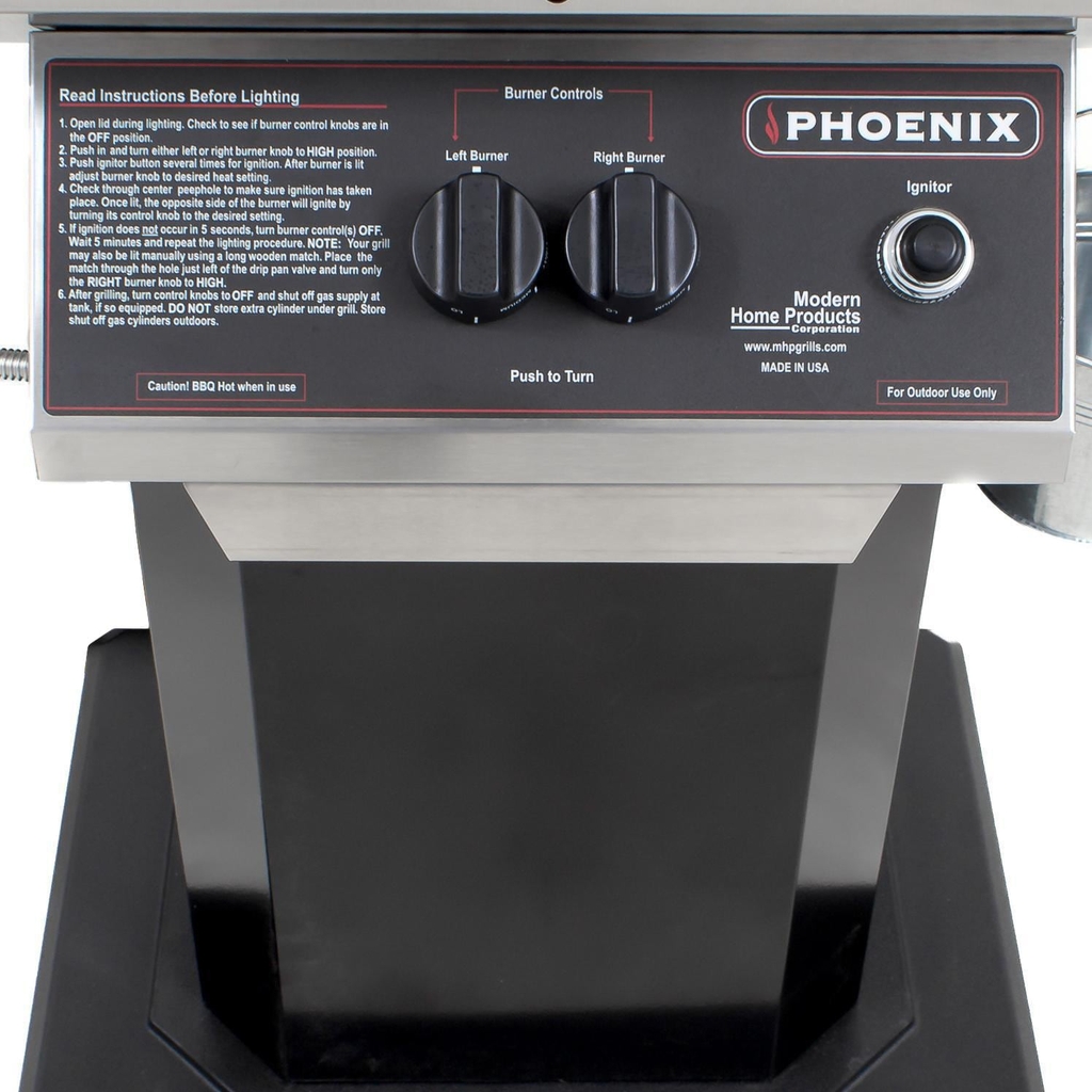 Built with quality in mind, the American made Phoenix SD complete outdoor cooking system is easy enough for a beginner to use and has enough features for the serious griller. Built like the renowned Holland Grill, this grill is designed to let you do it all: grill, roast, steam and smoke. Each side of the stainless steel, oval-shaped dual burner is controlled individually and together provides up to 25,000 BTUs of precise heat. The solid brass dual valve allows you to adjust your grill as low as 250 degrees for slow cooking, or turn it up to 500 degrees for high heat grilling. The adjustable vents on the top of the grill allow you to maintain and control the air flow while cooking. For steaming, close the drain valve, fill the cast aluminum drip pan that sits above the burner with liquid of your choice and set the burner to high to steam vegetables or seafood. The heat rises around the drip pan, making it virtually free of flare-ups. With the electric ignition with stainless steel gas collector box, you can easily light the grill using one AAA battery. The stainless steel diamond pattern cooking mesh grid provides 400 square inches of cooking space and prevents food from falling through. The stainless steel grill head has a Sta-Kool swivel, stainless steel handle to open the lid safely and easily and the hood has stainless steel heat indicator to monitor temperatures. The black, powder coated cast aluminum patio base includes two stainless steel side shelves with tool hooks. Clean up is easy with the cast aluminum drip pan and collection bucket.