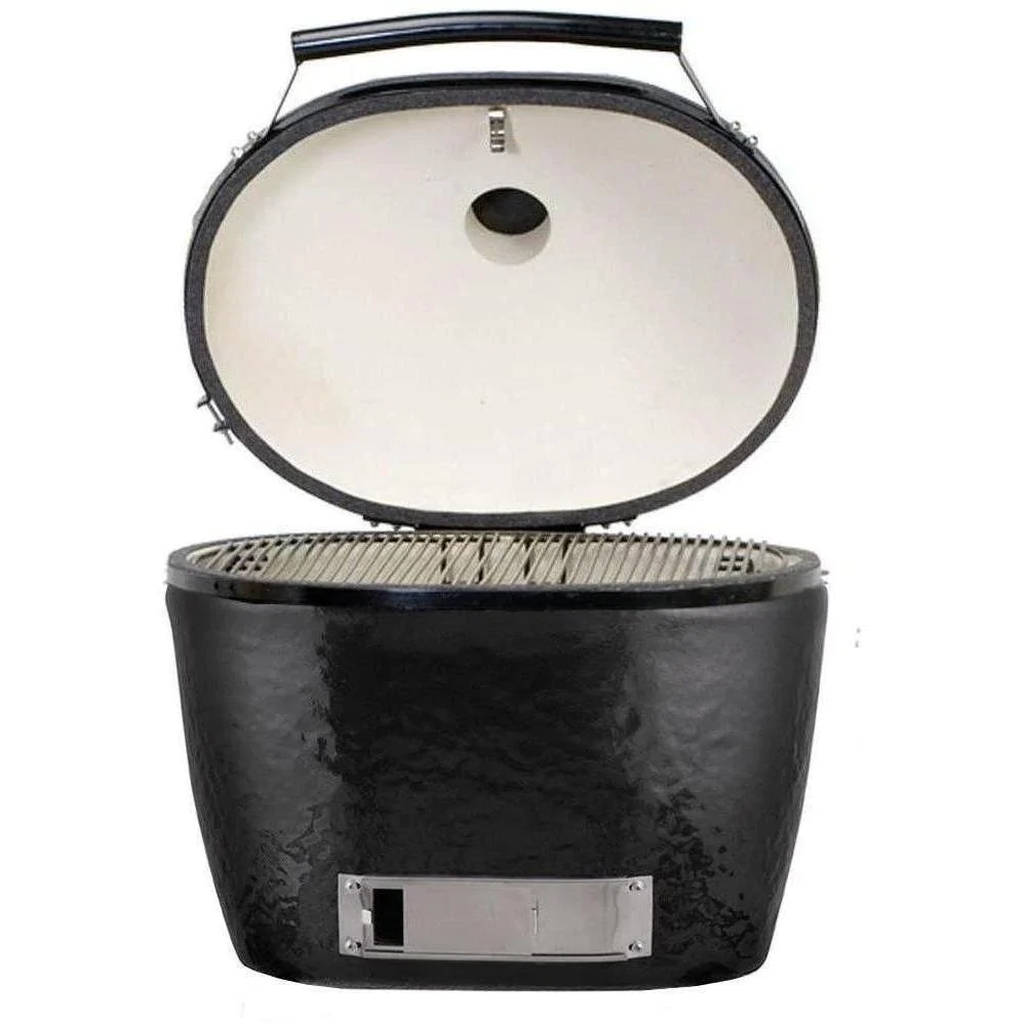 Choose Primo and experience the best in kamado style charcoal cooking. An exclusive to Primo that celebrates American ingenuity and spirit, The Primo Jack Daniels Edition Oval XL Charcoal Smoker Grill is an extra large sized grill and one of the biggest ceramic cookers on the market and features the Jack Daniels logo, making it the centerpiece of any outdoor area. The distinct shape of the Oval XL allows you to cook using direct or indirect heat, expanding your grilling options unlike any other kamado-style grill. This grill features easy to clean and reversible porcelain-coated cooking grates, as well as one of the highest sitting lids which is great for cooking whole chickens or turkeys. This kamado style grill is made in the USA, unlike its competition, and constructed with premium grade Primo SuperCeramics and coated with a protective, lead-free, and scratch-resistant porcelain glaze. The patented Primo Oval XL efficiently retains and evenly distributes heat across the 400 square inches of cooking surface, perfect for maintaining a consistent temperature. Smoke meat at temperatures as low as 180 degrees Fahrenheit, or turn up the heat to more than 500 degrees Fahrenheit for searing and grilling. Use the cast iron chimney cap, stainless steel lower vent door, and easy to read thermometer for monitoring and keeping a precise temperature. The easy lift-and-lock hinge system keeps the lid raised in place, and the soft-close felt gasket protects the ceramic while opening and closing the lid using the cool touch handle. The included ceramic feet safely elevate your grill away from the combustible surface of the table, which is constructed by hand from durable cypress wood. The compact design of the cypress table gives you the convenience of a movable table without taking up much space, while tastefully showcasing your Primo grill. Four revolving and lockable caster wheels roll smoothly on any patio surface and lock in place when you are ready to grill. The variety of accessories available, along with the unique oval shape, allows flexibility in cooking a never ending list of delicious meals. Choosing a Primo kamado style grill is a decision you will never regret.