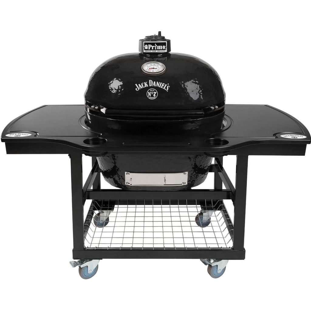 HomeKamado GrillsFreestanding Kamado Primo Jack Daniels Edition Oval XL 400 Ceramic Kamado Grill On Steel Cart With 1-Piece Island Side Shelves, Cup Holders, and Stainless Steel Grates – 900
