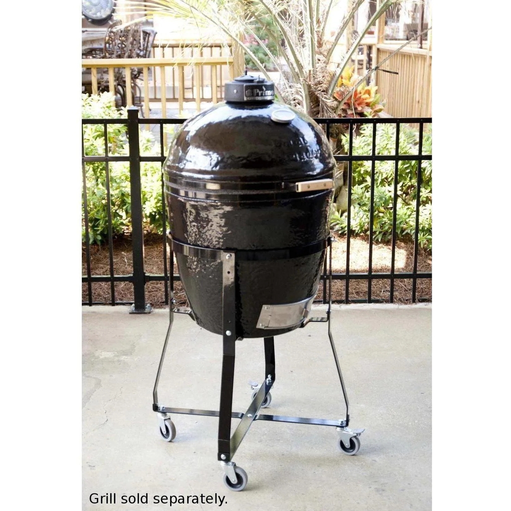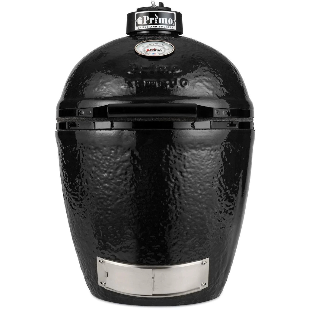 Choose Primo and experience the best in kamado style charcoal cooking. The Primo Large Round Kamado Charcoal Smoker Grill is a large sized grill with the classic round kamado shape. This grill features easy to clean and porcelain-coated cooking grates, as well as one of the highest sitting lids on the market which is great for cooking whole chickens. This kamado style grill is made in the USA, unlike its competition, and constructed with premium grade Primo SuperCeramics and coated with a protective, lead-free, and scratch-resistant porcelain glaze. The Primo Large Round Grill efficiently retains and evenly distributes heat across the 280 square inches of cooking surface, perfect for maintaining a consistent temperature. Smoke meat at temperatures as low as 180 degrees Fahrenheit, or turn up the heat to more than 500 degrees Fahrenheit for searing and grilling. Use the cast iron chimney cap, stainless steel lower vent door, and easy to read thermometer for monitoring and keeping a precise temperature. The easy lift-and-lock hinge system keeps the lid raised in place, and the soft-close felt gasket protects the ceramic while opening and closing the lid using the cool touch handle. The sturdy metal cradle securely holds your Primo Large Round Kamado Grill and is the ideal cart for a small yard or patio. Four revolving wheels help you move it around with ease, and two wheels can be locked for stability while grilling. Ash tool and grill lifter are both included in this package.