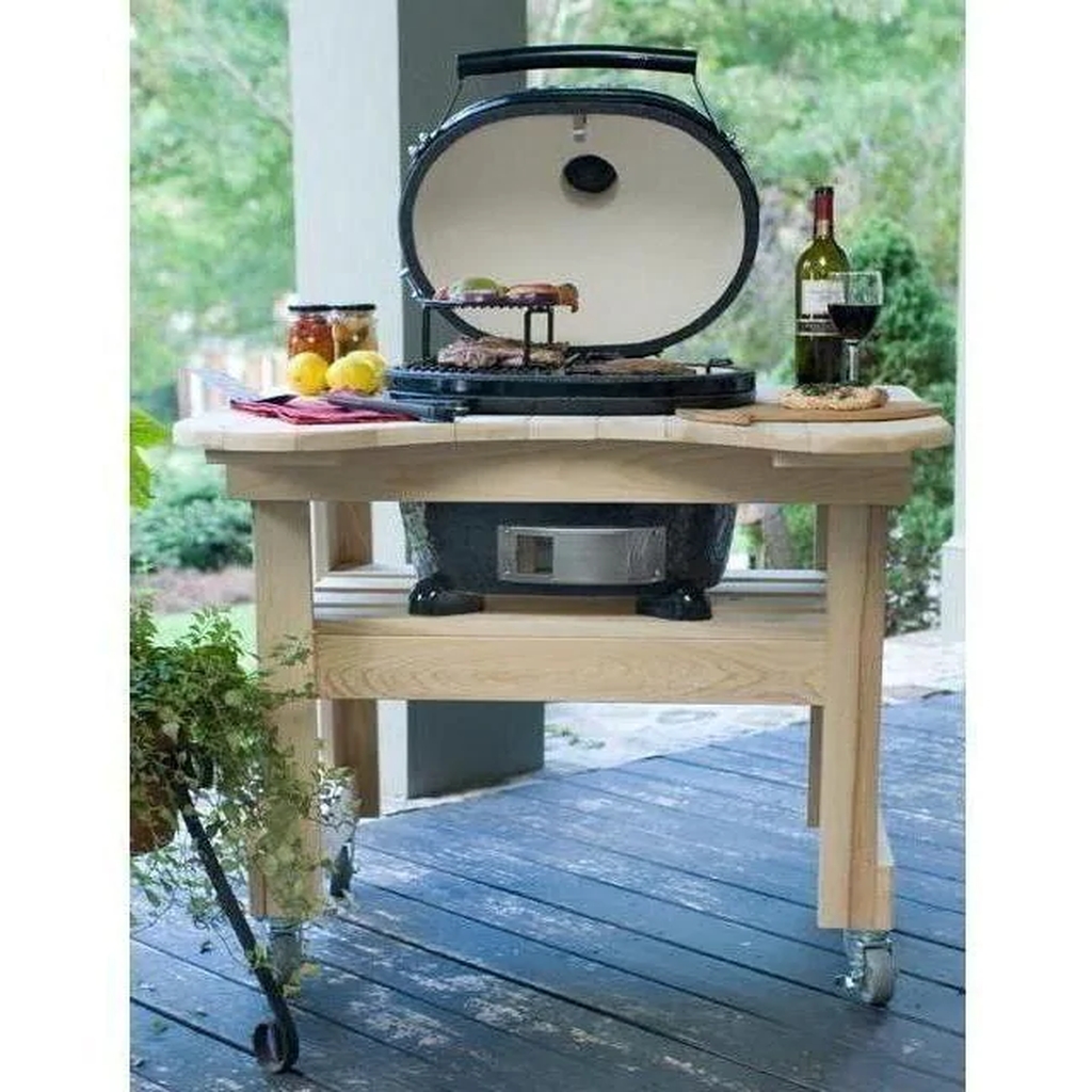 Choose Primo and experience the best in kamado style charcoal cooking. The Primo Oval Junior Smoker Charcoal Grill is a medium to large size grill with all the benefits of the original, uniquely shaped Oval XL, but for those who do not need as much cooking area. The distinct shape of the Oval Junior allows you to cook using direct or indirect heat, expanding your grilling options unlike any other kamado-style grill. This grill features easy to clean and reversible porcelain-coated cooking grates, as well as one of the highest sitting lids on the market which is great for cooking whole chickens. This kamado style grill is made in the USA, unlike its competition, constructed with premium grade Primo SuperCeramics, and coated with a protective, lead-free, and scratch-resistant porcelain glaze. The patented Primo Oval Junior efficiently retains and evenly distributes heat across the 210 square inches of cooking surface, perfect for maintaining a consistent temperature. Smoke meat at temperatures as low as 180 degrees Fahrenheit, or turn up the heat to more than 500 degrees Fahrenheit for searing and grilling. Use the cast iron chimney cap, stainless steel lower vent door, and easy to read thermometer for monitoring and keeping a precise temperature. The easy lift-and-lock hinge system keeps the lid raised in place, and the soft-close felt gasket protects the ceramic while opening and closing the lid using the cool touch handle. Heat-safe ceramic feet are available to stabilize your Primo and are needed when the grill sits on a combustible surface (sold separately). The variety of accessories available, along with the unique oval shape, allows flexibility in cooking a never ending list of delicious meals. Choosing a Primo kamado style grill is a decision you will never regret.