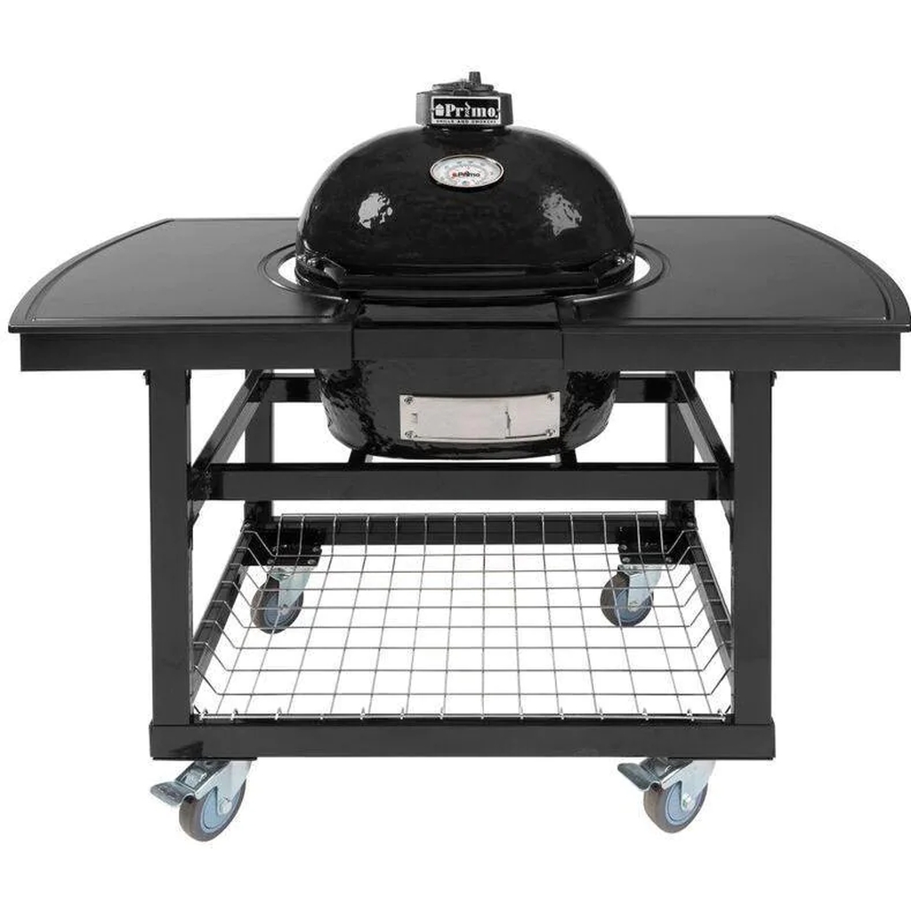 Choose Primo and experience the best in kamado style charcoal cooking. The Primo Oval Junior Smoker Charcoal Grill is a medium to large size grill with all the benefits of the original, uniquely shaped Oval XL, but for those who do not need as much cooking area. The distinct shape of the Oval Junior allows you to cook using direct or indirect heat, expanding your grilling options unlike any other kamado-style grill. This grill features easy to clean and reversible porcelain-coated cooking grates, as well as one of the highest sitting lids on the market which is great for cooking whole chickens. This kamado style grill is made in the USA, unlike its competition, constructed with premium grade Primo SuperCeramics, and coated with a protective, lead-free, and scratch-resistant porcelain glaze. The patented Primo Oval Junior efficiently retains and evenly distributes heat across the 210 square inches of cooking surface, perfect for maintaining a consistent temperature. Smoke meat at temperatures as low as 180 degrees Fahrenheit, or turn up the heat to more than 500 degrees Fahrenheit for searing and grilling. Use the cast iron chimney cap, stainless steel lower vent door, and easy to read thermometer for monitoring and keeping a precise temperature. The easy lift-and-lock hinge system keeps the lid raised in place, and the soft-close felt gasket protects the ceramic while opening and closing the lid using the cool touch handle. The powder-coated steel cart with side shelves made from high quality marine grade HDPE materials resists rusting and the wire basket is perfect for storing charcoal or other accessories. The side tables extend your work area, allowing you to keep ingredients nearby. Four heavy-duty swivel casters roll smoothly on any patio surface and lock in place when you are ready to grill. The variety of accessories available, along with the unique oval shape, allows flexibility in cooking a never ending list of delicious meals. Choosing a Primo kamado style grill is a decision you will never regret.