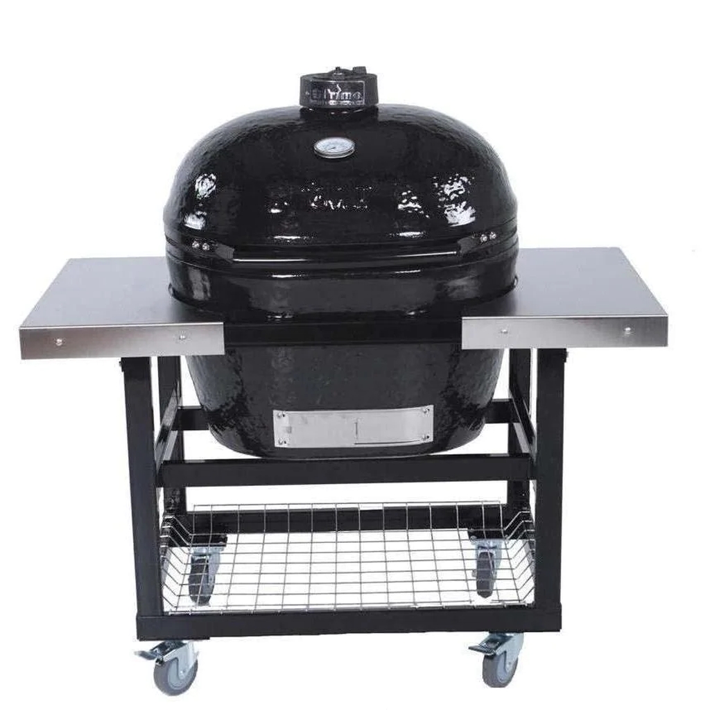 Choose Primo and experience the best in kamado style charcoal cooking. The Primo Oval Junior Smoker Charcoal Grill is a medium to large size grill with all the benefits of the original, uniquely shaped Oval XL, but for those who do not need as much cooking area. The distinct shape of the Oval Junior allows you to cook using direct or indirect heat, expanding your grilling options unlike any other kamado-style grill. This grill features easy to clean and reversible porcelain-coated cooking grates, as well as one of the highest sitting lids on the market which is great for cooking whole chickens. This kamado style grill is made in the USA, unlike its competition, constructed with premium grade Primo SuperCeramics, and coated with a protective, lead-free, and scratch-resistant porcelain glaze. The patented Primo Oval Junior efficiently retains and evenly distributes heat across the 210 square inches of cooking surface, perfect for maintaining a consistent temperature. Smoke meat at temperatures as low as 180 degrees Fahrenheit, or turn up the heat to more than 500 degrees Fahrenheit for searing and grilling. Use the cast iron chimney cap, stainless steel lower vent door, and easy to read thermometer for monitoring and keeping a precise temperature. The easy lift-and-lock hinge system keeps the lid raised in place, and the soft-close felt gasket protects the ceramic while opening and closing the lid using the cool touch handle. The powder-coated steel cart with stainless steel side shelves resists rusting, and the wire basket is perfect for storing charcoal or other accessories. The side tables extend your work area, allowing you to keep ingredients nearby and the hooks on each shelf provide storage for grilling tools. Four heavy-duty swivel casters roll smoothly on any patio surface and lock in place when you are ready to grill. The variety of accessories available, along with the unique oval shape, allows flexibility in cooking a never ending list of delicious meals. Choosing a Primo kamado style grill is a decision you will never regret.