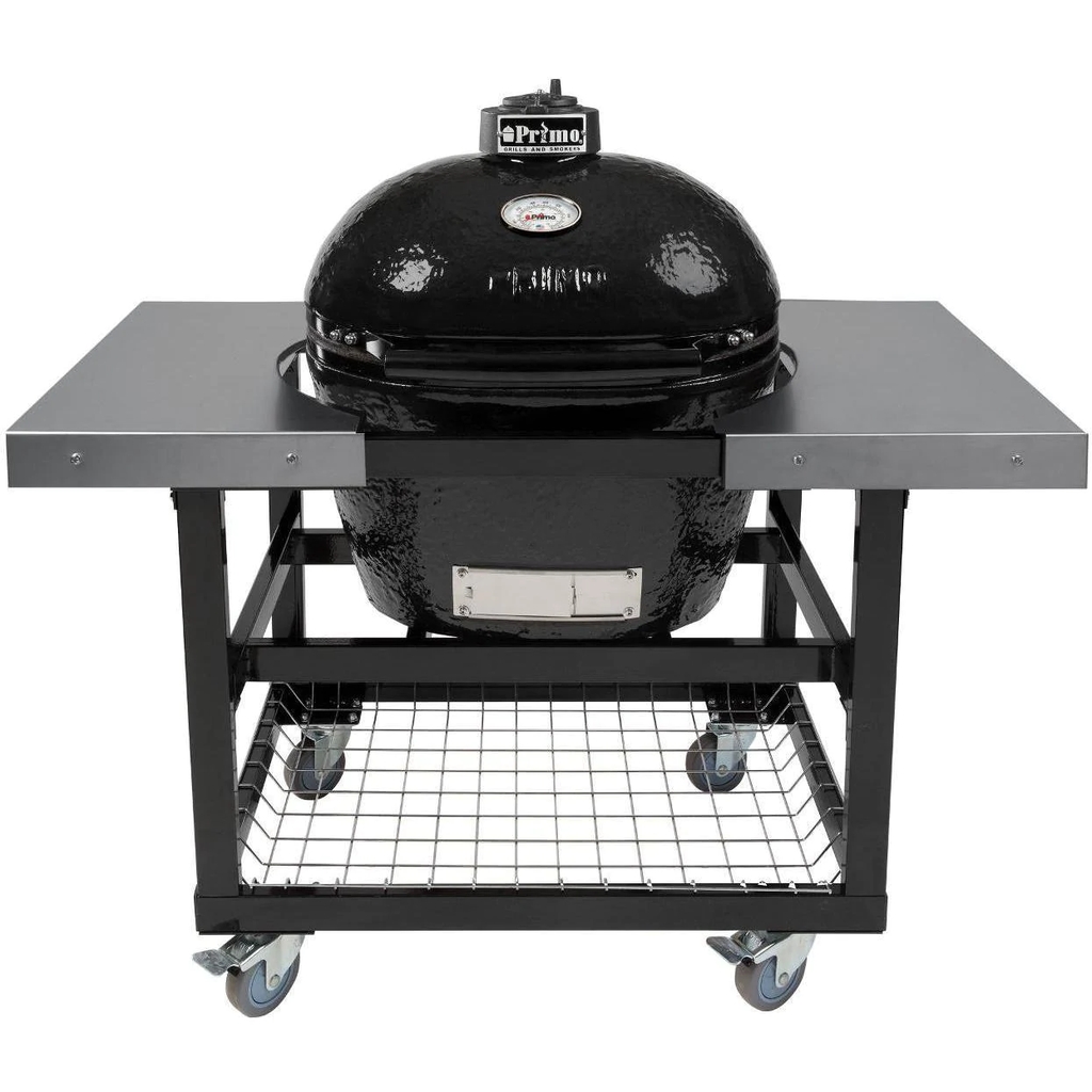 Choose Primo and experience the best in kamado style charcoal cooking. The Primo Oval Large Smoker Charcoal Grill is a large size grill with all the benefits of the original, uniquely shaped Oval XL, but for those who do not need as much cooking area. The distinct shape of the Oval Large allows you to cook using direct or indirect heat, expanding your grilling options unlike any other kamado-style grill. This grill features easy to clean and reversible stainless steel cooking grates, as well as one of the highest sitting lids on the market which is great for cooking whole chickens. This kamado style grill is made in the USA, unlike its competition, constructed with premium grade Primo SuperCeramics, and coated with a protective, lead-free, and scratch-resistant porcelain glaze. The patented Primo Oval Large efficiently retains and evenly distributes heat across the 300 square inches of cooking surface, perfect for maintaining a consistent temperature. Smoke meat at temperatures as low as 180 degrees Fahrenheit, or turn up the heat to more than 500 degrees Fahrenheit for searing and grilling. Use the cast iron chimney cap, stainless steel lower vent door, and easy to read thermometer for monitoring and keeping a precise temperature. The easy lift-and-lock hinge system keeps the lid raised in place, and the soft-close felt gasket protects the ceramic while opening and closing the lid using the cool touch handle. The powder-coated steel cart with stainless steel side shelves resists rusting, and the wire basket is perfect for storing charcoal or other accessories. The side tables extend your work area, allowing you to keep ingredients nearby and the hooks on each shelf provide storage for grilling tools. Four heavy-duty swivel casters roll smoothly on any patio surface and lock in place when you are ready to grill. The variety of accessories available, along with the unique oval shape, allows flexibility in cooking a never ending list of delicious meals. Choosing a Primo kamado style grill is a decision you will never regret.
