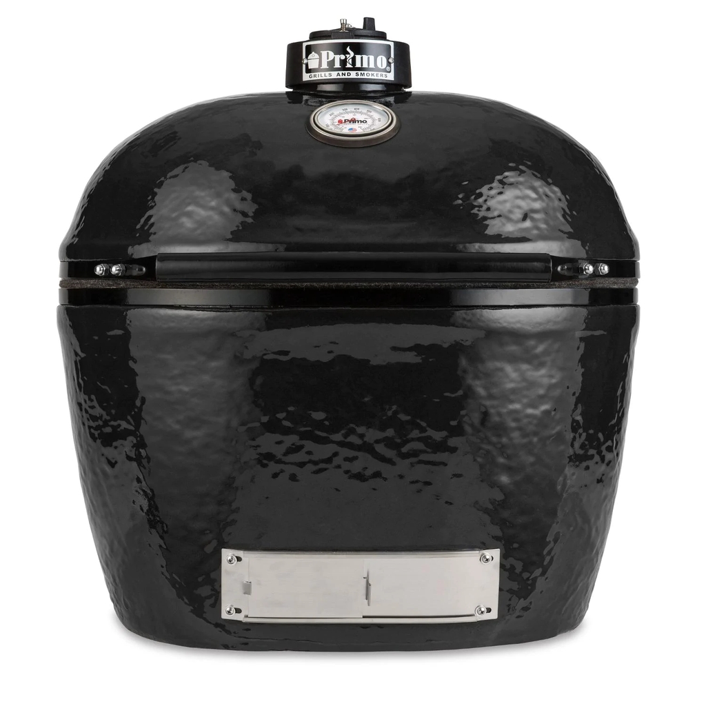 Choose Primo and experience the best in kamado style charcoal cooking. The Primo Oval XL Charcoal Smoker Grill is an extra large sized grill and one of the biggest ceramic cookers on the market. The distinct shape of the Oval XL allows you to cook using direct or indirect heat, expanding your grilling options unlike any other kamado-style grill. This grill features easy to clean and reversible porcelain-coated cooking grates, as well as one of the highest sitting lids which is great for cooking whole chickens or turkeys. This kamado style grill is made in the USA, unlike its competition, and constructed with premium grade Primo SuperCeramics and coated with a protective, lead-free, and scratch-resistant porcelain glaze. The patented Primo Oval XL efficiently retains and evenly distributes heat across the 400 square inches of cooking surface, perfect for maintaining a consistent temperature. Smoke meat at temperatures as low as 180 degrees Fahrenheit, or turn up the heat to more than 500 degrees Fahrenheit for searing and grilling. Use the cast iron chimney cap, stainless steel lower vent door, and easy to read thermometer for monitoring and keeping a precise temperature. The easy lift-and-lock hinge system keeps the lid raised in place, and the soft-close felt gasket protects the ceramic while opening and closing the lid using the cool touch handle. The powder-coated steel cart with side shelves made from high quality marine grade HDPE materials resists rusting and the wire basket is perfect for storing charcoal or other accessories. The side tables extend your work area, allowing you to keep ingredients nearby and offer two cup holders for keeping drinks nearby. Four heavy-duty swivel casters roll smoothly on any patio surface and lock in place when you are ready to grill. The variety of accessories available, along with the unique oval shape, allows flexibility in cooking a never ending list of delicious meals. Choosing a Primo kamado style grill is a decision you will never regret.