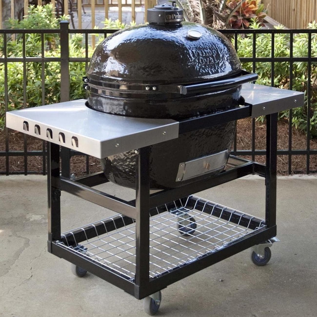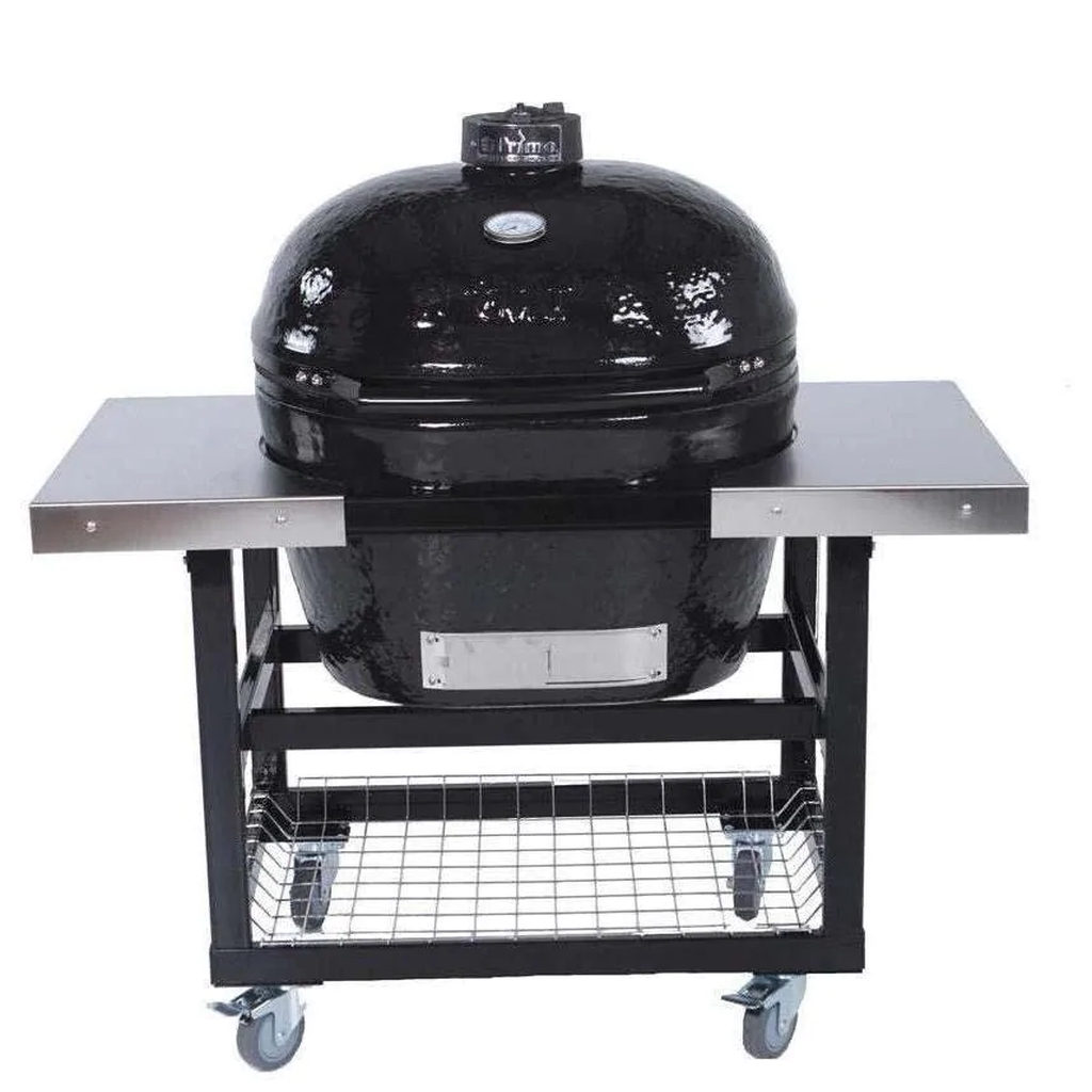 Choose Primo and experience the best in kamado style charcoal cooking. The Primo Oval XL Charcoal Smoker Grill is an extra large sized grill and one of the biggest ceramic cookers on the market. The distinct shape of the Oval XL allows you to cook using direct or indirect heat, expanding your grilling options unlike any other kamado-style grill. This grill features easy to clean and reversible stainless steel cooking grates, as well as one of the highest sitting lids which is great for cooking whole chickens or turkeys. This kamado style grill is made in the USA, unlike its competition, and constructed with premium grade Primo SuperCeramics and coated with a protective, lead-free, and scratch-resistant porcelain glaze. The patented Primo Oval XL efficiently retains and evenly distributes heat across the 400 square inches of cooking surface, perfect for maintaining a consistent temperature. Smoke meat at temperatures as low as 180 degrees Fahrenheit, or turn up the heat to more than 500 degrees Fahrenheit for searing and grilling. Use the cast iron chimney cap, stainless steel lower vent door, and easy to read thermometer for monitoring and keeping a precise temperature. The easy lift-and-lock hinge system keeps the lid raised in place, and the soft-close felt gasket protects the ceramic while opening and closing the lid using the cool touch handle. The powder-coated steel cart with stainless steel side shelves resists rusting, and the wire basket is perfect for storing charcoal or other accessories. The side tables extend your work area, allowing you to keep ingredients nearby and the hooks on each shelf provide storage for grilling tools. Four heavy-duty swivel casters roll smoothly on any patio surface and lock in place when you are ready to grill. The variety of accessories available, along with the unique oval shape, allows flexibility in cooking a never ending list of delicious meals. Choosing a Primo kamado style grill is a decision you will never regret.