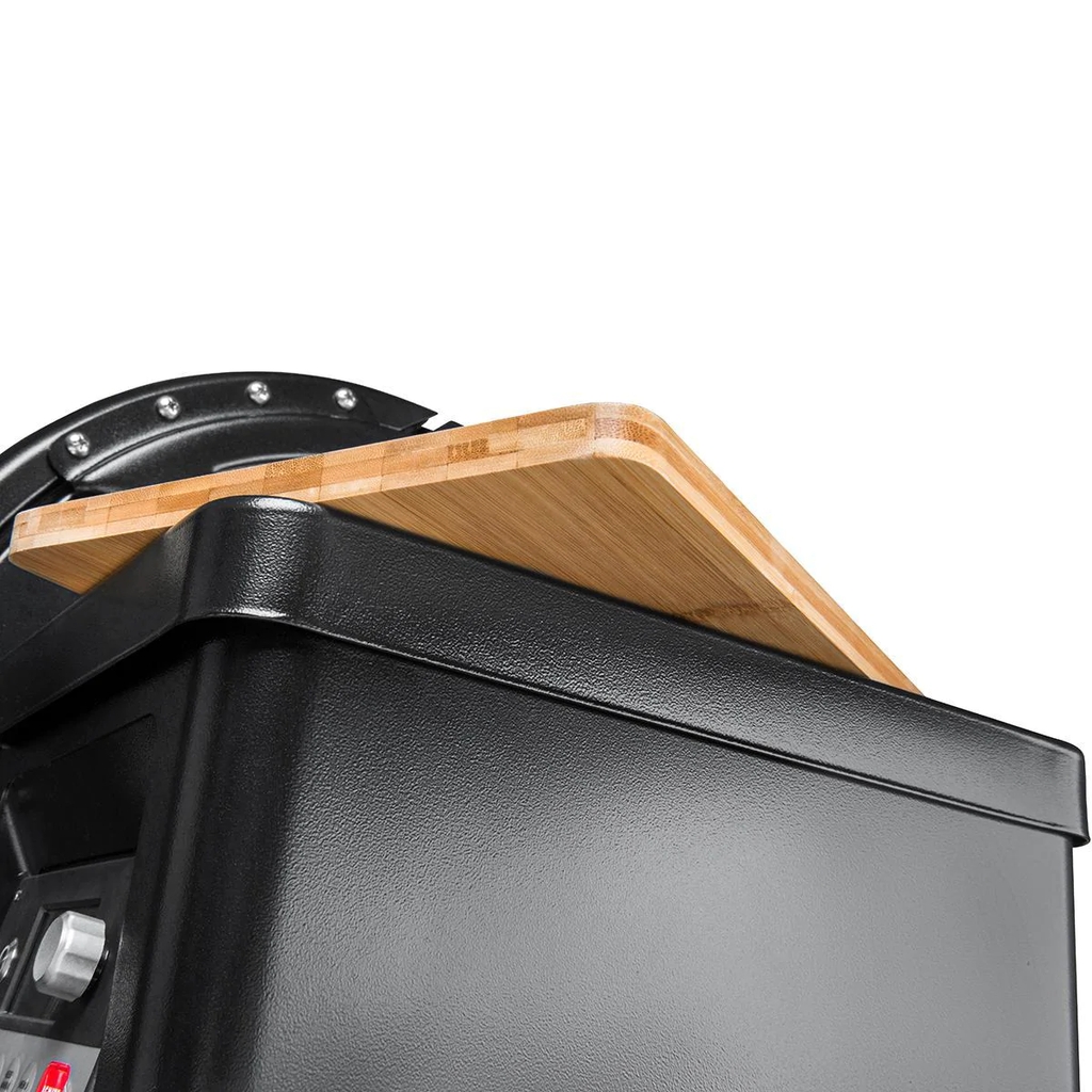 Join the Hall of Flame with the Traeger Timberline 1300. Grill more food and enjoy more versatility with 1300 square inches of cooking area over three tiers of dual-position stainless steel cooking grids. The bottom cooking grate can be lowered for searing juicy steaks, or raised for grilling. Cook up to 38 burgers, 6 chickens, 54 hot dogs or 9 rib racks 20% faster and with more smoky flavor than ever thanks to the TRU Convection system and Traeger Downdraft Exhaust system, fully circulating fresh blue smoke using a built-in induction fan. The Timberline features a double-walled 304 stainless steel interior and airtight lid gasket to insulate and maintain heat for unbeatable temperature control from 165-500 degrees Fahrenheit. An easy to use control panel & digital display gives you full control with a navigation dial and dedicated buttons for creating custom cook cycles and quick access to handy functions like keep warm mode and Super Smoke Mode, amping up the flavor with the push of a button. Tired of babysitting your grill? Try out the WiFIRE controller to change the temperature, set timers, and access thousands of Traeger recipes using the Traeger app and your smart phone (available for iOS & Android devices). The WiFire controller is also compatible with Google Home and Amazon Alexa enabled devices, allowing you to control grilling temperatures, monitor internal temperature of food, set timers and create alerts using voice commands. The included meat probe stores above the control panel for quick access, easily connecting to a dedicated control panel port for precise monitoring. There’s no shortage of food prep convenience with a stainless steel side shelf with BBQ tool hooks, a full-length stainless steel front-shelf and a magnetic bamboo cutting board that stores above the pellet hopper. Keep the fire burning with an extra large capacity pellet hopper, holding up to 24 pounds of Traeger hardwood pellets. A pellet sensor in the hopper allows you to keep track of fuel levels using the Traeger app and alerts you when the hopper is running low. A hopper clean-out door lets you quickly empty contents for cleaning and swapping out flavors. Tucked away out of sight, is a concealed grease pan slides out for easy cleanup. The Timberline is built to outlast the competition from the ground up with a rock-solid sawhorse-style chassis, all-terrain wheels, heavy-duty locking casters and black powder coat finish.