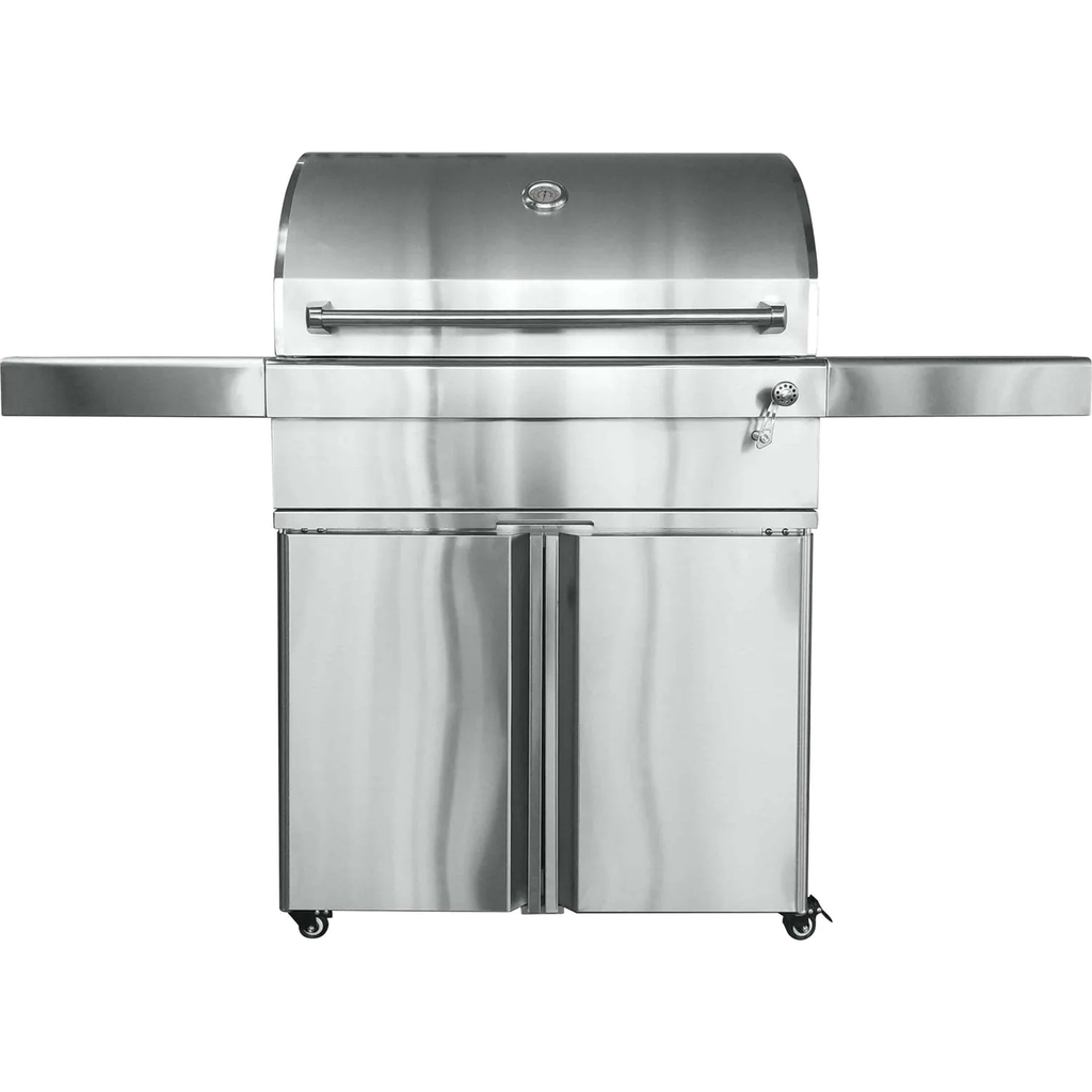 Turbo grills allow you to enjoy the luxury outdoor kitchen experience at a more economical price. The Turbo charcoal grill is designed to weather the elements with 304 stainless steel construction, ensuring years of enjoyment with proper care. This 32-inch charcoal grill offers 740 square inches of cooking space across heavy-duty stainless steel grates and a stainless steel warming rack. Precisely control and monitor grilling temperatures using the 6-inch, height-adjustable charcoal tray and a hood integrated thermometer. Cleanup is easy thanks to a slide-out ash tray. This charcoal grill includes a 304 stainless steel cart with side shelves and double access drawers for convenient storage options.
