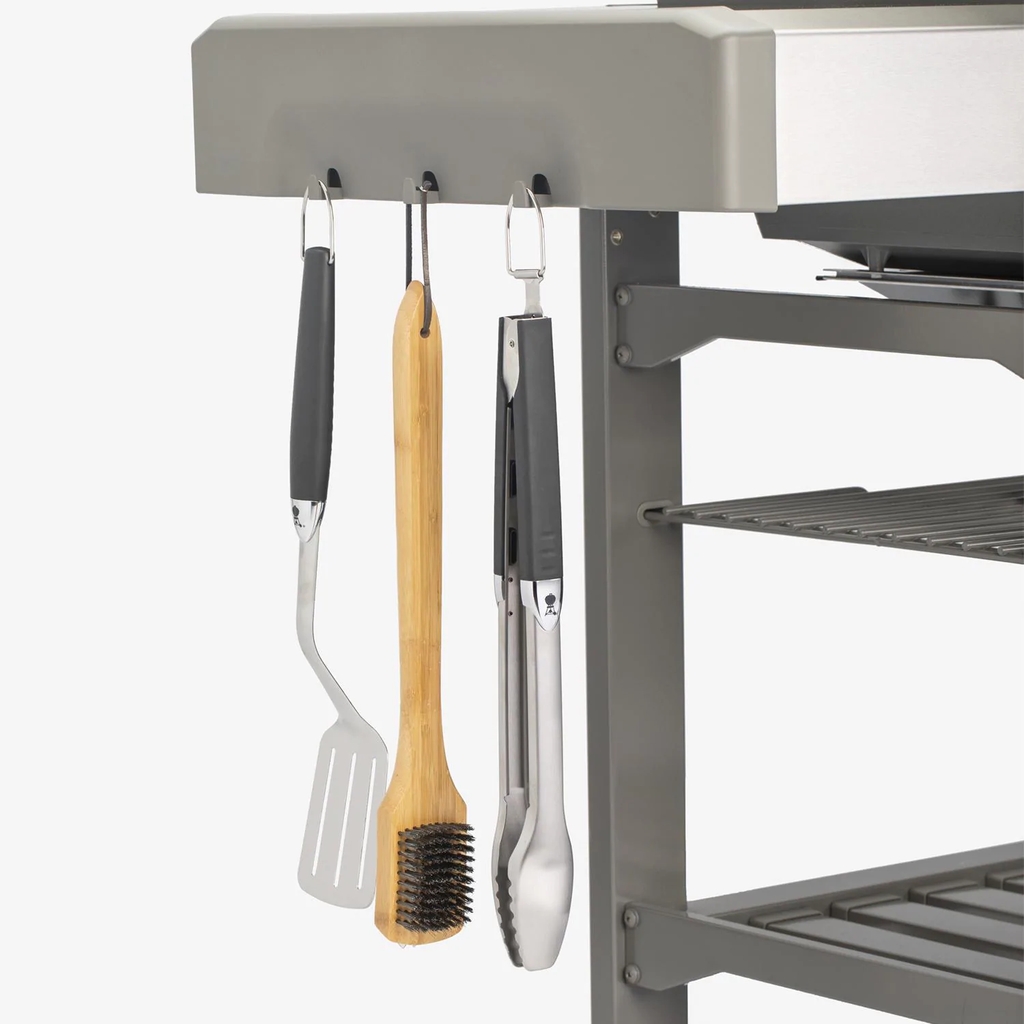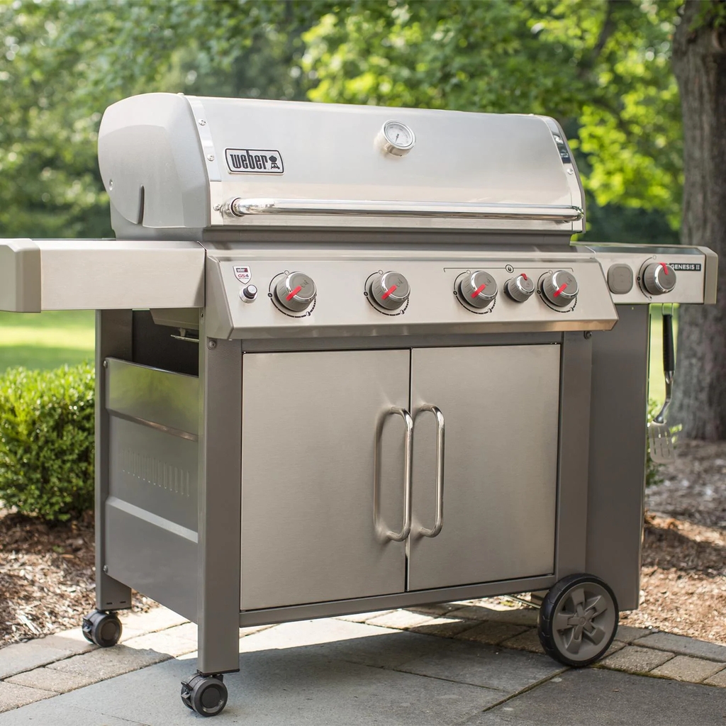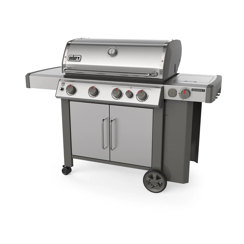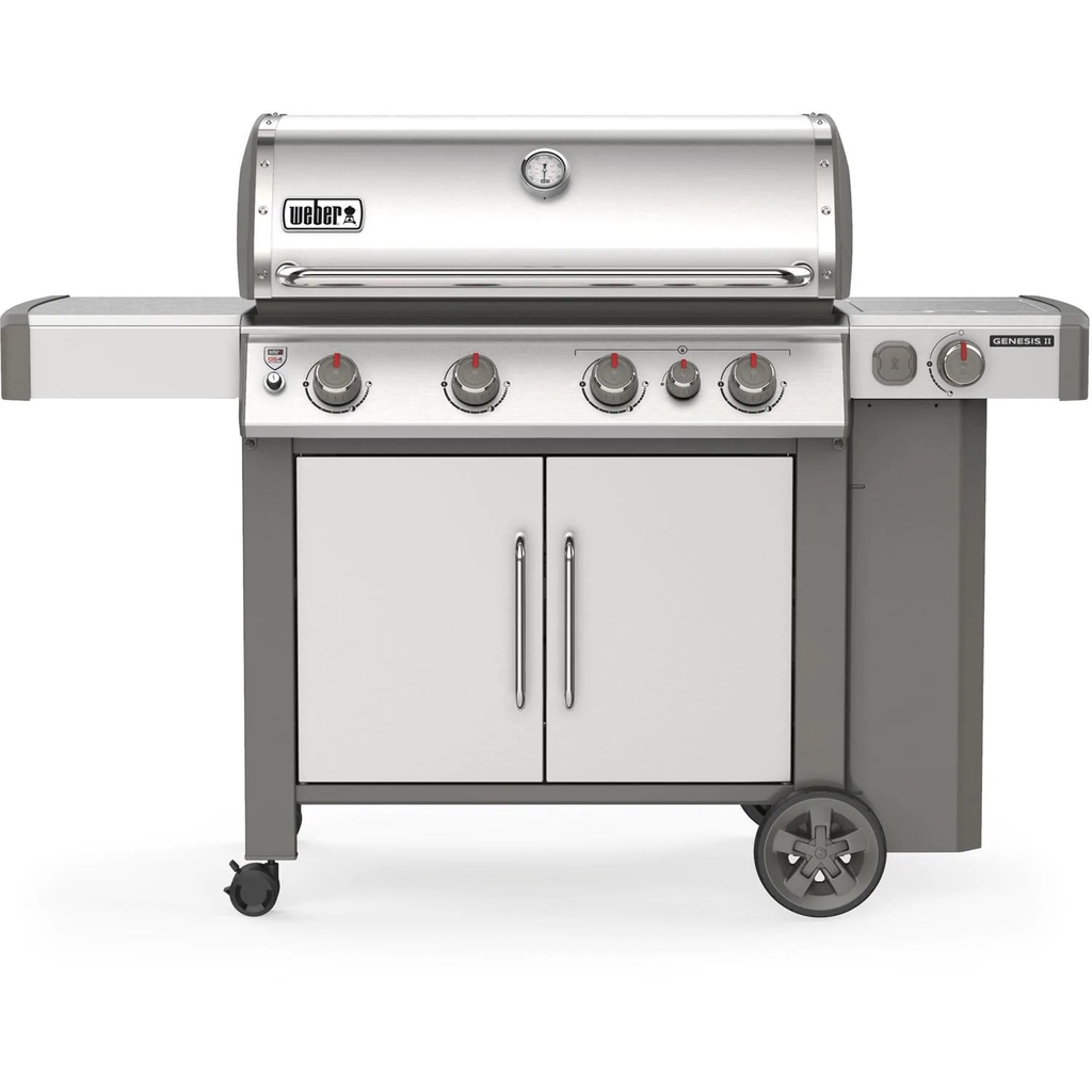 The 2019 Weber Genesis II gas grill raises the standard in backyard grilling with the GS4 high-performance grilling system, featuring continuous-spark Infinity ignition, revolutionary stainless steel high performance burners, stainless steel Flavorizer bars with flame view window and a Grease Management System. The Genesis II S-435 features a stainless steel lid and four stainless steel high-performance burners that produce 48,000 BTUs of power, a 12,000 BTU side shelf mounted side burner and a 9,000 BTU sear station burner. This grill comes fully equipped with 7mm stainless steel rod cooking grates, stainless steel flavorizer bars and stainless steel heat deflectors to effectively hold and distribute heat evenly over the 646 square-inch direct-heat cooking surface. A Tuck-Away warming rack provides an additional 198 square-inches for a generous 844 square-inches total of cooking area. This Genesis II S series grill comes iGrill 3 ready, the grill hood has a center-mounted thermometer to monitor cooking temperatures and painted cast-aluminum end caps. A convenient grease management system makes clean-up simple and a fuel gauge provides at-a-glance propane tank level checking. The welded tube-frame, closed cart design with stainless steel doors provides ample prep and storage space with two side shelves and two cart shelves. Two heavy-duty locking casters and two large wheels allow for easy and secure placement. Your BBQ grilling tools are always within reach thanks to six side shelf tool hooks.