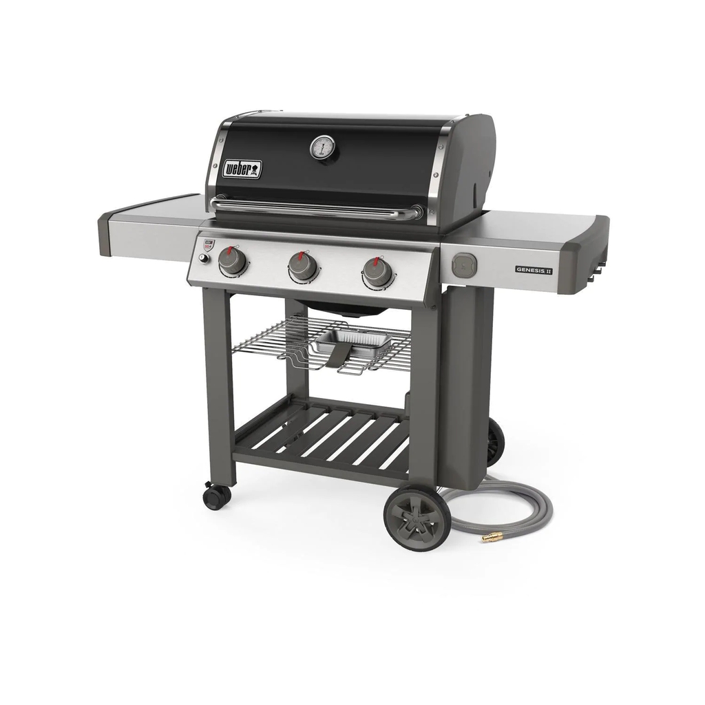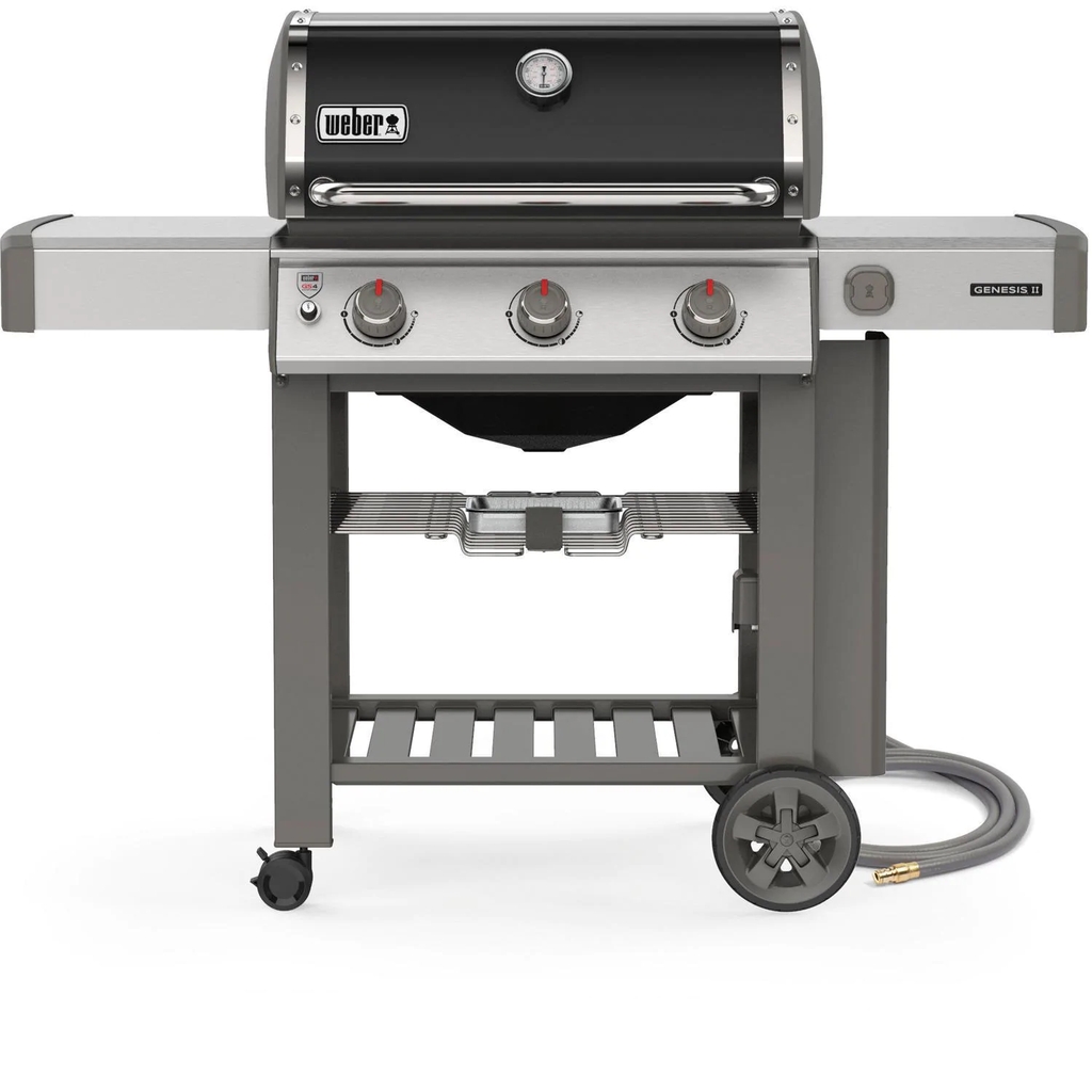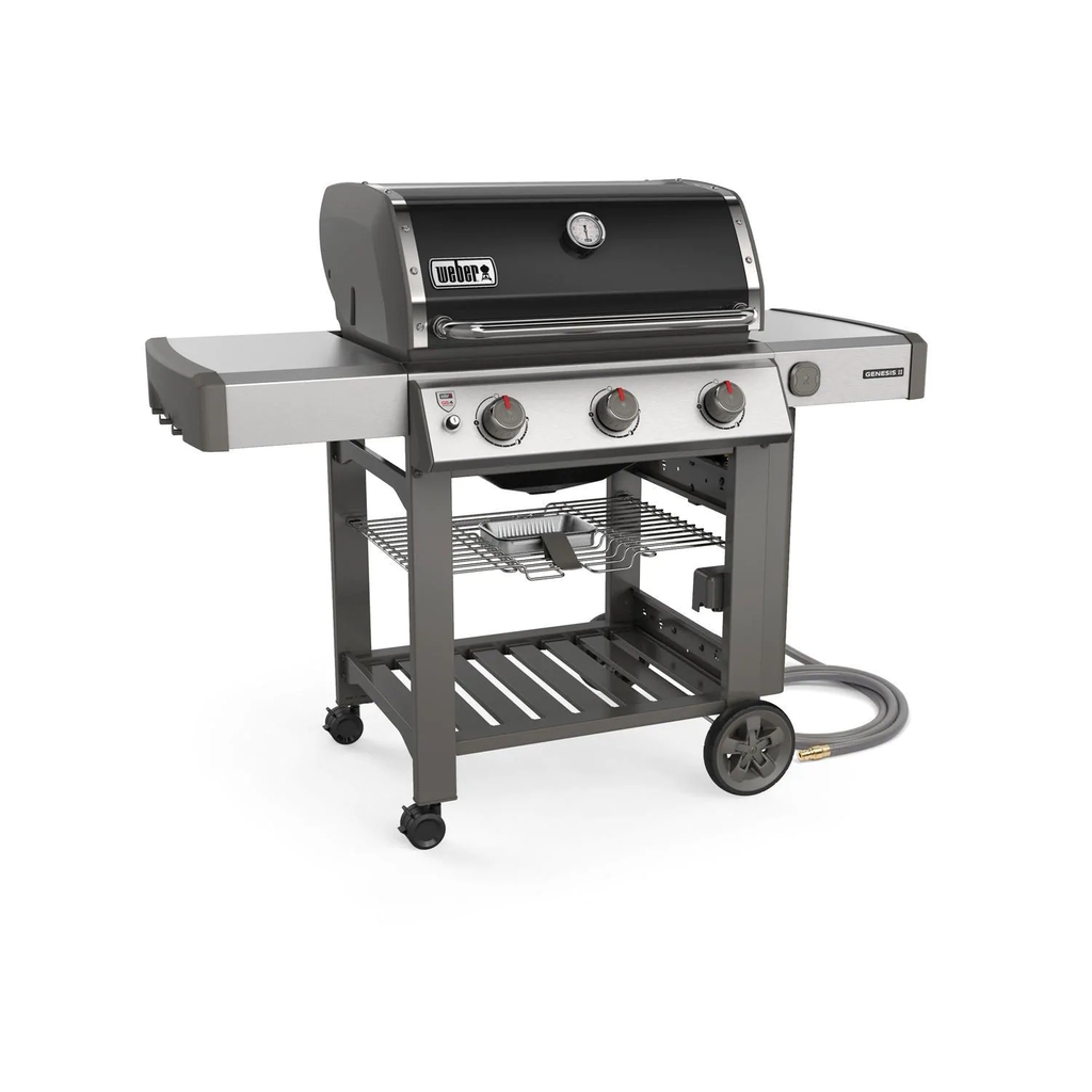 The 2019 Weber Genesis II gas grill raises the standard in backyard grilling with the GS4 high-performance grilling system, featuring continuous-spark Infinity ignition, revolutionary stainless steel high performance burners, stainless steel Flavorizer bars with flame view window and a Grease Management System. The porcelain-enameled Weber Genesis II E-310 features three stainless steel high-performance burners that produce 39,000 BTUs of power. The Genesis II E series gas grills come fully equipped with porcelain-enameled cast iron cooking grates, stainless steel Flavorizer bars and stainless steel heat deflectors to effectively hold and distribute heat evenly over the 513 square-inches of cooking grates. The Tuck-Away warming rack provides an additional 156 square-inches for a generous 669 square-inches of total cooking area. The Genesis II grills come equipped with a Grease Management System that makes clean-up as easy as possible. The black color finish porcelain-enameled hood has a center-mounted thermometer to monitor cooking temperatures and has painted cast-aluminum end caps. This Genesis II E series natural gas grill is iGrill 3 ready and includes a 10-foot flexible natural gas hose. The welded tube frame, open cart design includes two shelves below the control panel and two side shelves, providing much needed prep space and two heavy-duty locking casters and two large wheels. Six convenient built-in tool hooks keep your BBQ tools nearby.