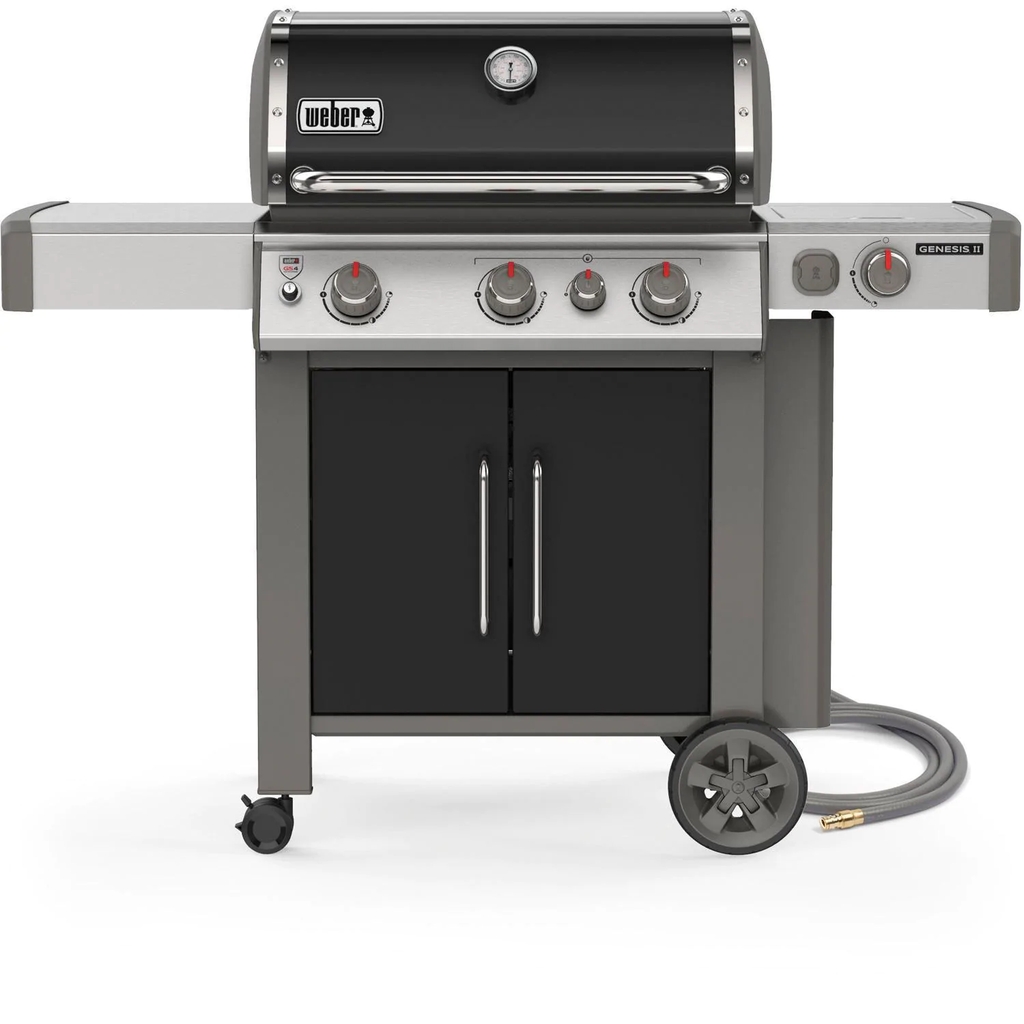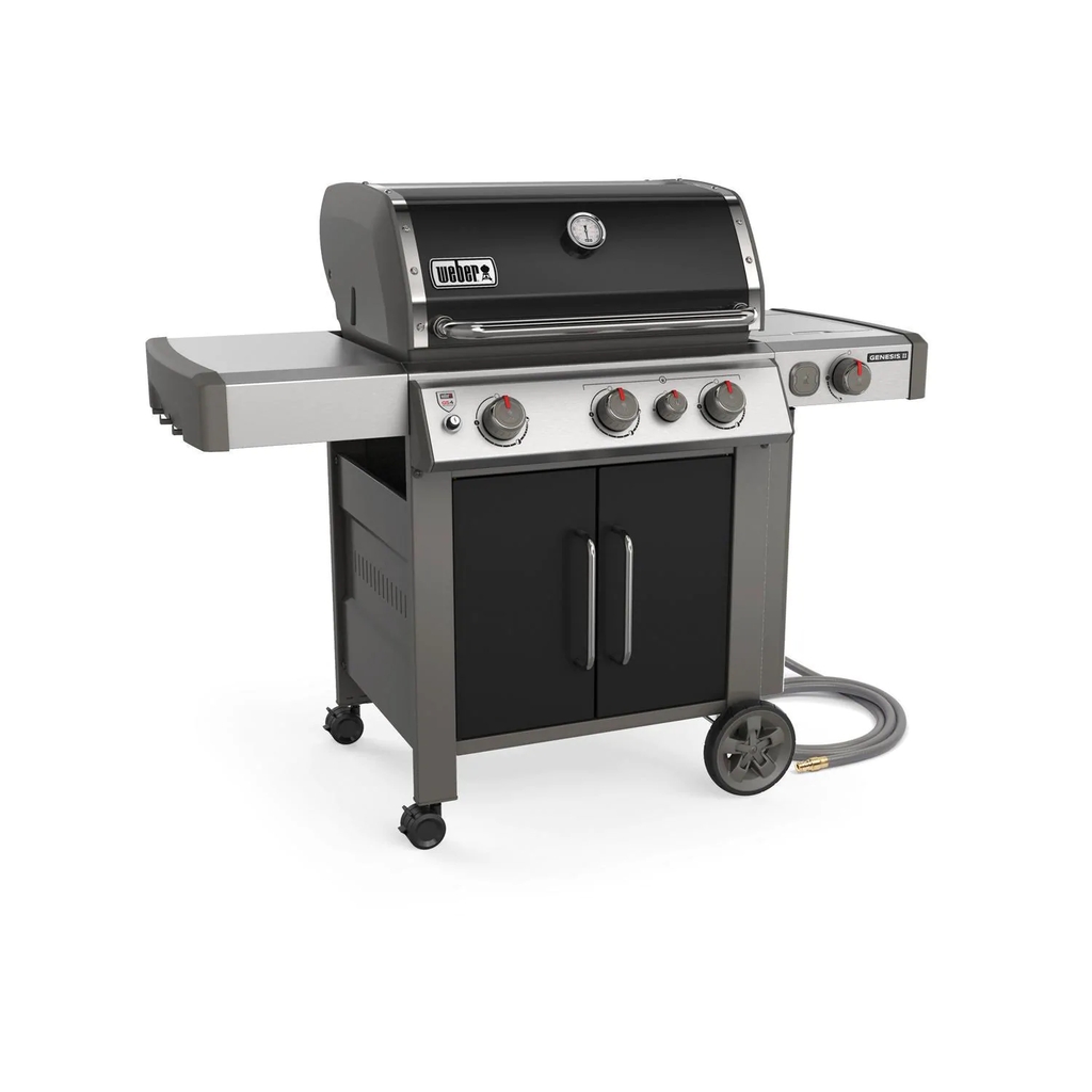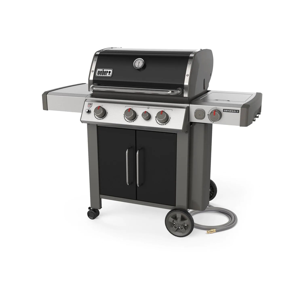 The 2019 Weber Genesis II gas grill raises the standard in backyard grilling with the GS4 high-performance grilling system, featuring continuous-spark Infinity ignition, revolutionary stainless steel high performance burners, stainless steel Flavorizer bars with flame view window and a Grease Management System. The porcelain-enameled Weber Genesis II E-335 features three stainless steel high-performance burners that produce 39,000 BTUs of power, a 12,000 BTU side shelf mounted side burner and a 9,000 BTU sear station burner. The Genesis II E series gas grills come fully equipped with porcelain-enameled cast iron cooking grates, stainless steel Flavorizer bars and stainless steel heat deflectors to effectively hold and distribute heat evenly over the 513 square-inches of cooking grates. The Tuck-Away warming rack provides an additional 156 square-inches for a generous 669 square-inches of total cooking area. The Genesis II grills come equipped with a Grease Management System that makes clean-up as easy as possible. The black color finish porcelain-enameled hood has a center-mounted thermometer to monitor cooking temperatures and has painted cast-aluminum end caps.This Genesis II E series natural gas grill is iGrill 3 ready and includes a 10-foot flexible natural gas hose. The welded tube frame, closed cart design with painted steel doors includes two shelves below the control panel and two side shelves, providing much needed prep space and two heavy-duty locking casters and two large wheels. Six convenient built-in tool hooks keep your BBQ tools nearby.