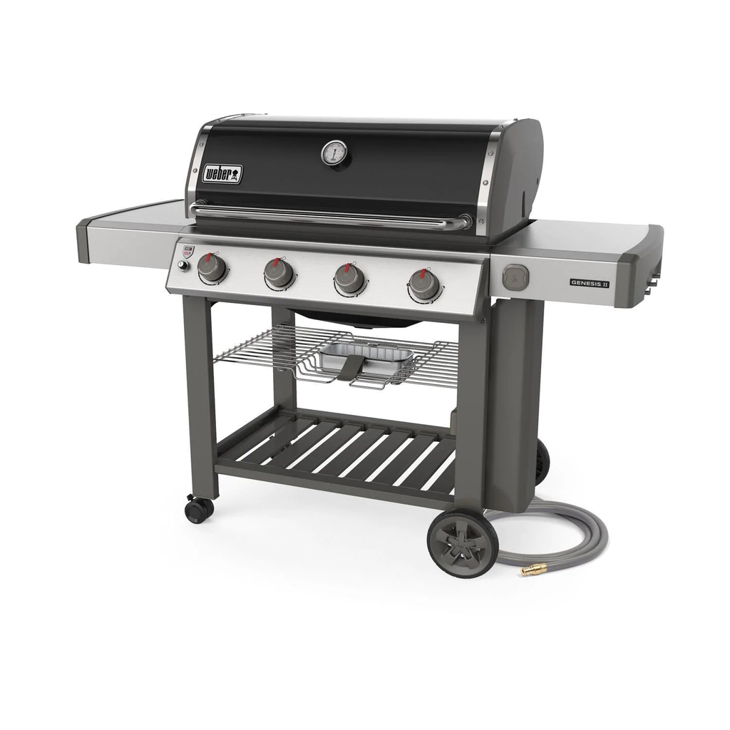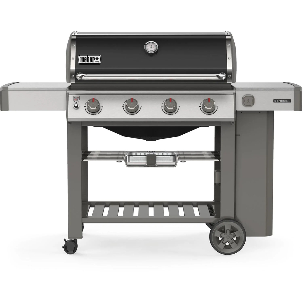 The 2019 Weber Genesis II gas grill raises the standard in backyard grilling with the GS4 high-performance grilling system, featuring continuous-spark Infinity ignition, revolutionary stainless steel high performance burners, stainless steel Flavorizer bars with flame view window and a Grease Management System. The porcelain-enameled Weber Genesis II E-410 features four stainless steel high-performance burners that produce 48,000 BTUs of power. The Genesis II E series gas grills come fully equipped with porcelain-enameled cast iron cooking grates, stainless steel Flavorizer bars and stainless steel heat deflectors to effectively hold and distribute heat evenly over the 646 square-inches of cooking grates. The Tuck-Away warming rack provides an additional 198 square-inches for a generous 844 square-inches of total cooking area. The Genesis II grills come equipped with a Grease Management System that makes clean-up as easy as possible. The black color finish porcelain-enameled hood has a center-mounted thermometer to monitor cooking temperatures and has painted cast-aluminum end caps. The Genesis II E series grills are iGrill 3 ready and feature a fuel gauge on propane gas models. The welded tube frame, open cart design includes two shelves below the control panel and two side shelves, providing much needed prep space and two heavy-duty locking casters and two large wheels. The propane tank is stored to the side, freeing up the shelf space under the grill and has a tank shield that keeps the tank out of view. Six convenient built-in tool hooks keep your BBQ tools nearby.