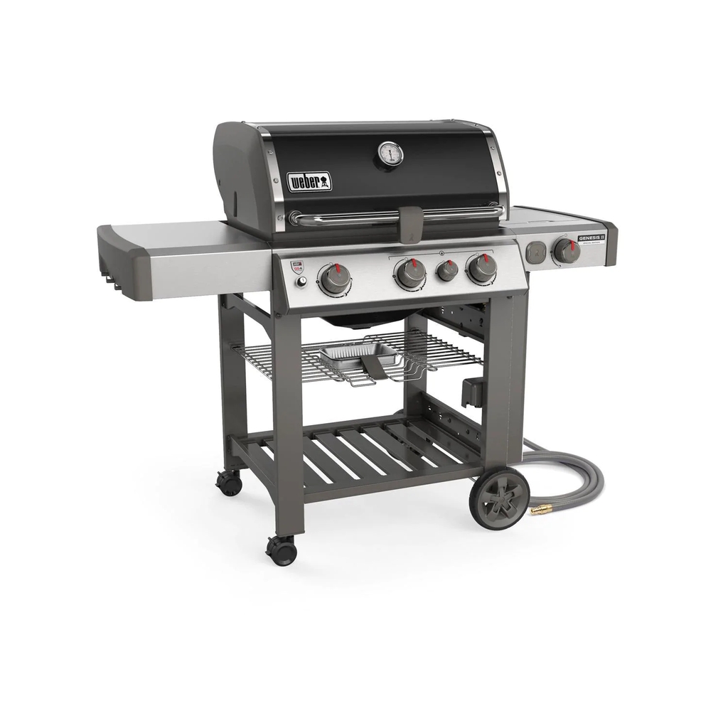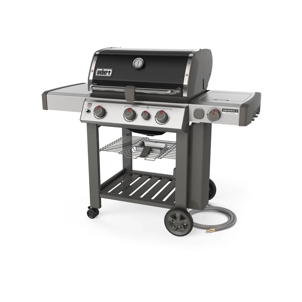 The 2019 Weber Genesis II gas grill raises the standard in backyard grilling with the GS4 high-performance grilling system, featuring continuous-spark Infinity ignition, revolutionary stainless steel high performance burners, stainless steel Flavorizer bars with flame view window and a Grease Management System. The Special Edition Weber Genesis II SE-330 features three stainless steel high-performance burners that produce 39,000 BTUs of power, a 12,000 BTU side shelf mounted side burner and a 9,000 BTU sear station burner. The Genesis II SE series gas grills come fully equipped with 9mm stainless steel rod cooking grates, stainless steel Flavorizer bars and stainless steel heat deflectors to effectively hold and distribute heat evenly over the 513 square-inches of cooking grates. The Tuck-Away warming rack provides an additional 156 square-inches for a generous 669 square-inches of total cooking area. The Genesis II grills come equipped with a Grease Management System that makes clean-up as easy as possible. The black color finish porcelain-enameled hood has a center-mounted thermometer to monitor cooking temperatures and has painted cast-aluminum end caps. This iGrill 3-ready Genesis II SE grill features a motion-activated, handle-mounted light for added visibility during night-time grilling and includes a 10-foot flexible natural gas hose. The welded tube frame, open cart design includes two shelves below the control panel and two side shelves, providing much needed prep space and two heavy-duty locking casters and two large wheels. Six convenient built-in tool hooks keep your BBQ tools nearby.