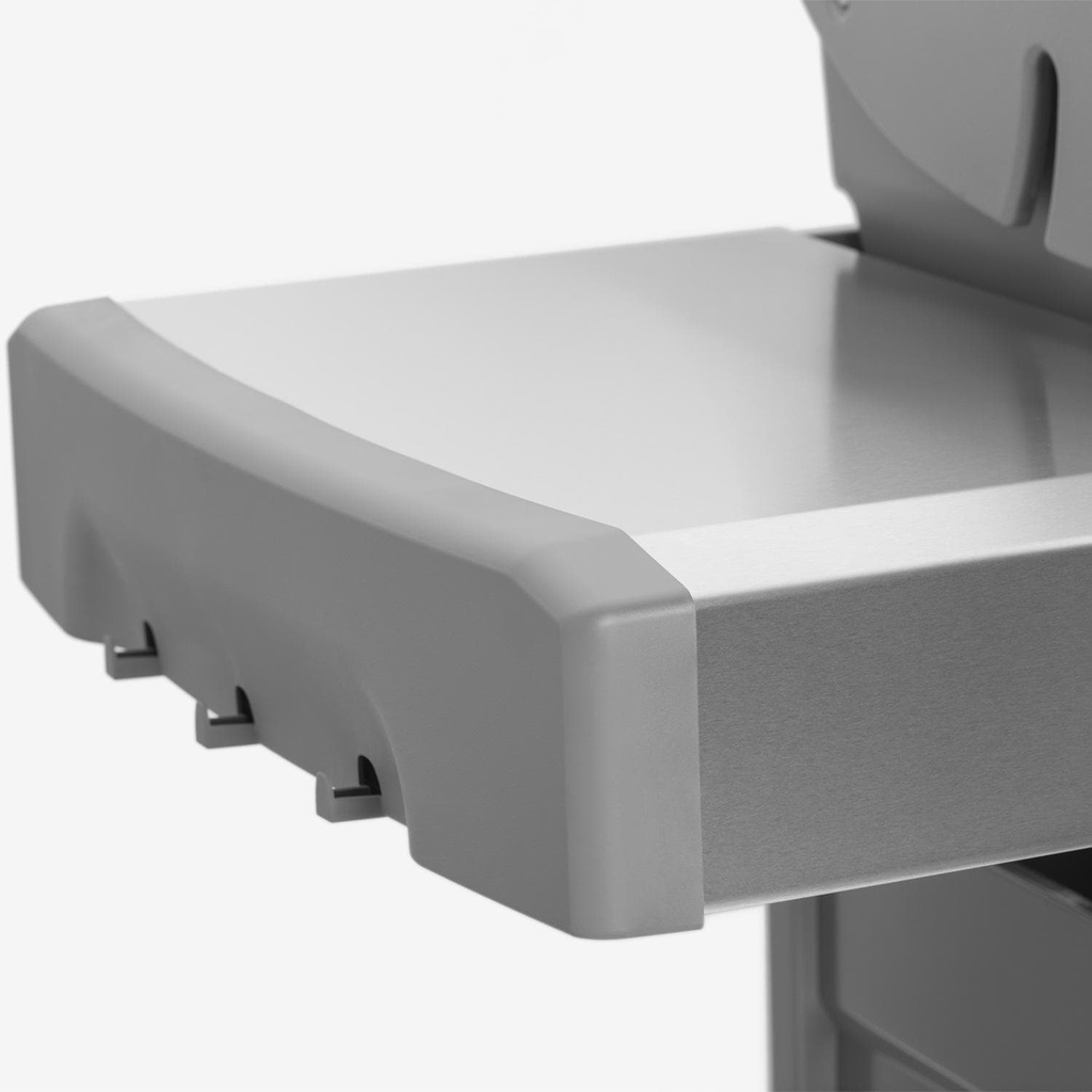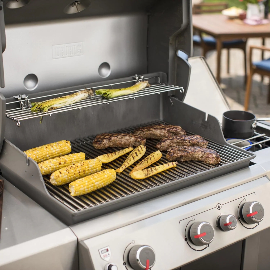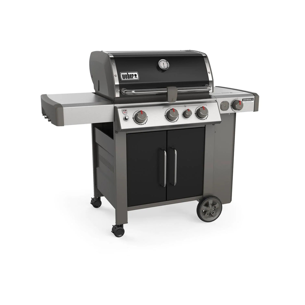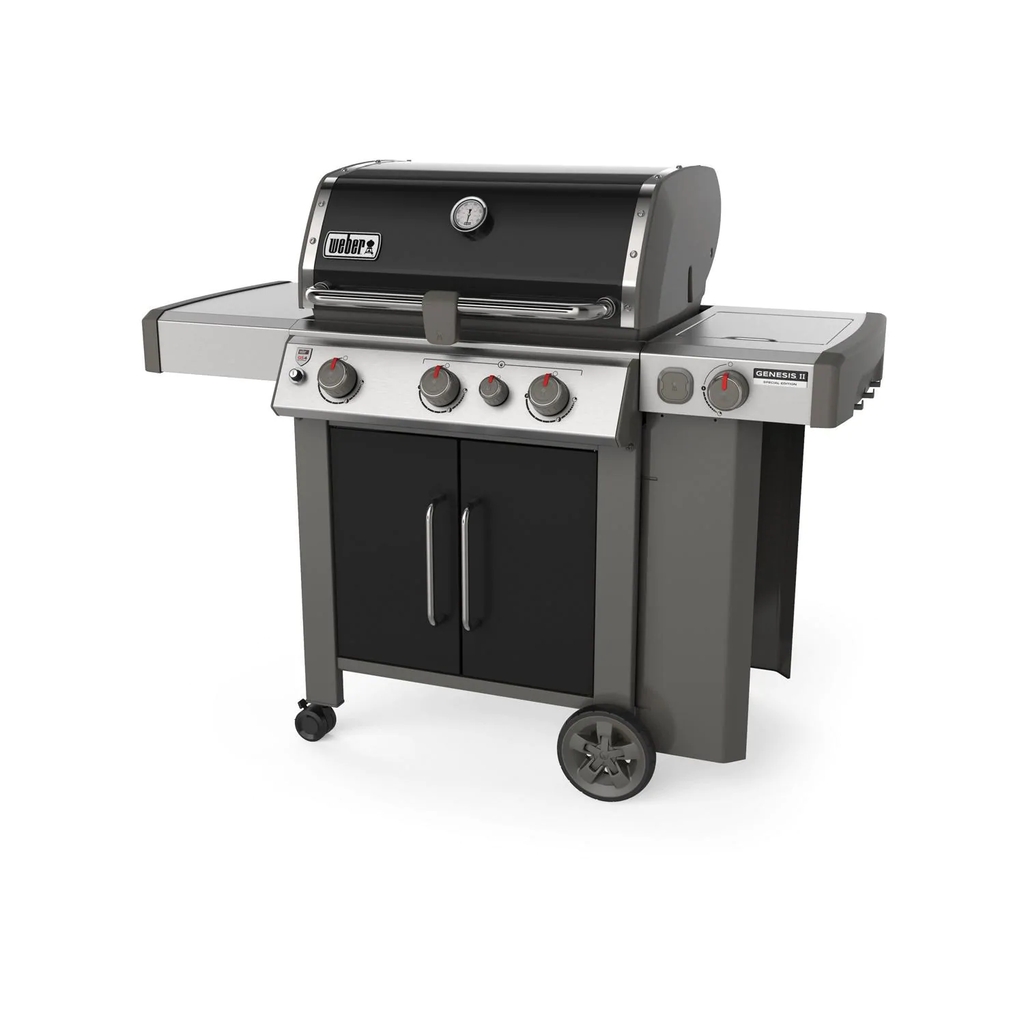 The 2019 Weber Genesis II gas grill raises the standard in backyard grilling with the GS4 high-performance grilling system, featuring continuous-spark Infinity ignition, revolutionary stainless steel high performance burners, stainless steel Flavorizer bars with flame view window and a Grease Management System. The Special Edition Weber Genesis II SE-335 features three stainless steel high-performance burners that produce 39,000 BTUs of power, a 12,000 BTU side shelf mounted side burner and a 9,000 BTU sear station burner. The Genesis II SE series gas grills come fully equipped with 9mm stainless steel rod cooking grates, stainless steel Flavorizer bars and stainless steel heat deflectors to effectively hold and distribute heat evenly over the 513 square-inches of cooking grates. The Tuck-Away warming rack provides an additional 156 square-inches for a generous 669 square-inches of total cooking area. The Genesis II grills come equipped with a Grease Management System that makes clean-up as easy as possible. The black color finish porcelain-enameled hood has a center-mounted thermometer to monitor cooking temperatures and has painted cast-aluminum end caps. The iGrill 3-ready Genesis II SE grills feature a motion-activated, handle-mounted light for added visibility during night-time grilling and a fuel gauge on propane gas models. The welded tube frame, closed cart design with painted steel doors includes two shelves below the control panel and two side shelves, providing much needed prep space and two heavy-duty locking casters and two large wheels. The propane tank is stored to the side, freeing up the shelf space under the grill and has a tank shield that keeps the tank out of view. Six convenient built-in tool hooks keep your BBQ tools nearby.