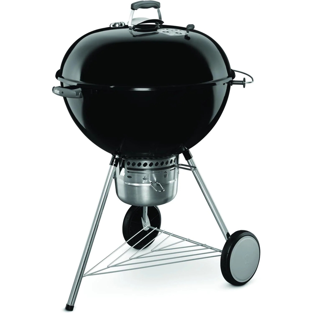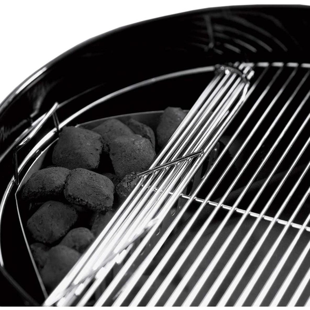 Experience the charcoal revolution that started it all with a Weber kettle-style BBQ grill! Weber combines traditional, iconic design with innovation in production in this grill that is large enough to feed the neighborhood! Made of premium-grade U. S. Steel coated with porcelain enamel inside and out, the bowl and lid of the Weber Original Premium charcoal grill are precisely formed to allow heat to circulate evenly inside the grill and across the vast 508 square inches of cooking area. The black porcelain-enamel coating is baked on, fusing the finish to the steel to prevent rusting and peeling through years of use. The aluminized steel Original cleaning system makes clean-up hassle free. As you rotate the handle, three blades in the bowl move ash through the vents and down into the removable, high-capacity aluminum ash catcher below, which is enclosed to prevent ashes from blowing away and creating a mess. Only the unburned coals remain in the bowl and can be re-lit for your next barbecue, which helps you save money on fuel. With this versatile Weber Original Kettle Premium grill, you have the option of direct or indirect cooking by using the two included Char-Basket charcoal fuel holders in various positions. The adjustable, no-rust aluminum top vent provides the proper airflow needed for perfect grilling and, along with the built-in thermometer, helps you to control the temperature inside the grill. This Weber Original Premium grill also features a hinged stainless steel cooking grate, for easily adding more charcoal, two glass-reinforced nylon handles that will withstand the elements for the life of the grill, one of which has built-in tool hooks, and a Tuck-Away lid holder that conveniently allows you to store the lid while you grill. Aluminum legs elevate the grill to an ideal height for grilling and two durable all-weather wheels, that are virtually indestructible, make moving the grill easy. A classic, dependable design, the Weber Original Premium Kettle charcoal grill is engineered with the backyard griller in mind!