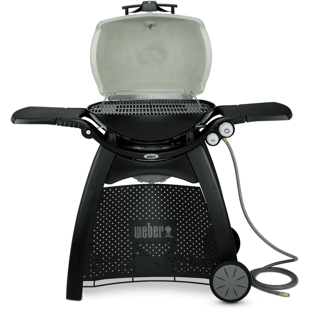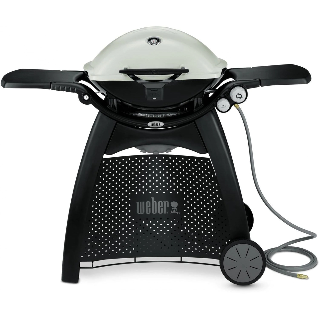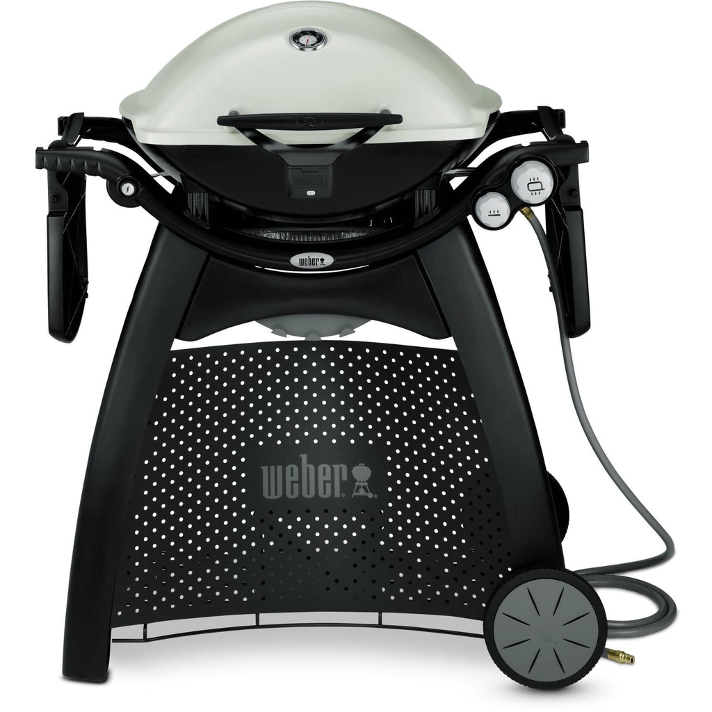 Stand up and stand out with a Weber Q 3200 BBQ grill! Compact Weber Q gas grills are perfect for tailgating or small spaces like apartment balconies. This larger version of the popular Weber Q gas grill offers 462 square inches of total cooking space, including 69 square inches on a warming rack. With the push of a button, the grill lights the two durable stainless steel burners to produce an amazing 21,700 BTUs. The infinite control burner valves allow you to set the precise temperature you need with the easy-to-use knobs. This Weber natural gas grill has a tall cast aluminum lid for larger items and has a built-in thermometer to monitor the cooking temperatures. The sturdy cart features two removable folding work tables, each with convenient tool hooks, so you have space to spread out and work and comes with a grill out handle light so you can grill at night. The Weber Q 3200 also features a two large capacity porcelain-enameled cast iron cooking grates, a cast aluminum body with drip ducts and a sturdy glass-reinforced nylon frame and handle. This Weber Q includes a removable grease catch pan for easy cleaning and a 10-foot quick disconnect flexible natural gas hose. The Weber Q recipe booklet is also included.