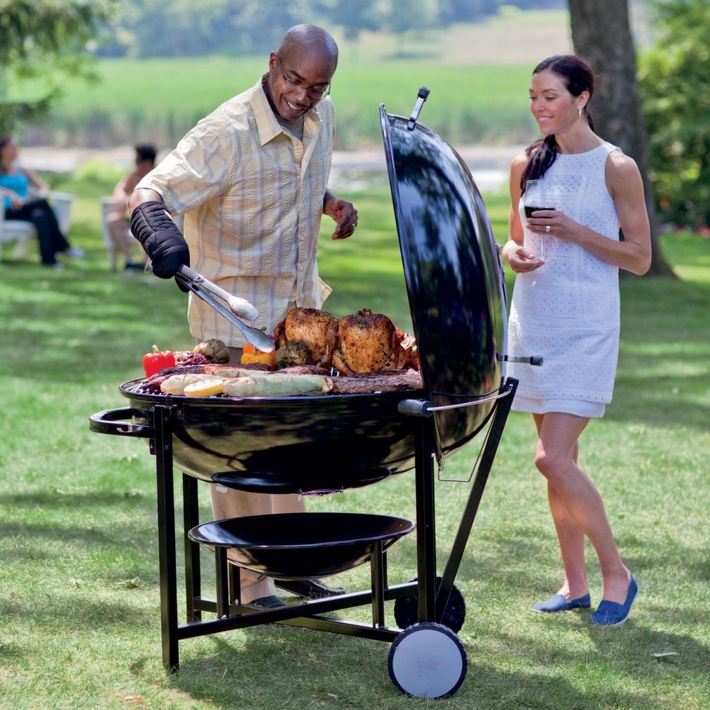 Once you see the sheer enormousness of the Ranch Kettle BBQ grill, you will understand why big is an oversized understatement. Weber combines traditional, iconic design with innovation in production in this massive grill that is large enough to cook for family reunions or other large events. Made of premium-grade U. S. Steel coated with porcelain enamel inside and out, the bowl and lid of the Weber Ranch Kettle charcoal grill are precisely formed to allow heat to circulate evenly across the huge cooking area. The black porcelain-enamel coating is baked on, fusing the finish to the steel to prevent rusting and peeling through years of use. With the versatile Ranch Kettle grill, you have the option of indirectly cooking large amounts of food by placing charcoal on one side of the grill and food on the other, which creates convection-style heat circulation. The adjustable top vent provides the proper airflow needed for perfect grilling and helps you to control the temperature inside the grill. This Weber Ranch Kettle grill also features a hinged stainless steel cooking grate, for easily adding more charcoal, two glass-reinforced nylon handles that will withstand the elements for the life of the grill, tool hooks and a Tuck-Away lid holder that conveniently allows you to store the lid while you grill. The high-capacity, porcelain-enameled ash catcher lifts out for easy ash disposal and cleaning. The heavy-duty steel cart ensures the grill is sturdy and stable, while two crackproof all-weather wheels and two locking casters make moving the grill easy. A massive take on a classic, dependable design, the Weber Ranch Kettle Charcoal Grill is designed for the griller ready to take it to the next level!